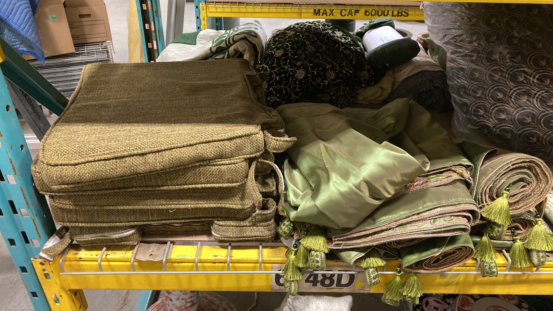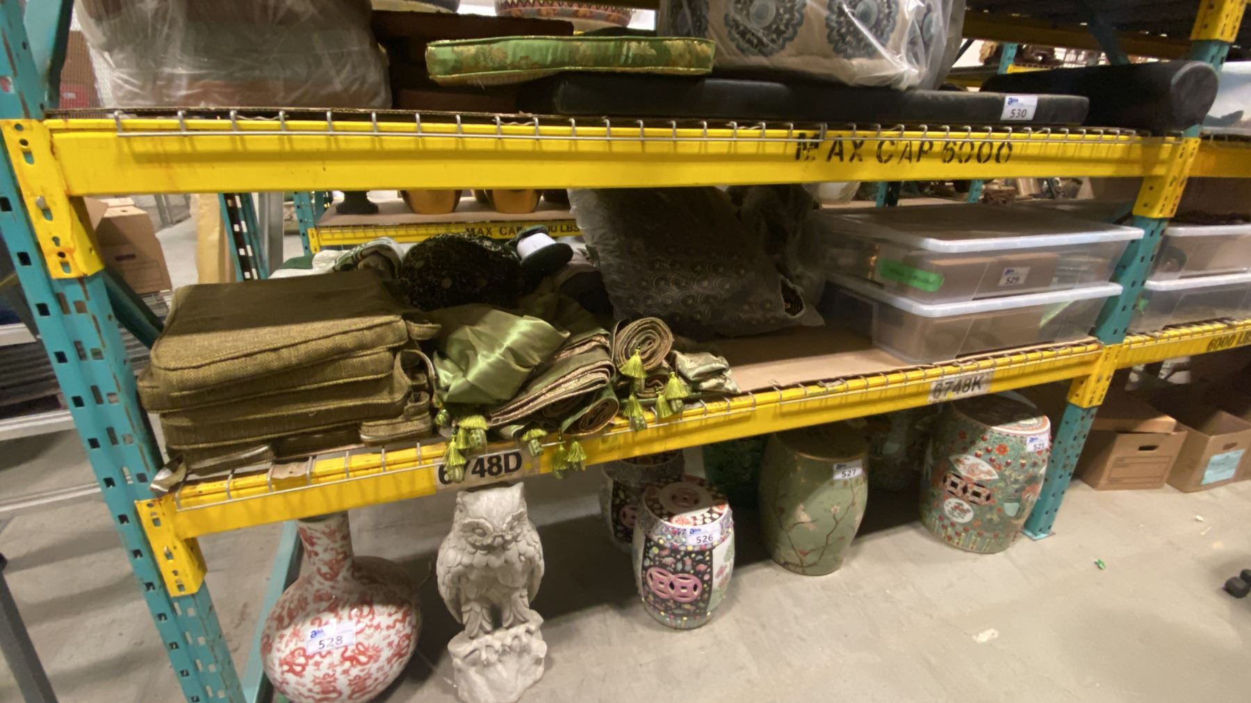 SHELF OF ASSORTED TABLE RUNNERS, CUSHIONS, CURTAIN HARDWARE, TABLECLOTHS & MORE