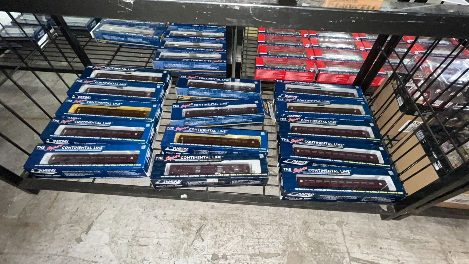 SHELF OF ASSORTED THE SUPER CONTINENTAL LINE HO SCALE MODEL TRAINS - BAGGAGE EXPRESS, LIGHTWEIGHT COACH, CAFE-BAR-LOUNGE & MORE
