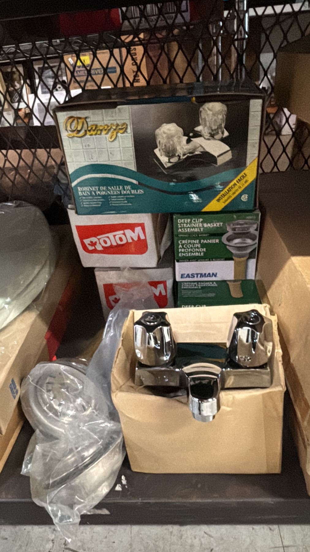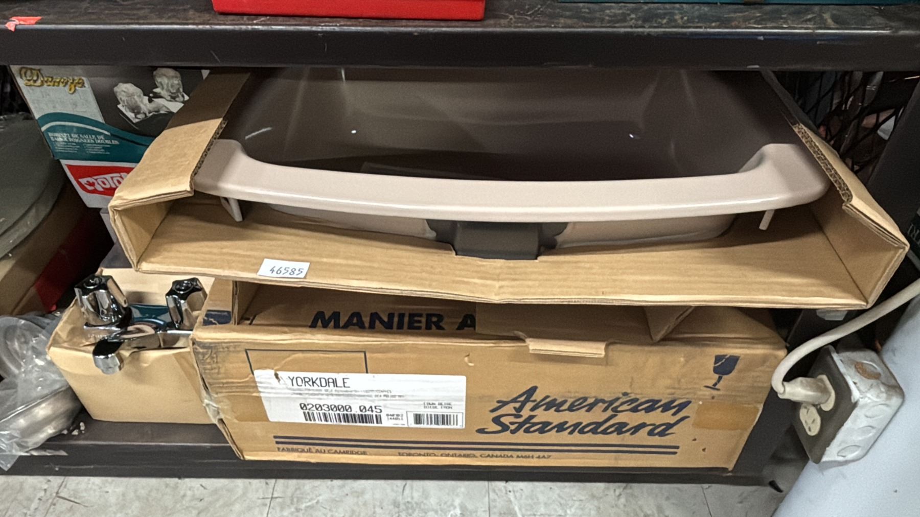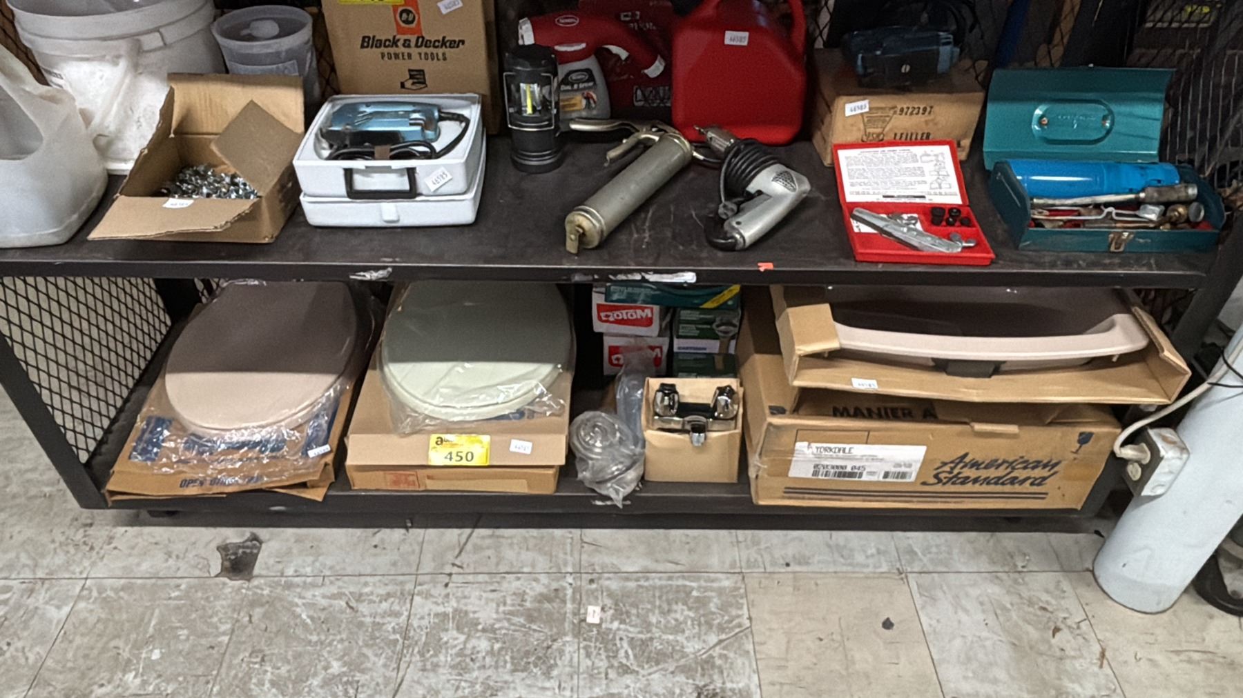 SHELF OF ASSORTED TOILET SEATS, TWO SINKS, FAUCET & ACCESSORIES