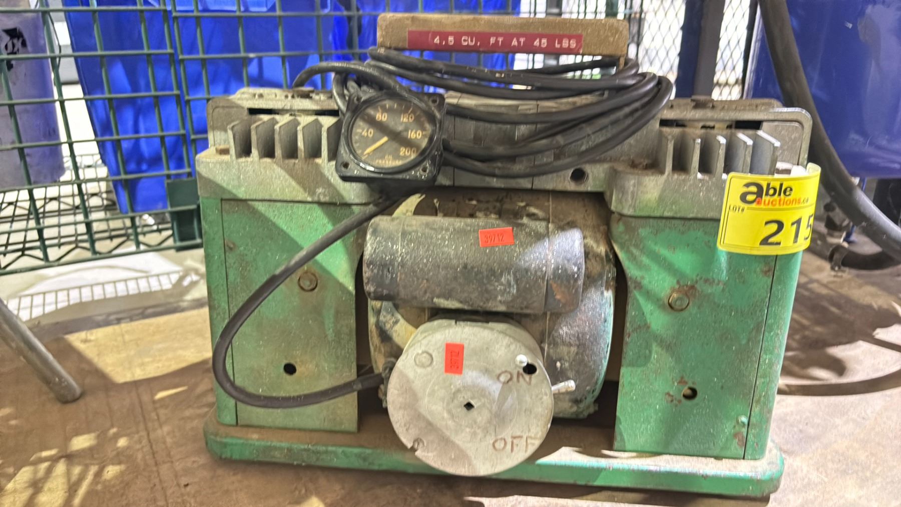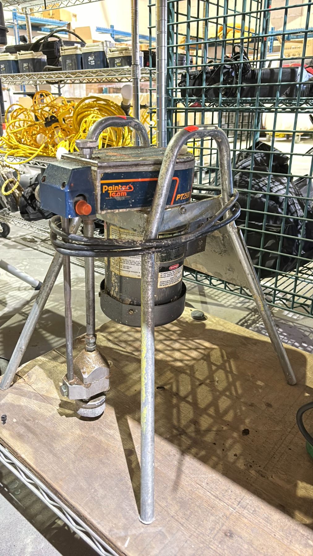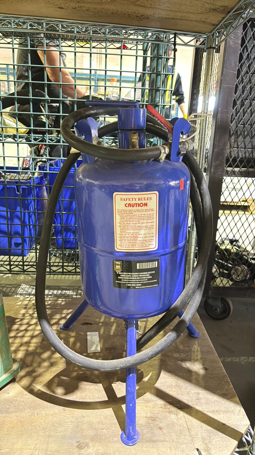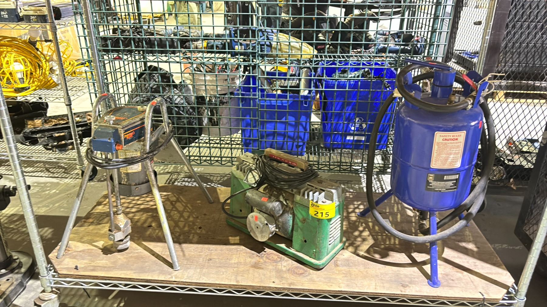 SHELF OF ASSORTED TOOLS INCLUDING; 5 GALLON PRESSURE SANDBLASTER, AIR COMPRESSOR & PAINTERS TEAM PT2500 PAINT SPRAYER
