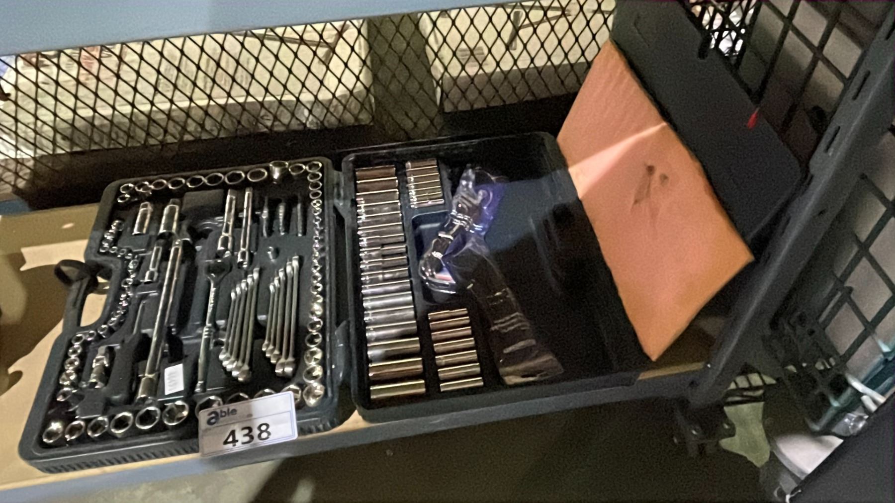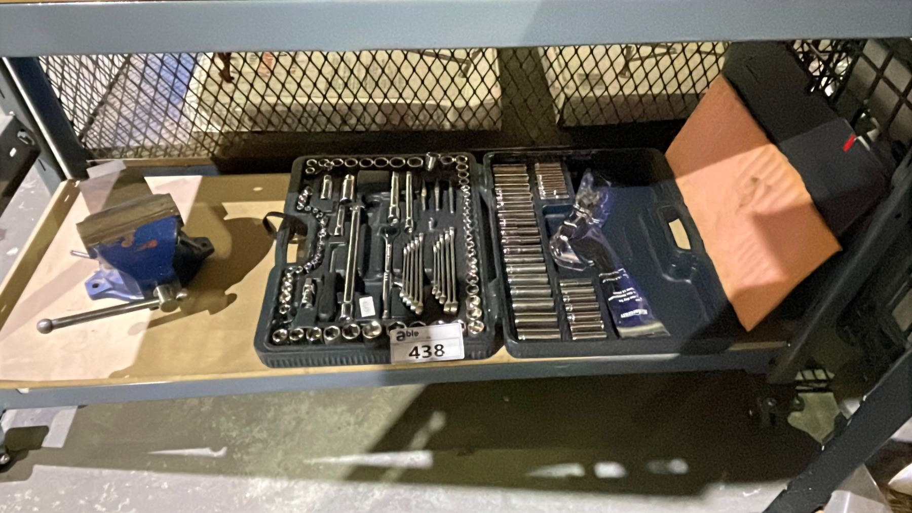 SHELF OF ASSORTED TOOLS INCLUDING; BENCH GRINDER & SOCKET SETS