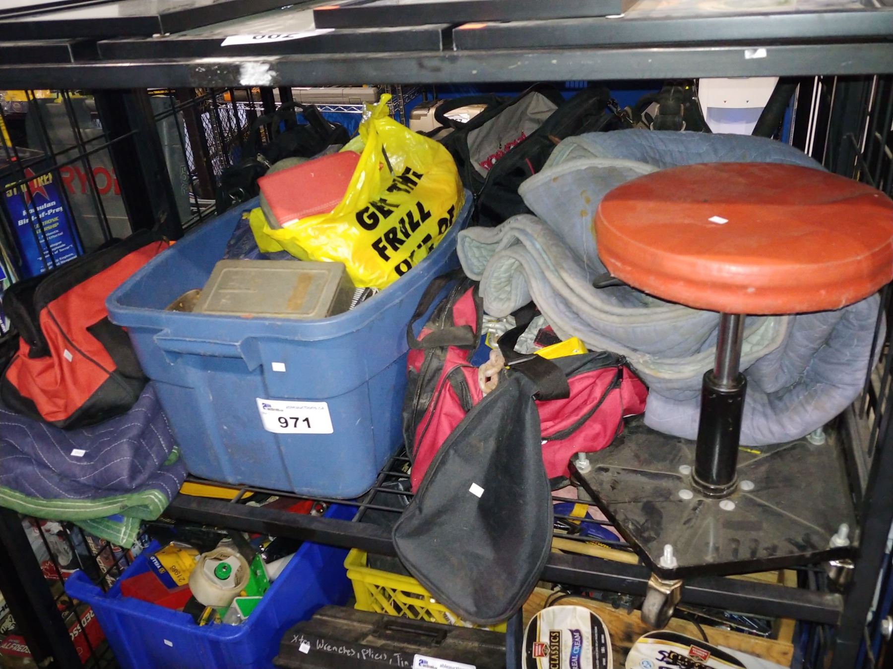 SHELF OF ASSORTED TOOLS INCLUDING CHAIN, STOOL, BAGS AND MORE
