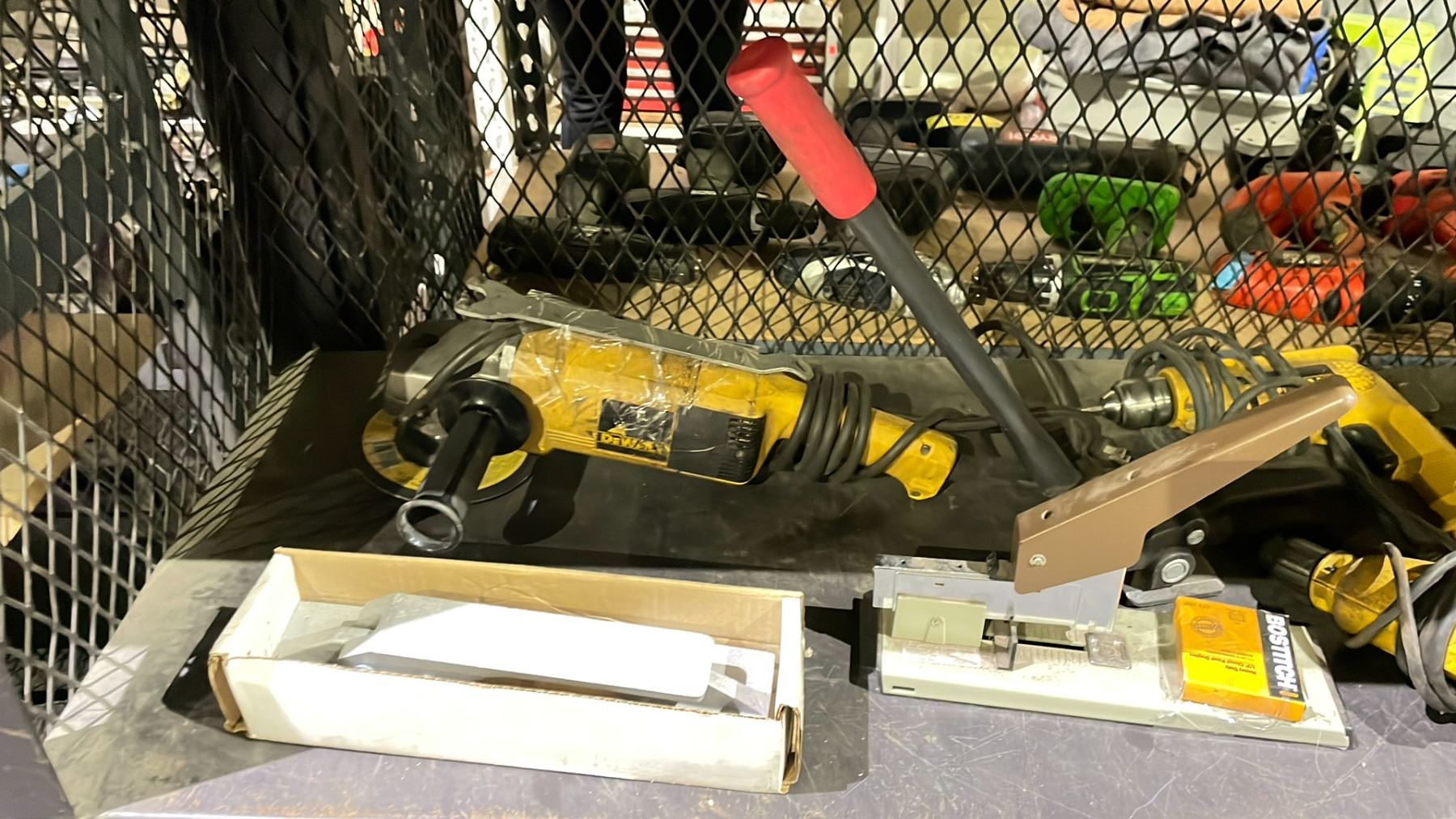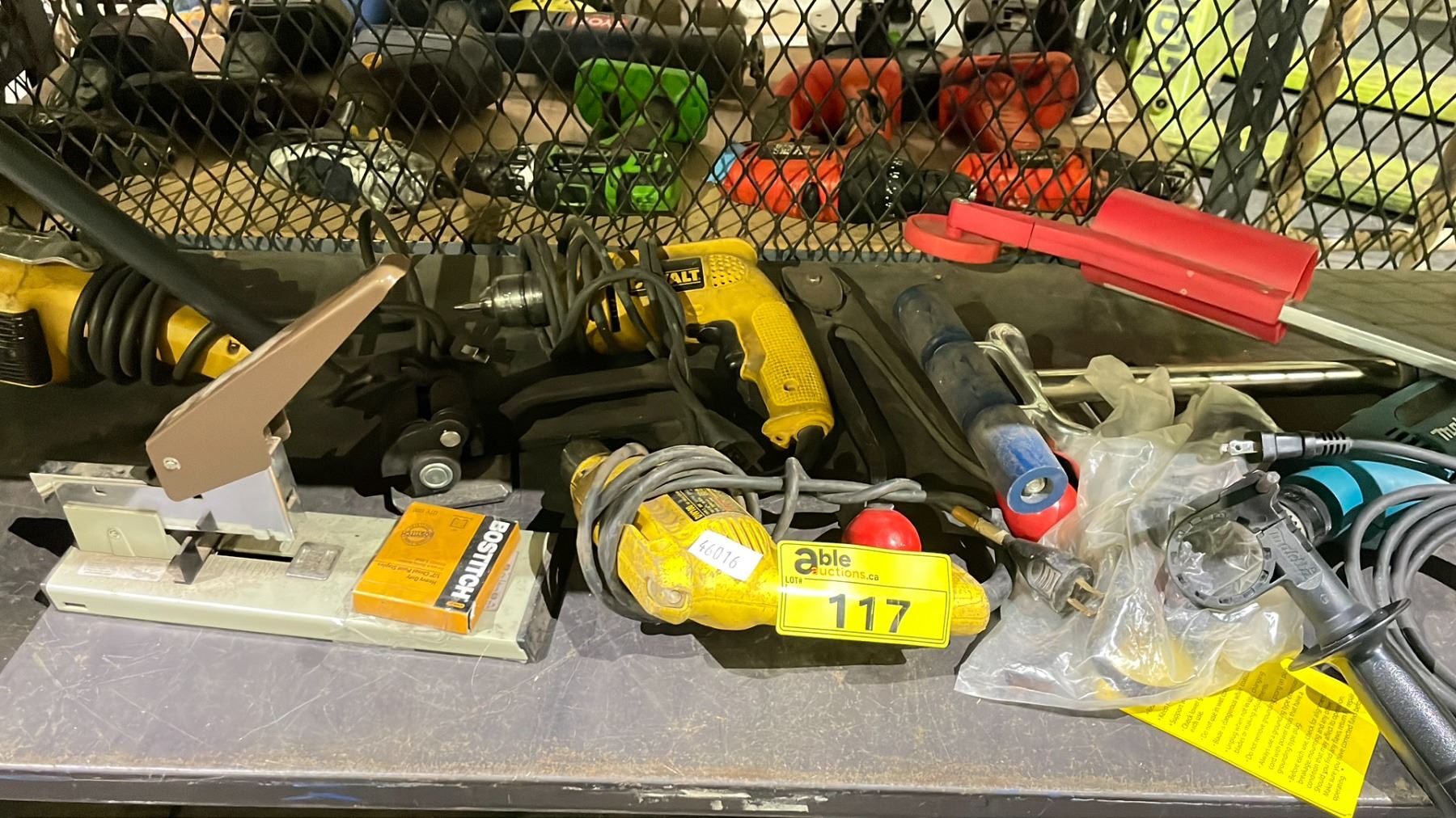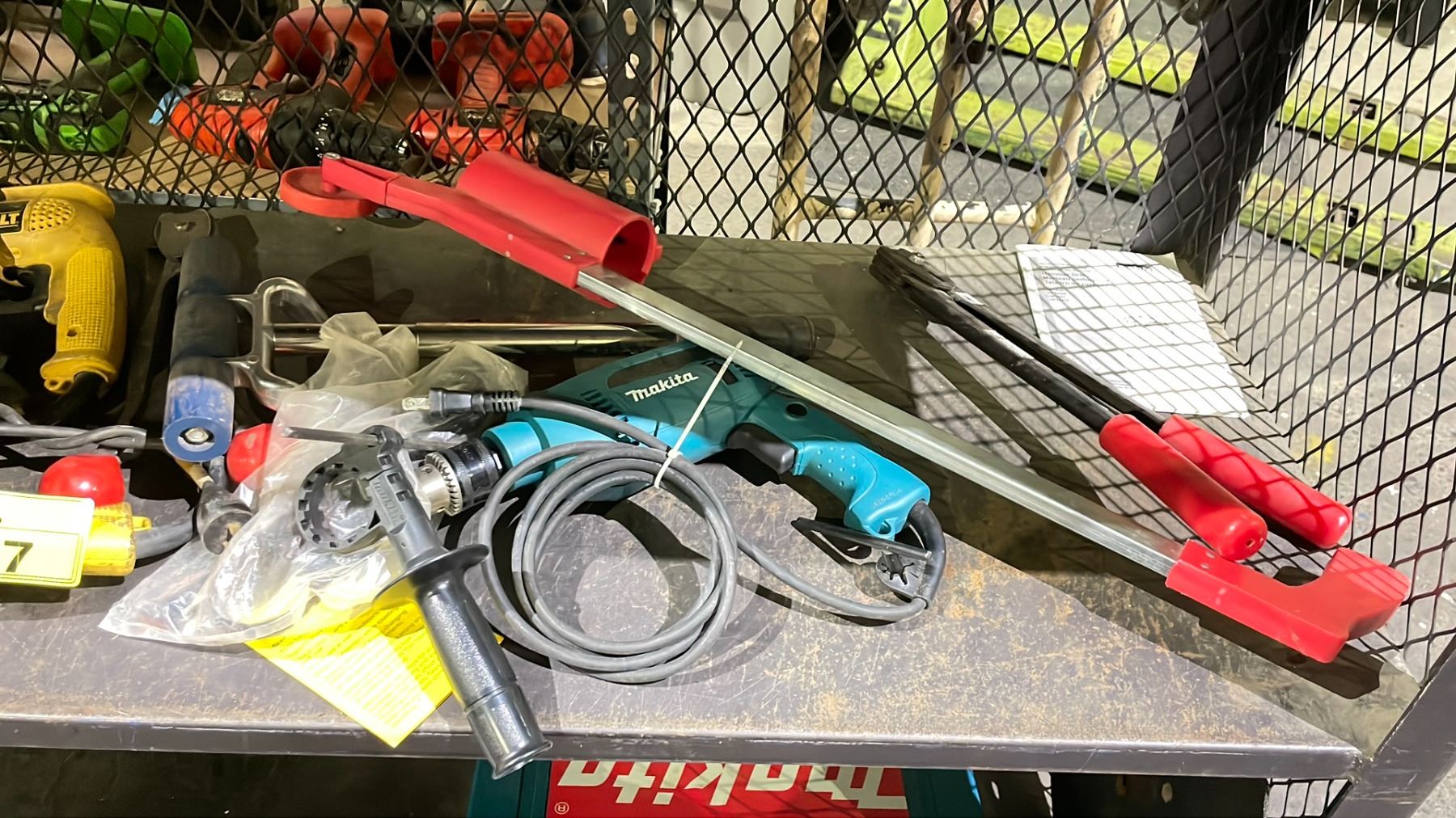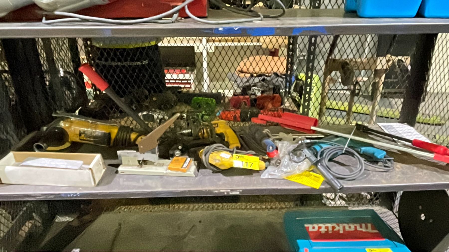 SHELF OF ASSORTED TOOLS INCLUDING; DEWALT ANGLE GRINDER, MAKITA DRILL, LINE SPRAYER & MORE