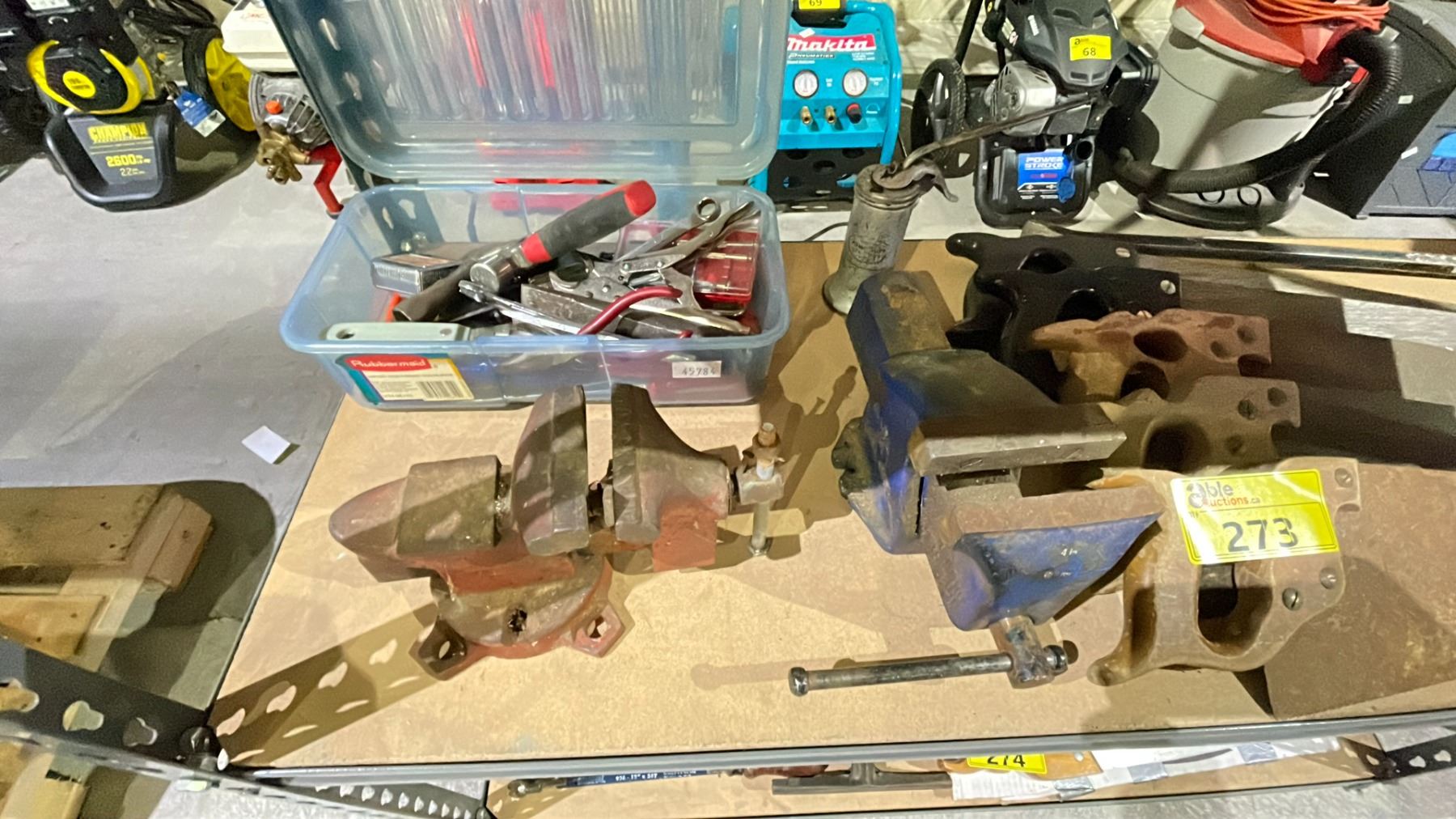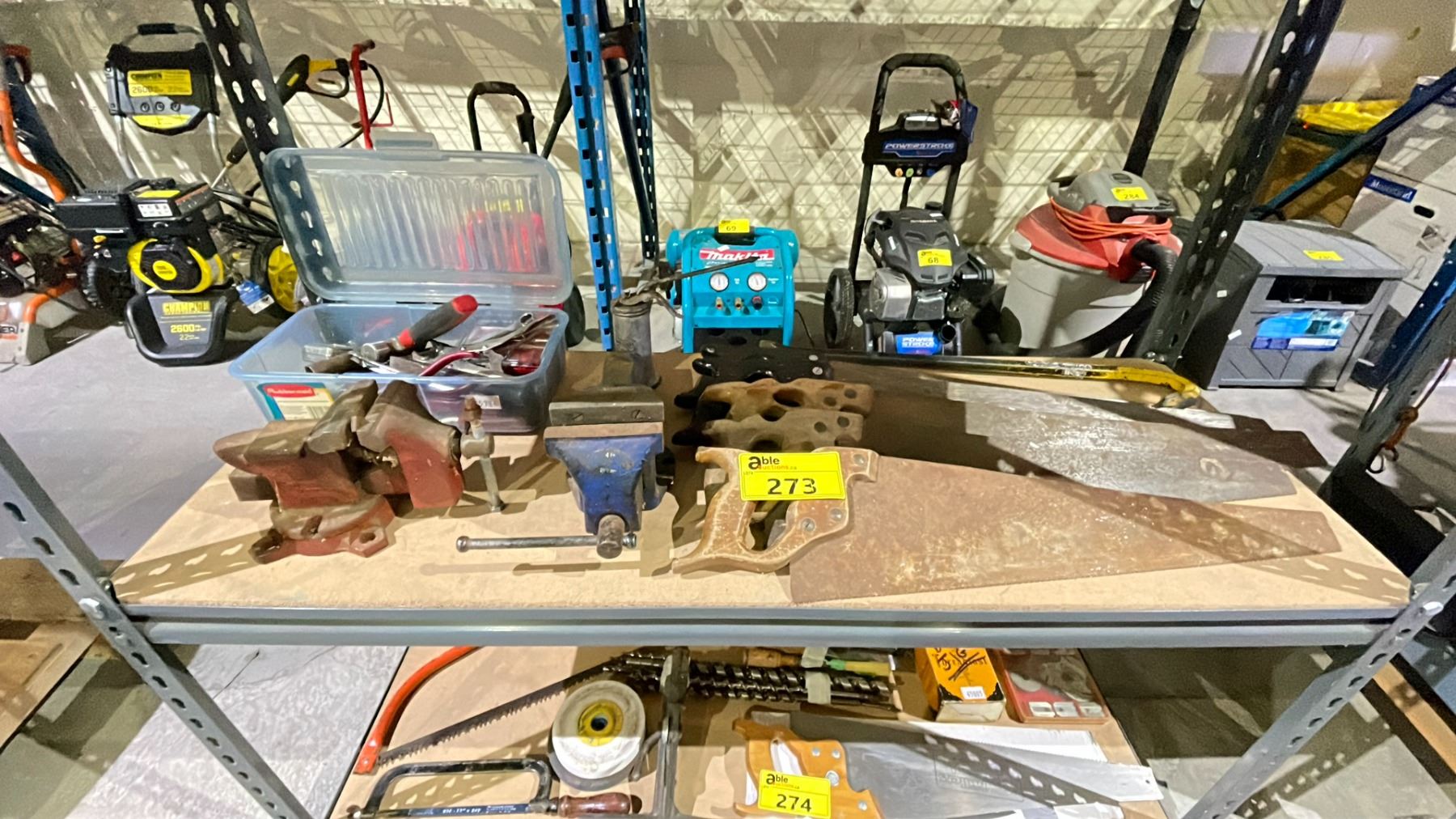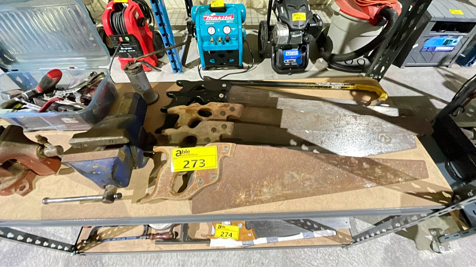 SHELF OF ASSORTED TOOLS INCLUDING; HANDSAWS, BENCH VISES, MINI HAMMER & MORE