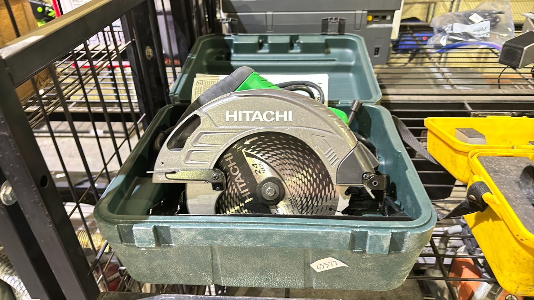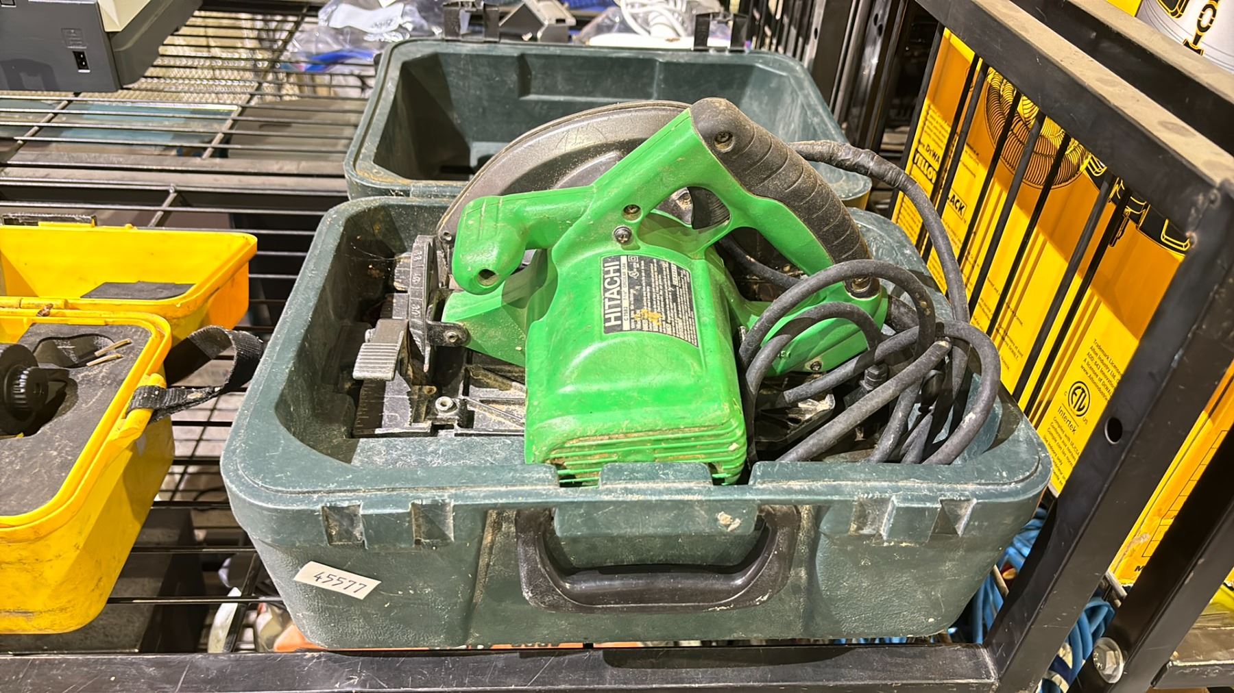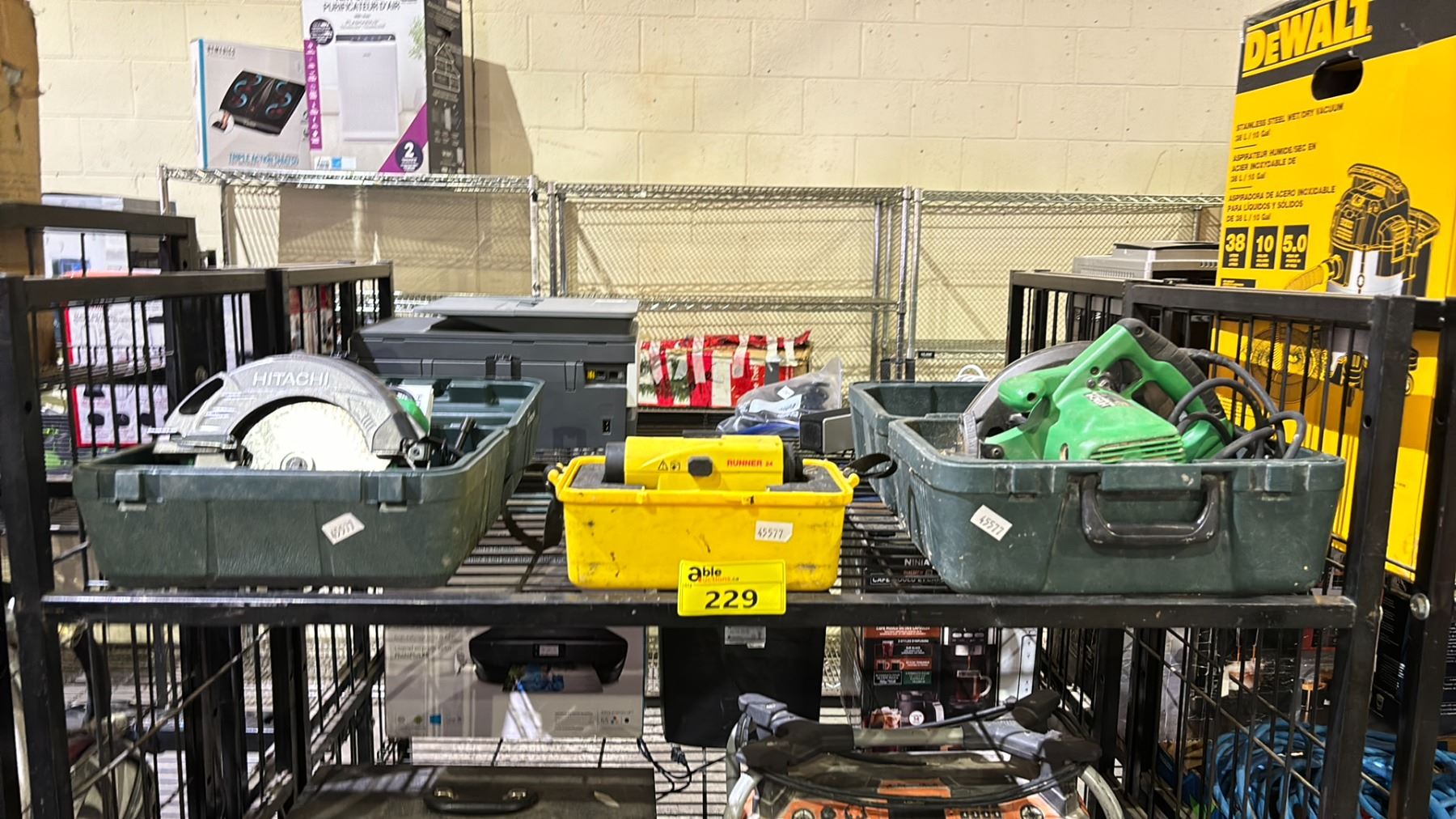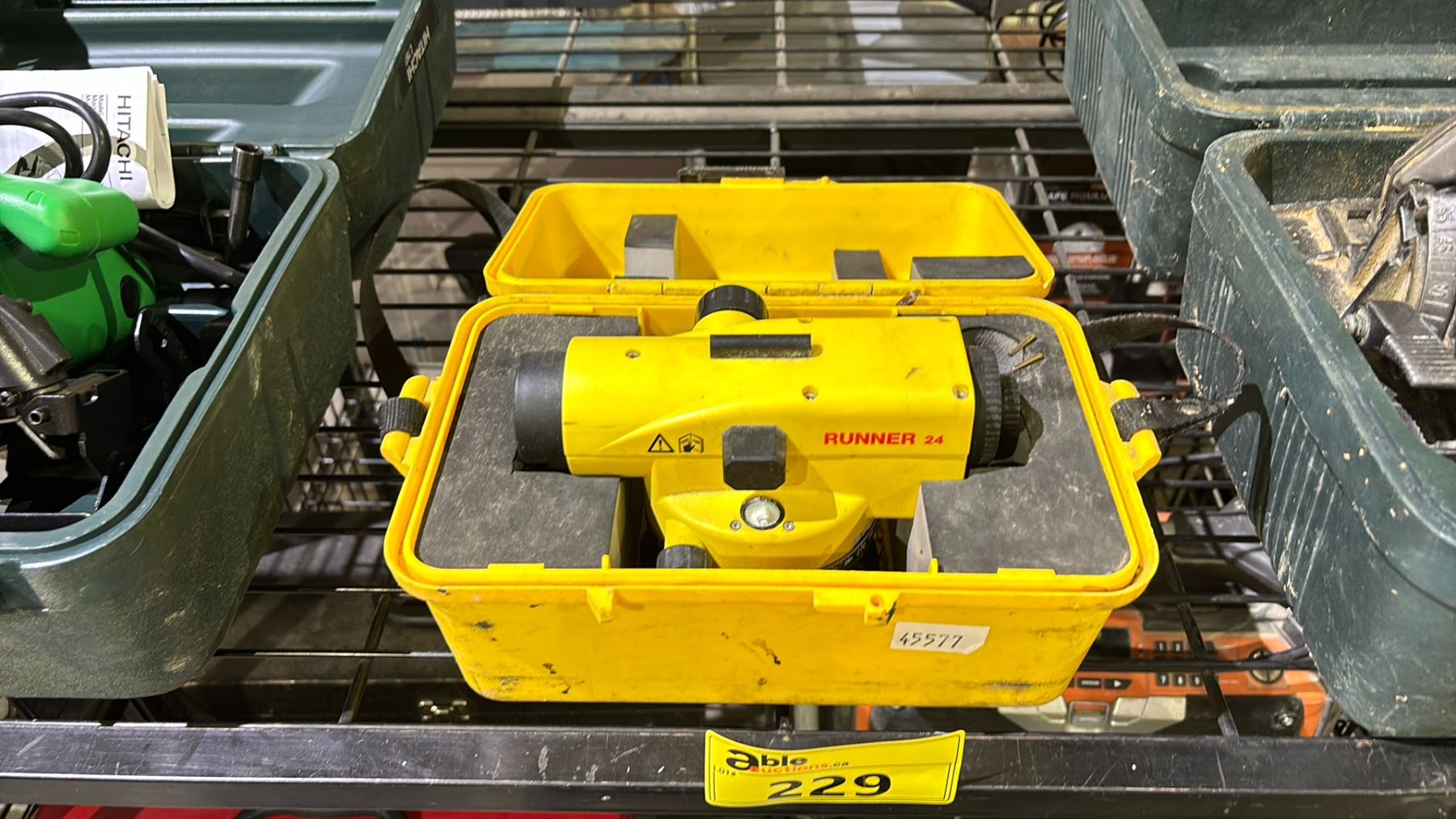 SHELF OF ASSORTED TOOLS INCLUDING; HITACHI CIRCULAR SAWS & LEICA RUNNER 24 SURVEYING LASER