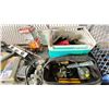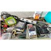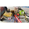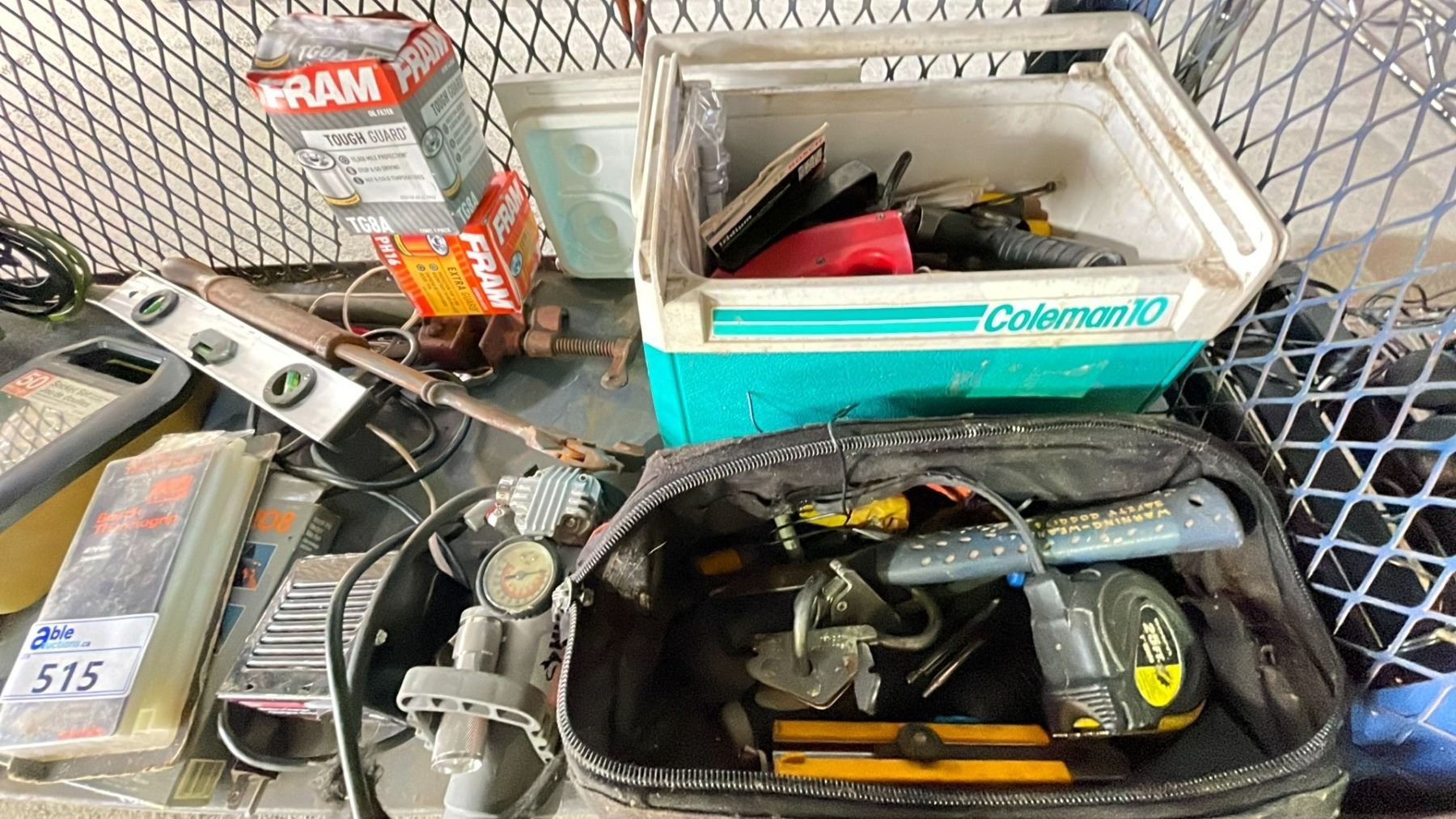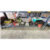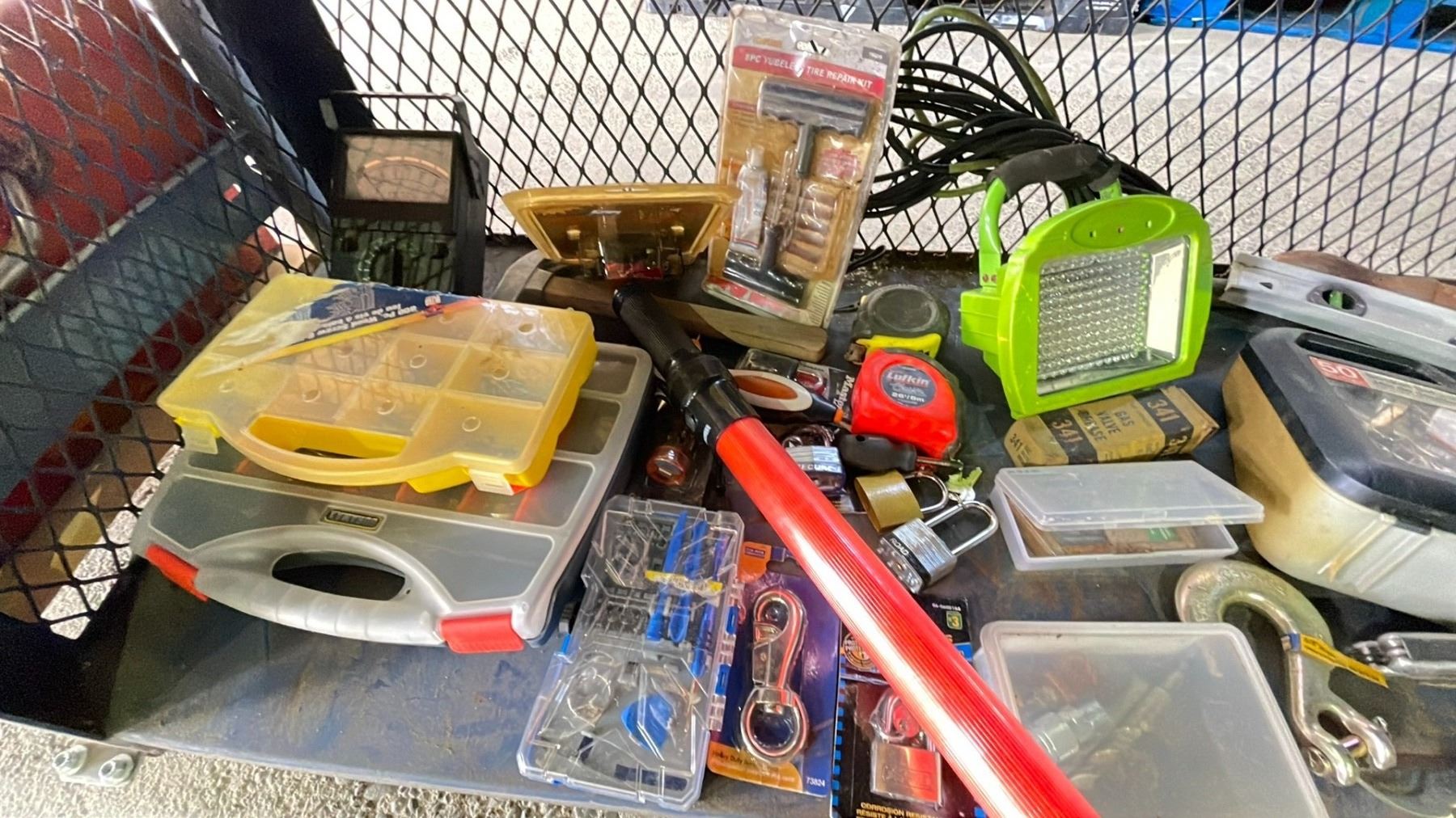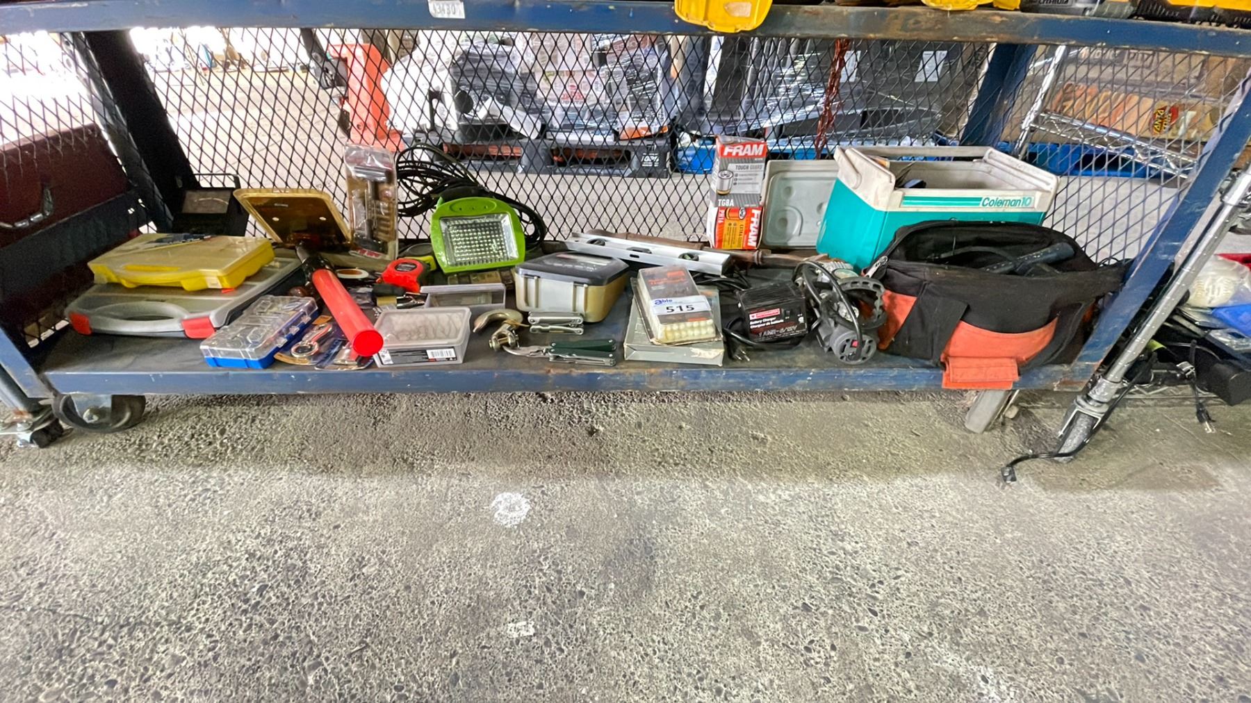 SHELF OF ASSORTED TOOLS INCLUDING; WORK LIGHT, TRAFFIC LIGHT, HAND TOOLS & MORE