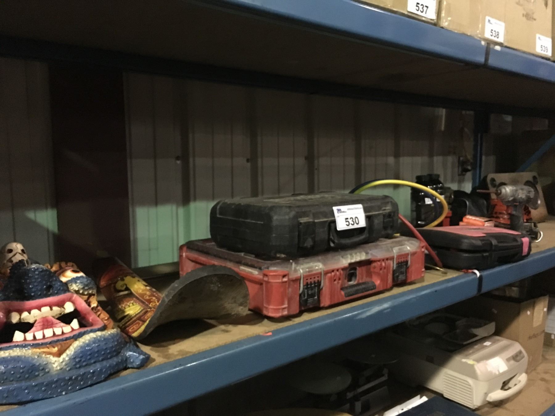 SHELF OF ASSORTED TOOLS, MASKS, RAPTOR LINER SPRAY ON BED LINER, AND MORE