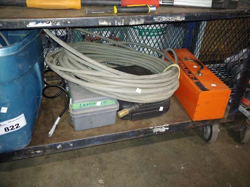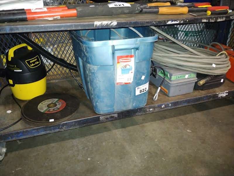 SHELF OF ASSORTED TOOLS, SHOP VAC, HOSE AND MORE