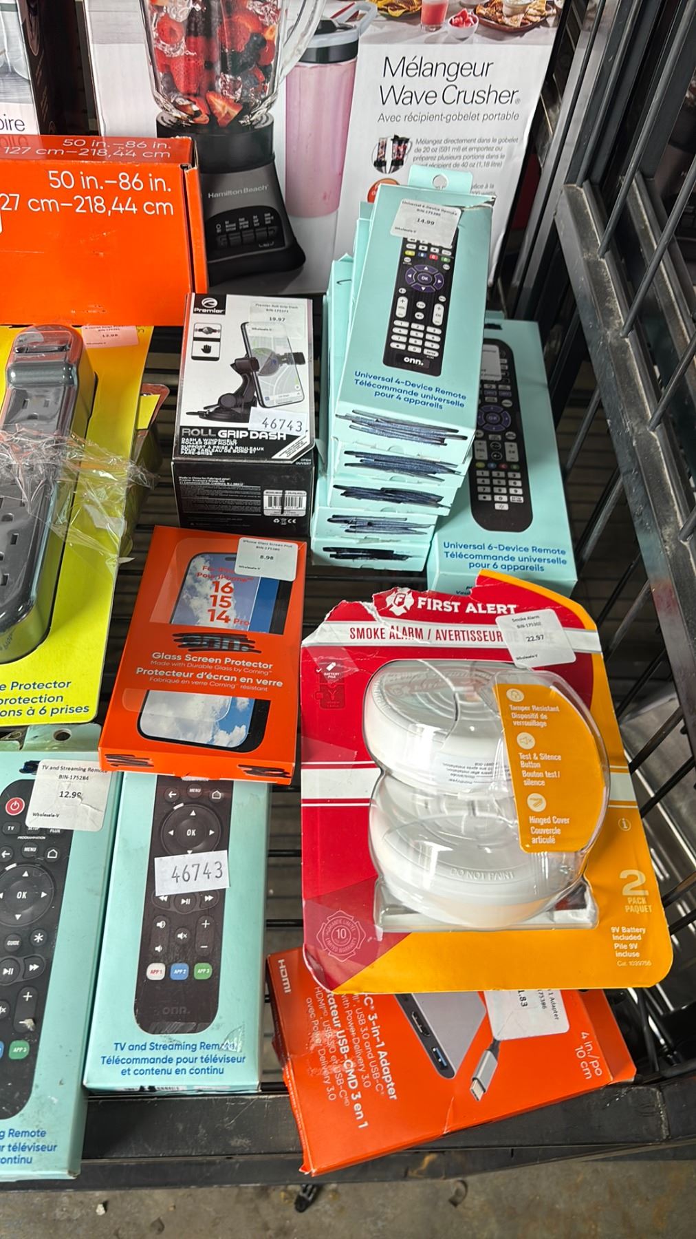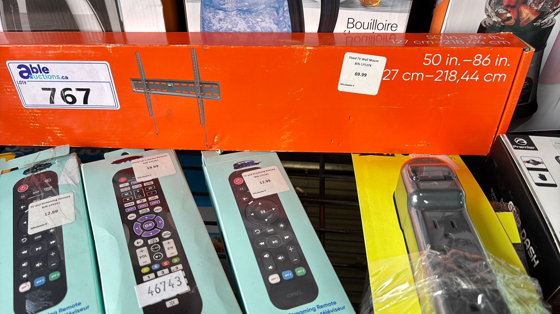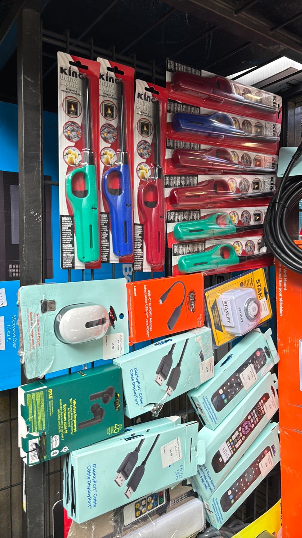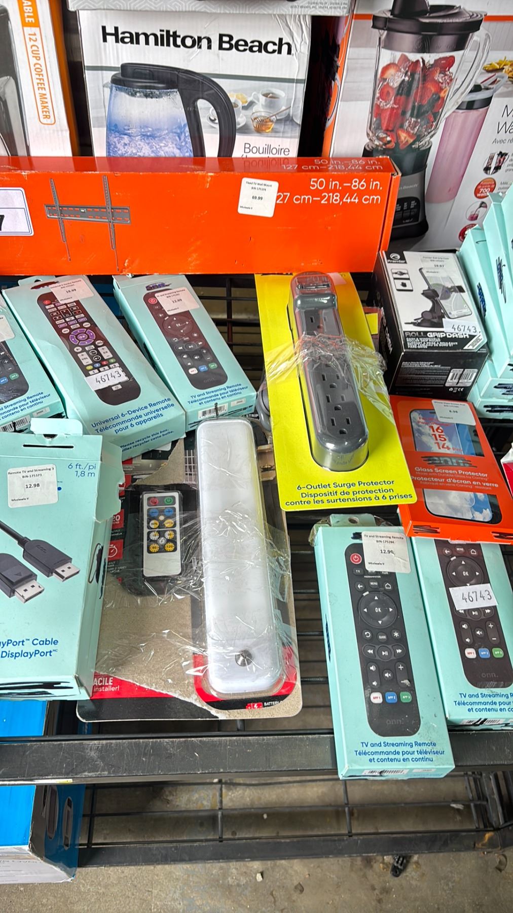 SHELF OF ASSORTED UNIVERSAL REMOTES, CABLES, 50" - 86" TV WALL MOUNT, BBQ LIGHTERS & MORE