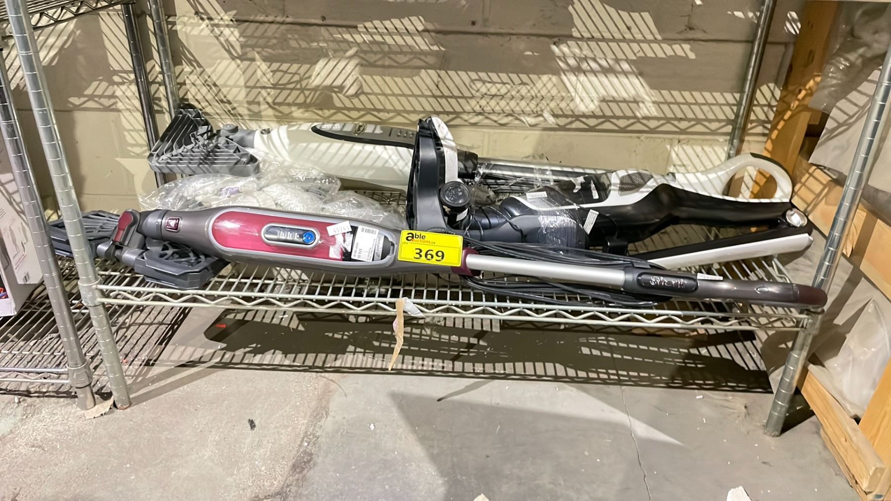 SHELF OF ASSORTED VACUUMS & MOPS (UNKNOWN WORKING CONDITION, MAY BE MISSING PIECES)