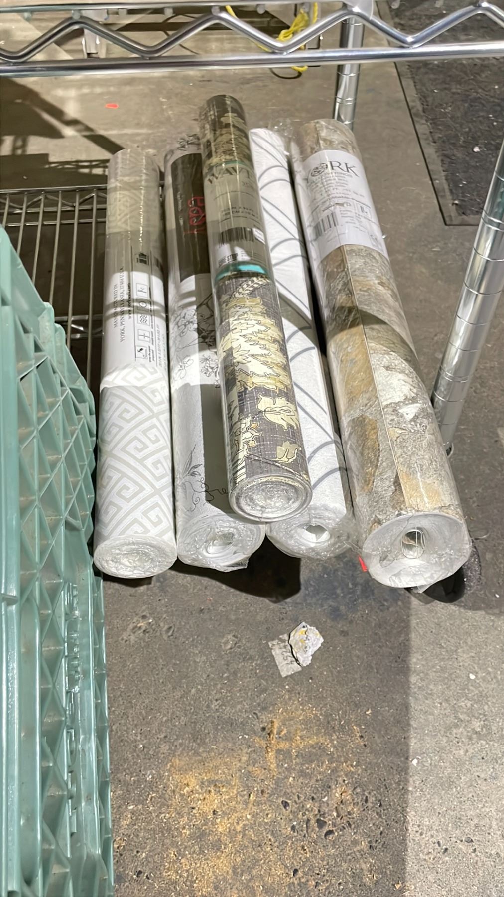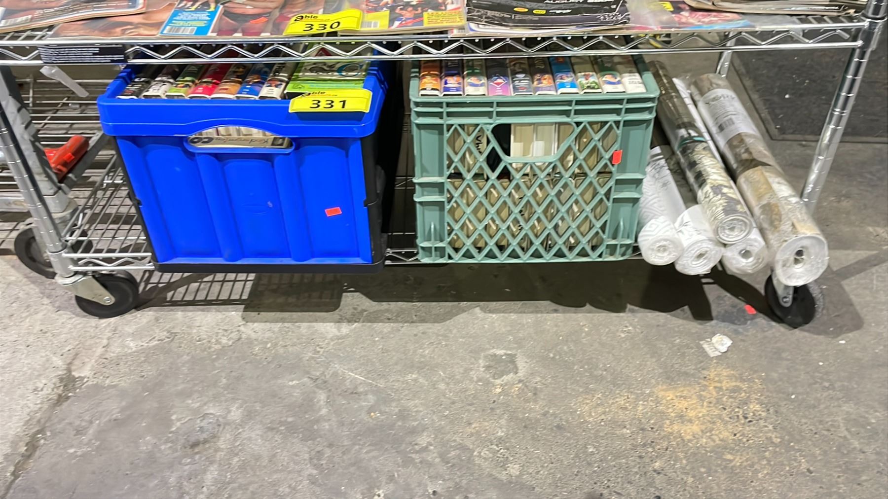 SHELF OF ASSORTED VHS MOVIES & ROLLS OF WALLPAPER