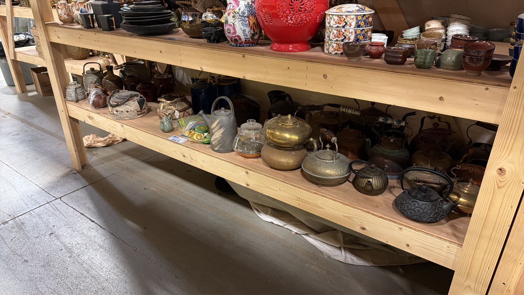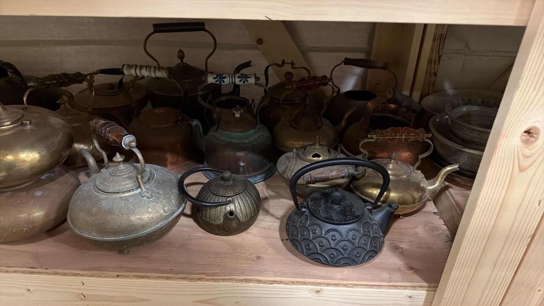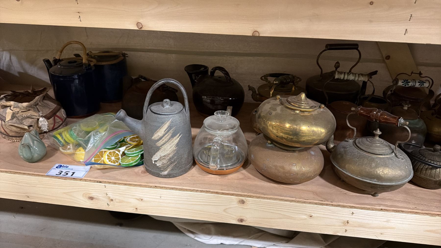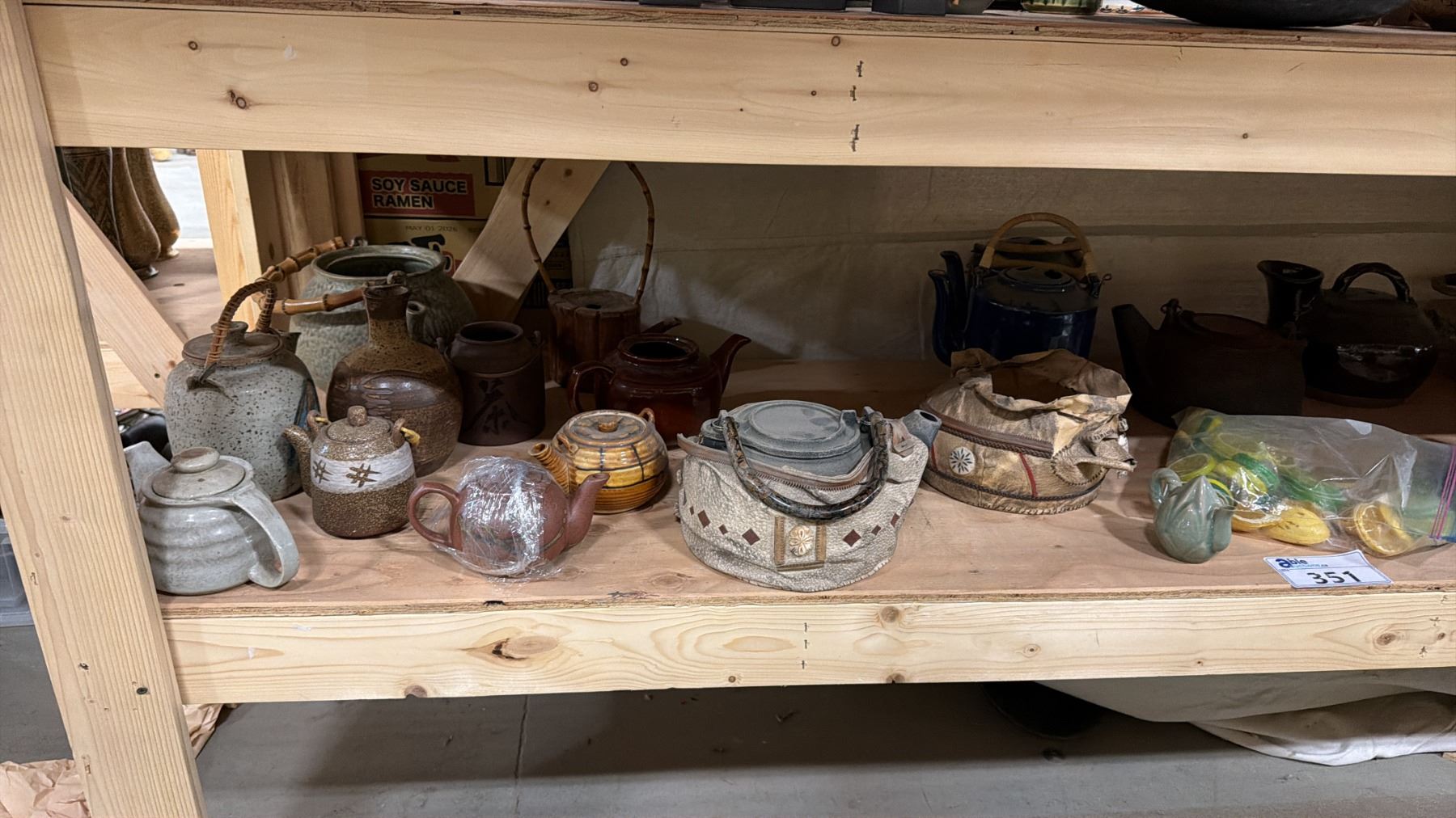 SHELF OF ASSORTED VINTAGE COLLECTABLE TEAPOTS
