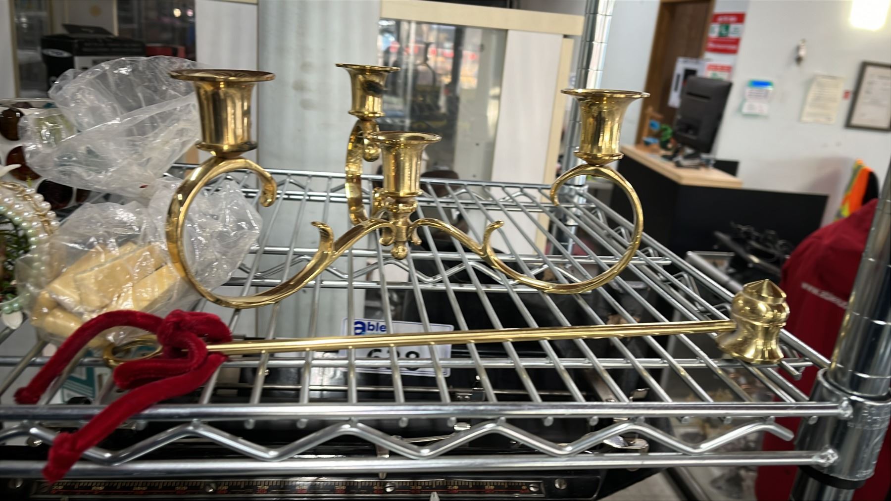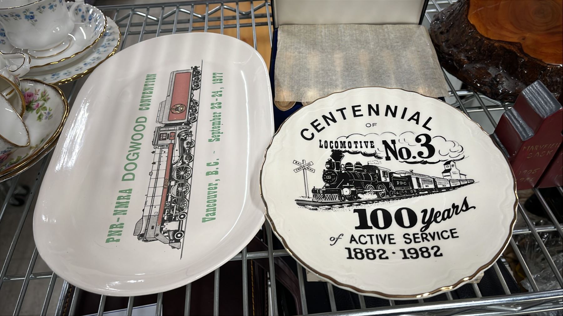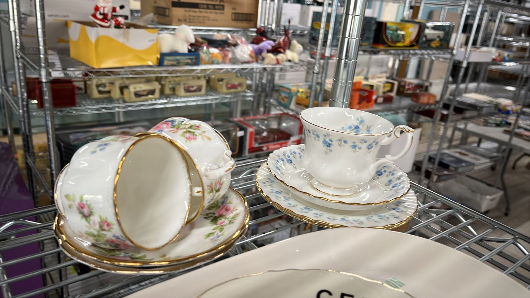 SHELF OF ASSORTED VINTAGE HOME GOODS: TEACUPS, SAUCERS, NUT CRACKER SET, DECORATIVE ITEMS & MORE