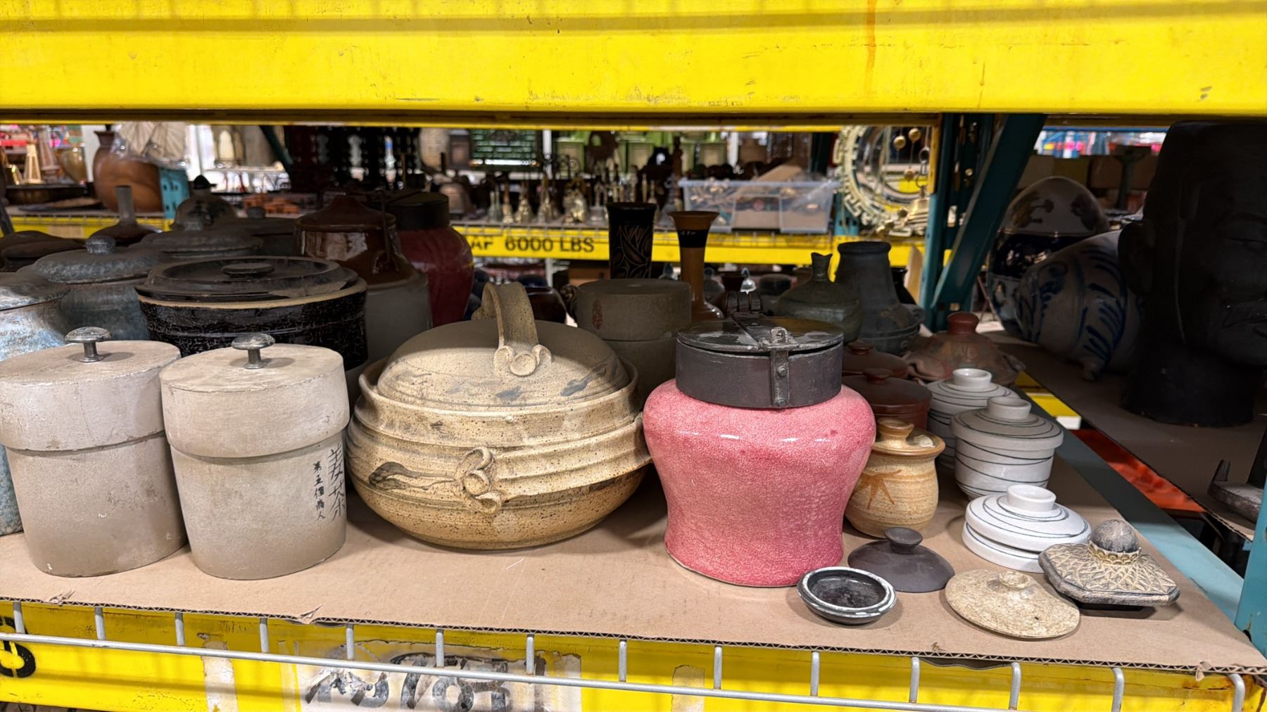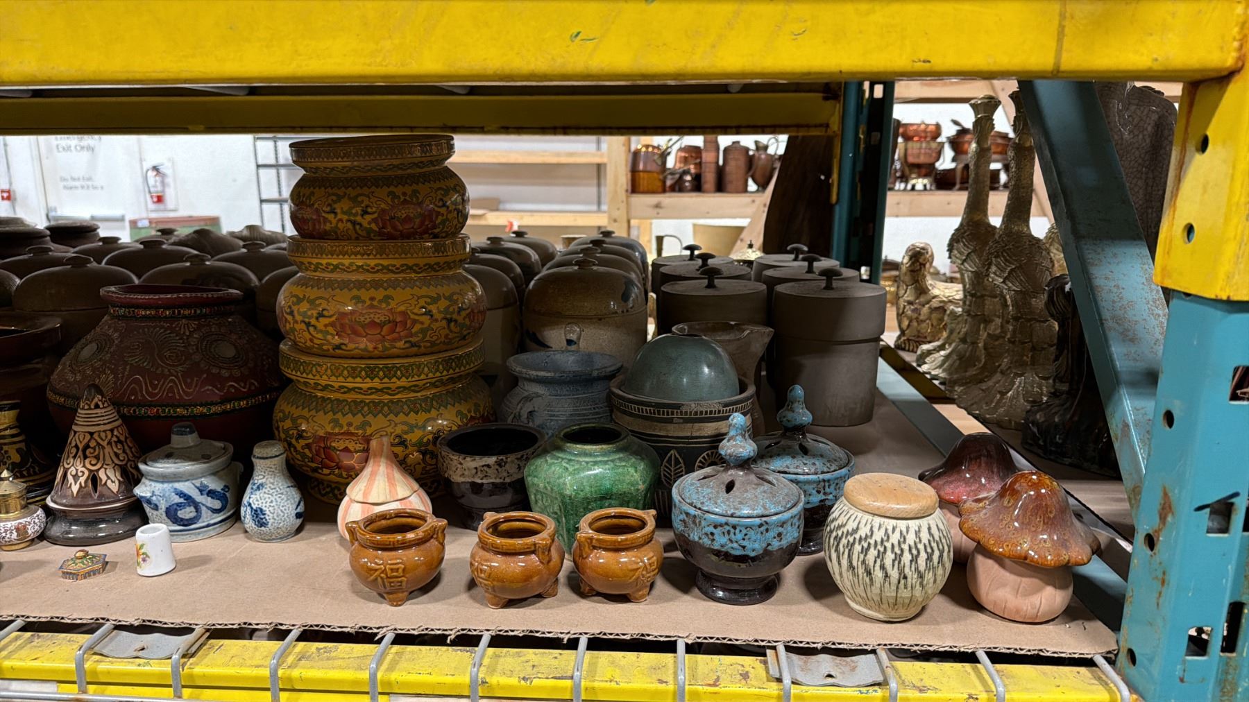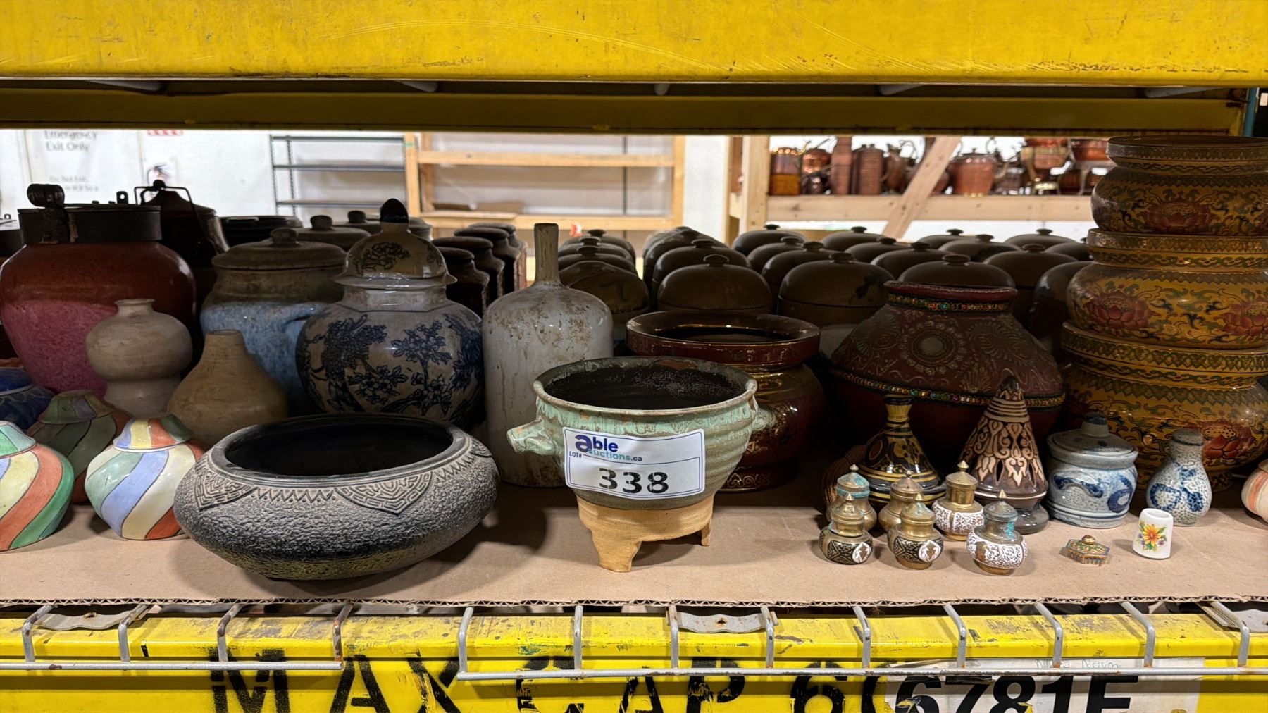SHELF OF ASSORTED VINTAGE JARS, VASES & DECOR ITEMS