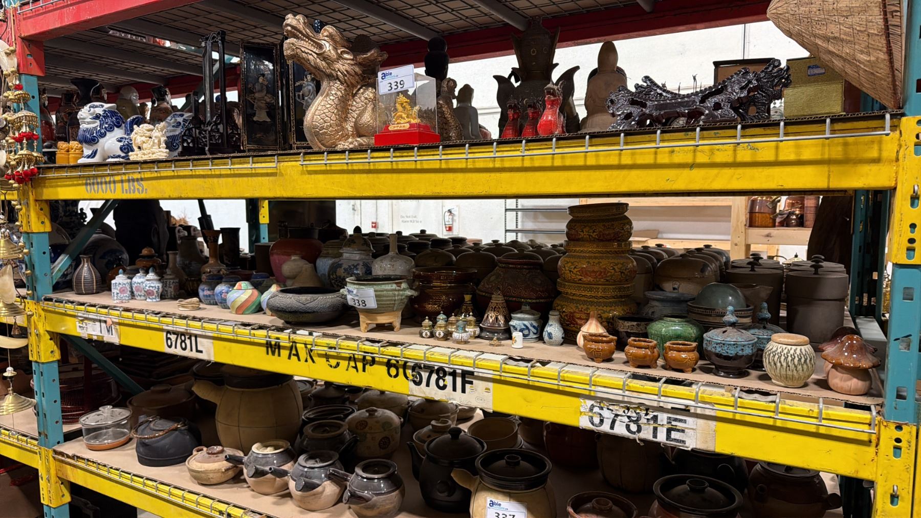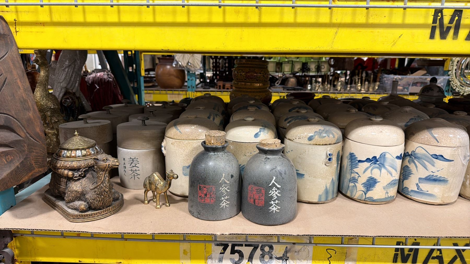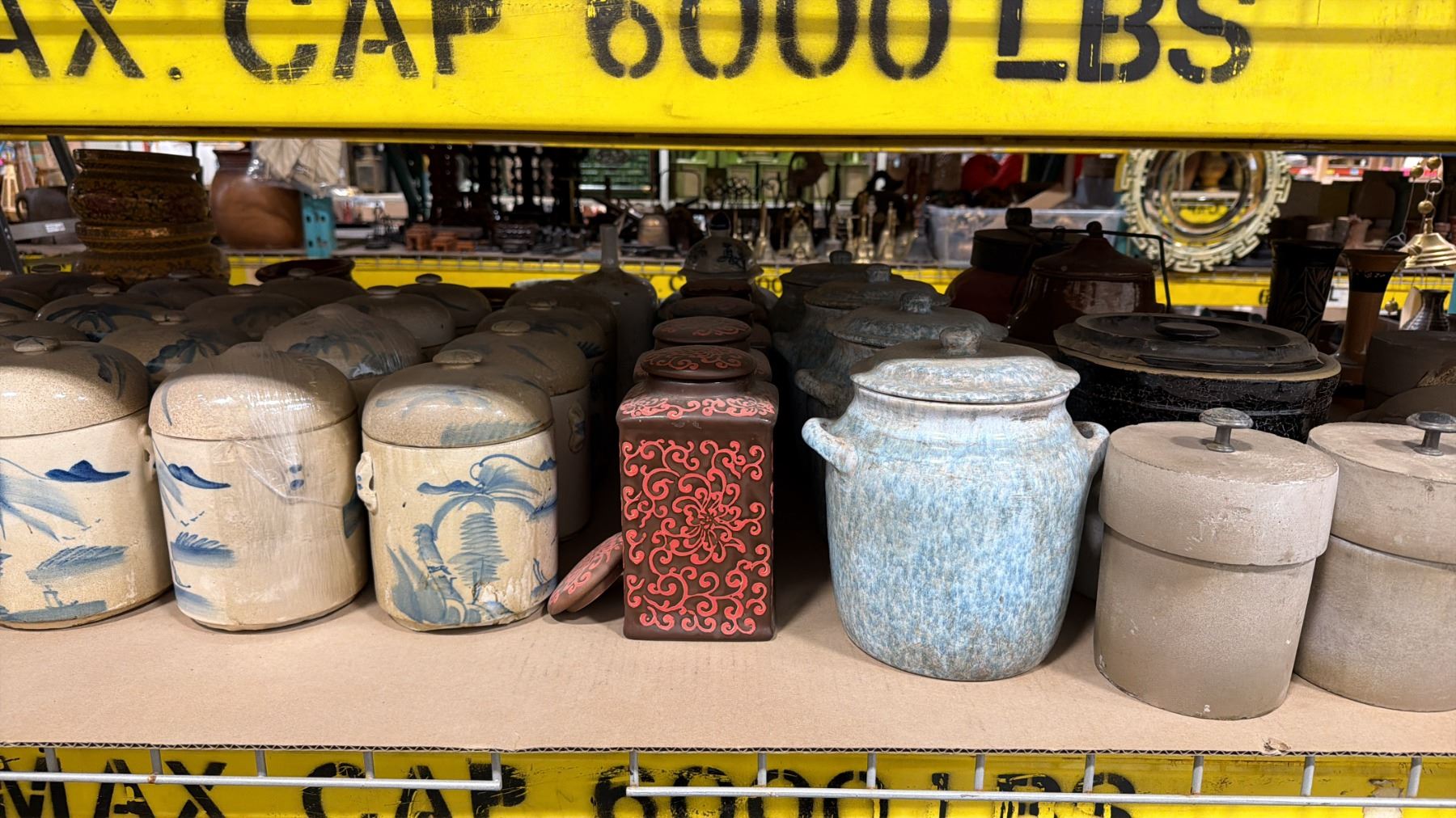 SHELF OF ASSORTED VINTAGE JARS, VASES & DECOR ITEMS