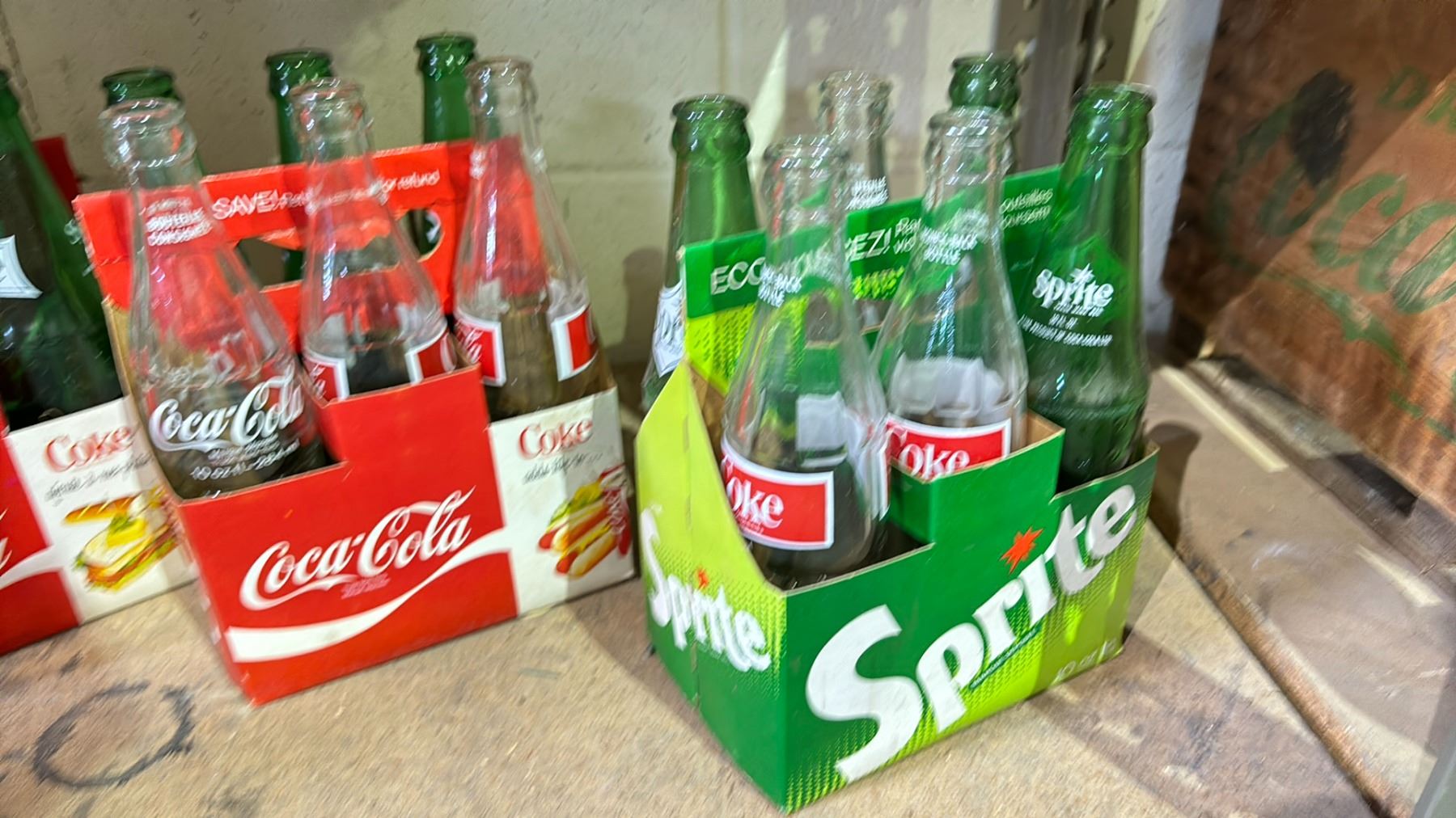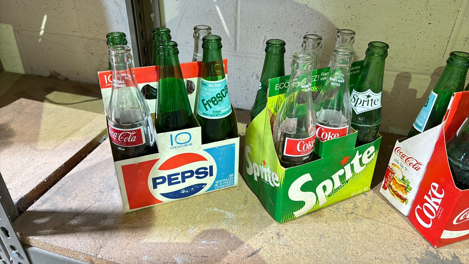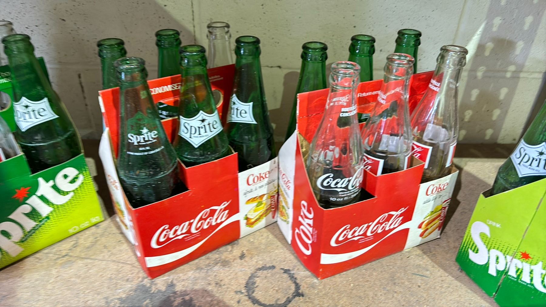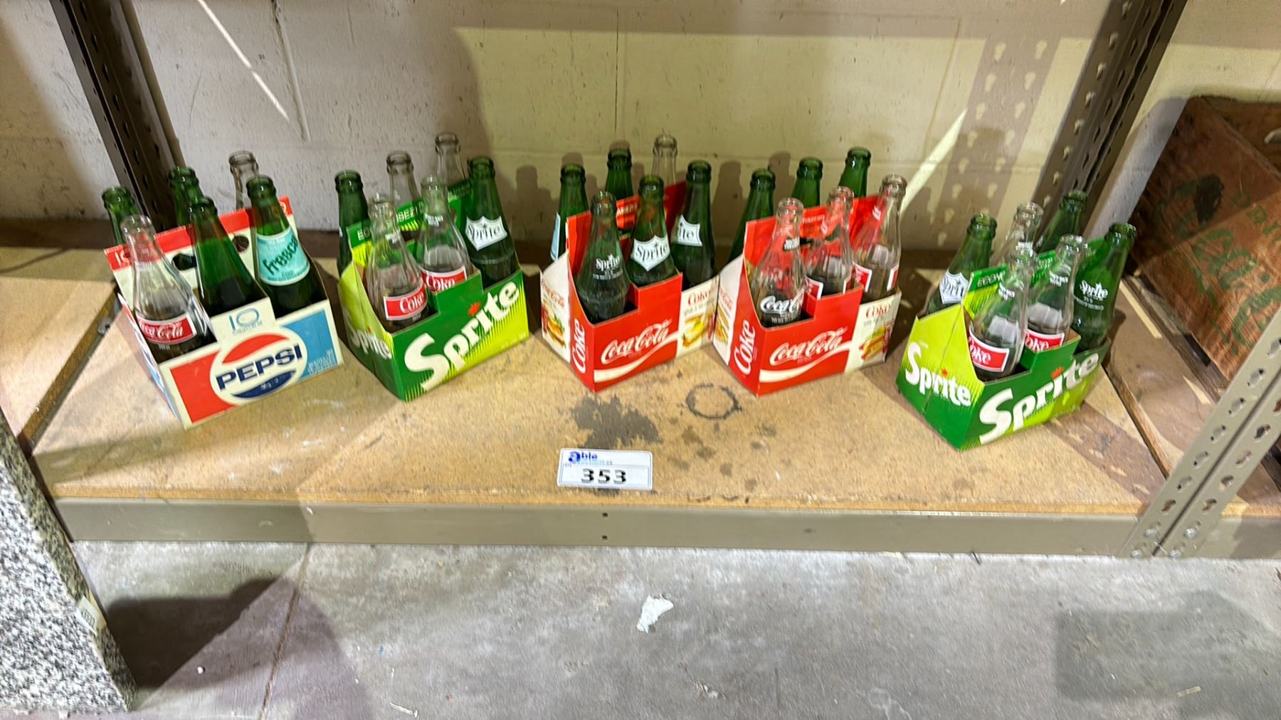 SHELF OF ASSORTED VINTAGE SODA BOTTLES WITH CARRIERS INCLUDING; SPRITE, COCA-COLA & FRESCA
