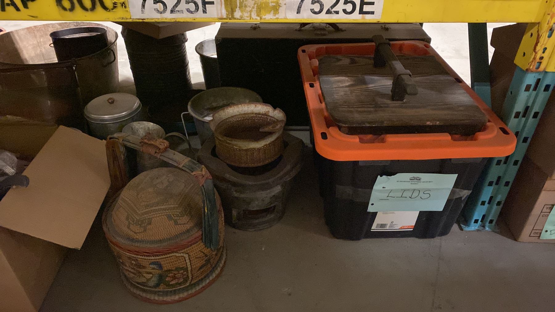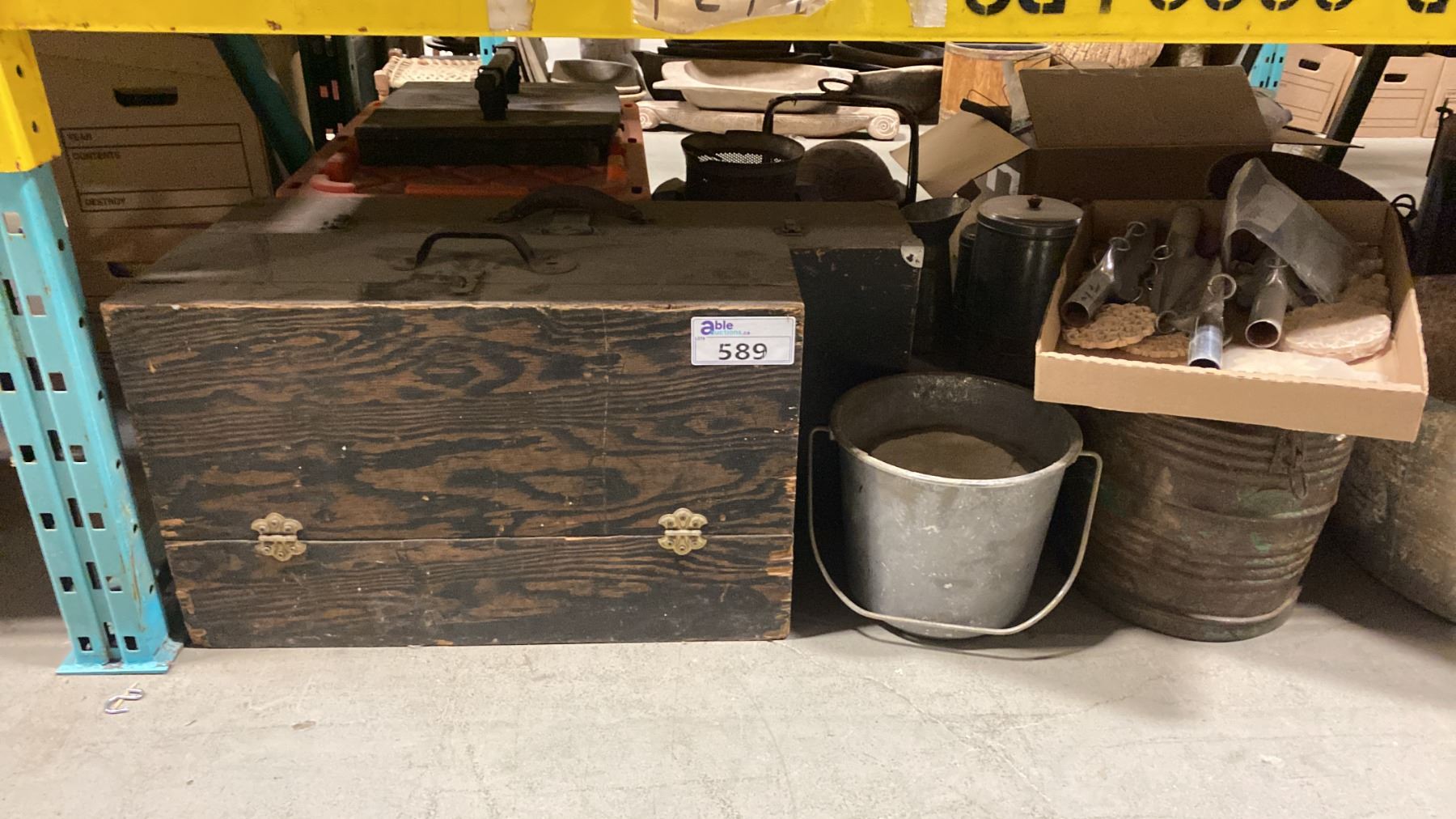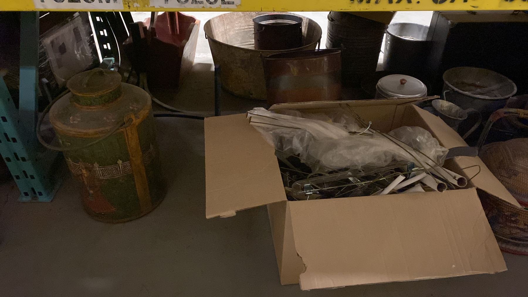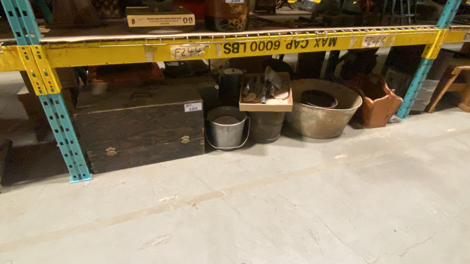 SHELF OF ASSORTED WOODEN BOXES, METAL PAILS & DECORATIVE ITEMS