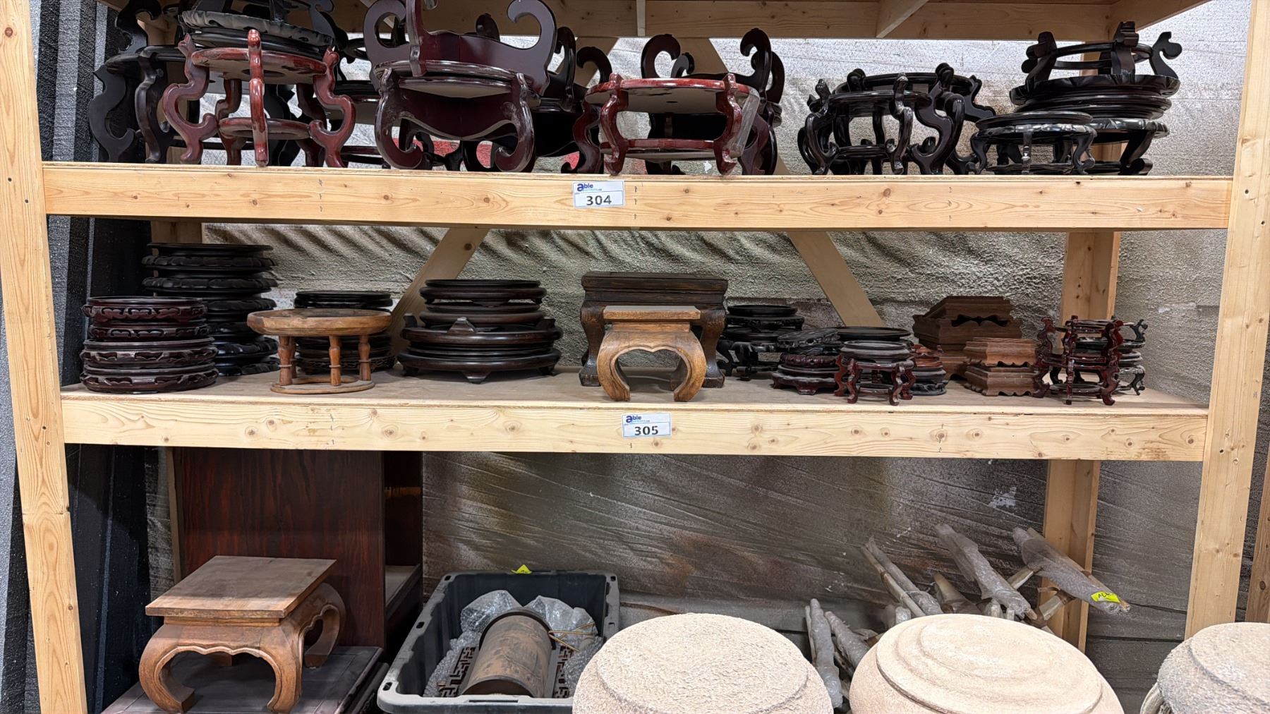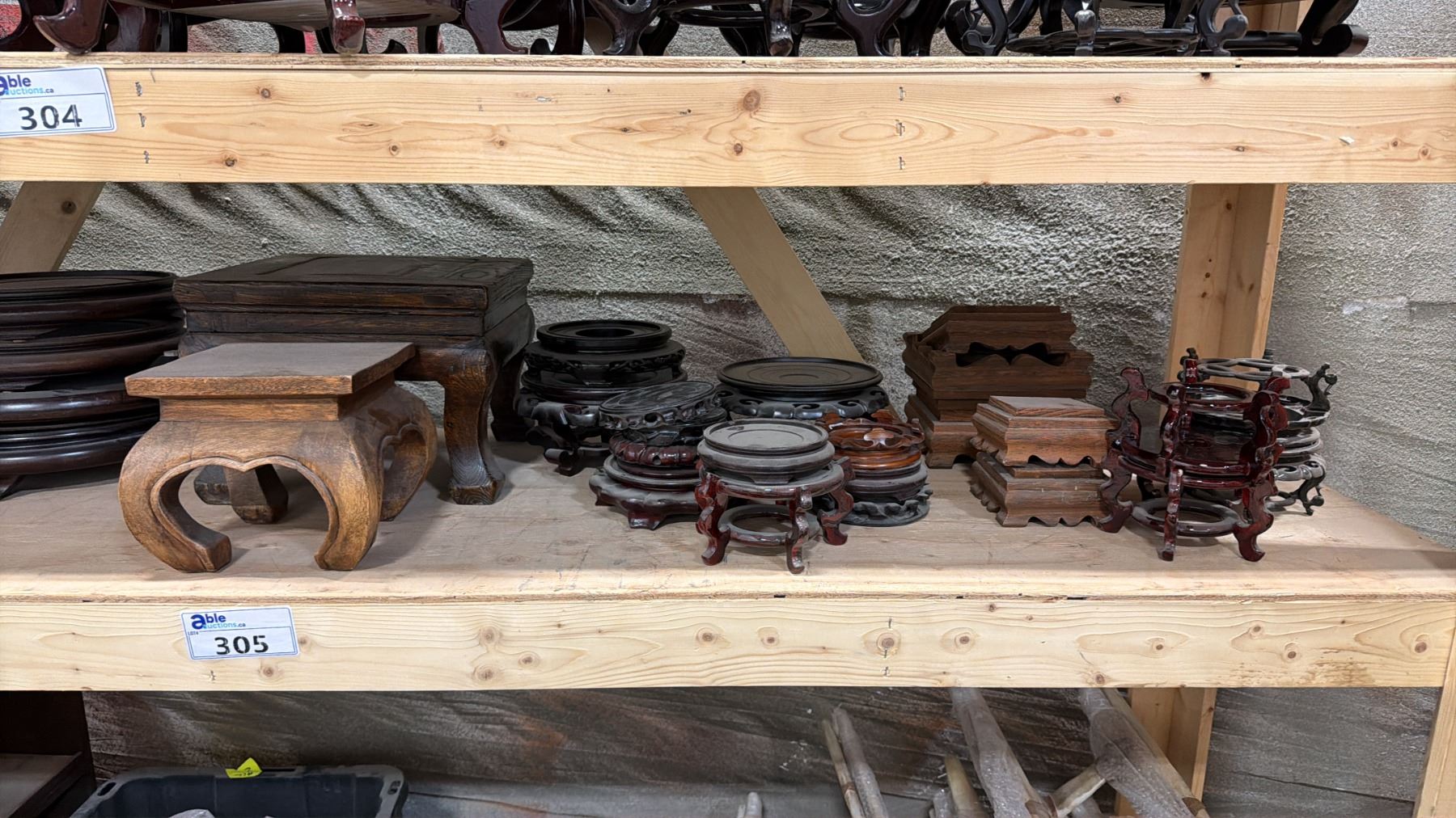 SHELF OF ASSORTED WOODEN PLANTER STANDS & BASES