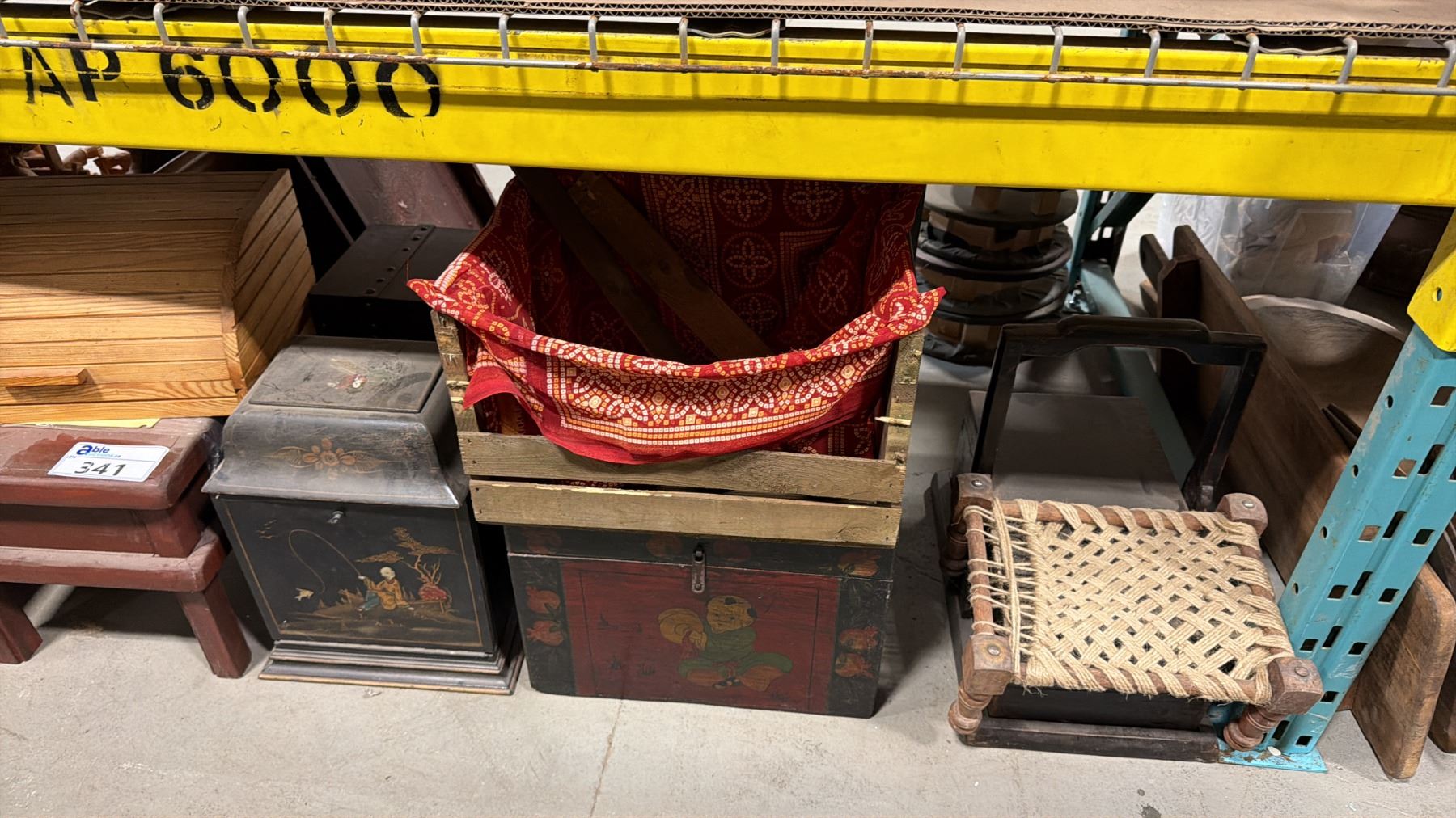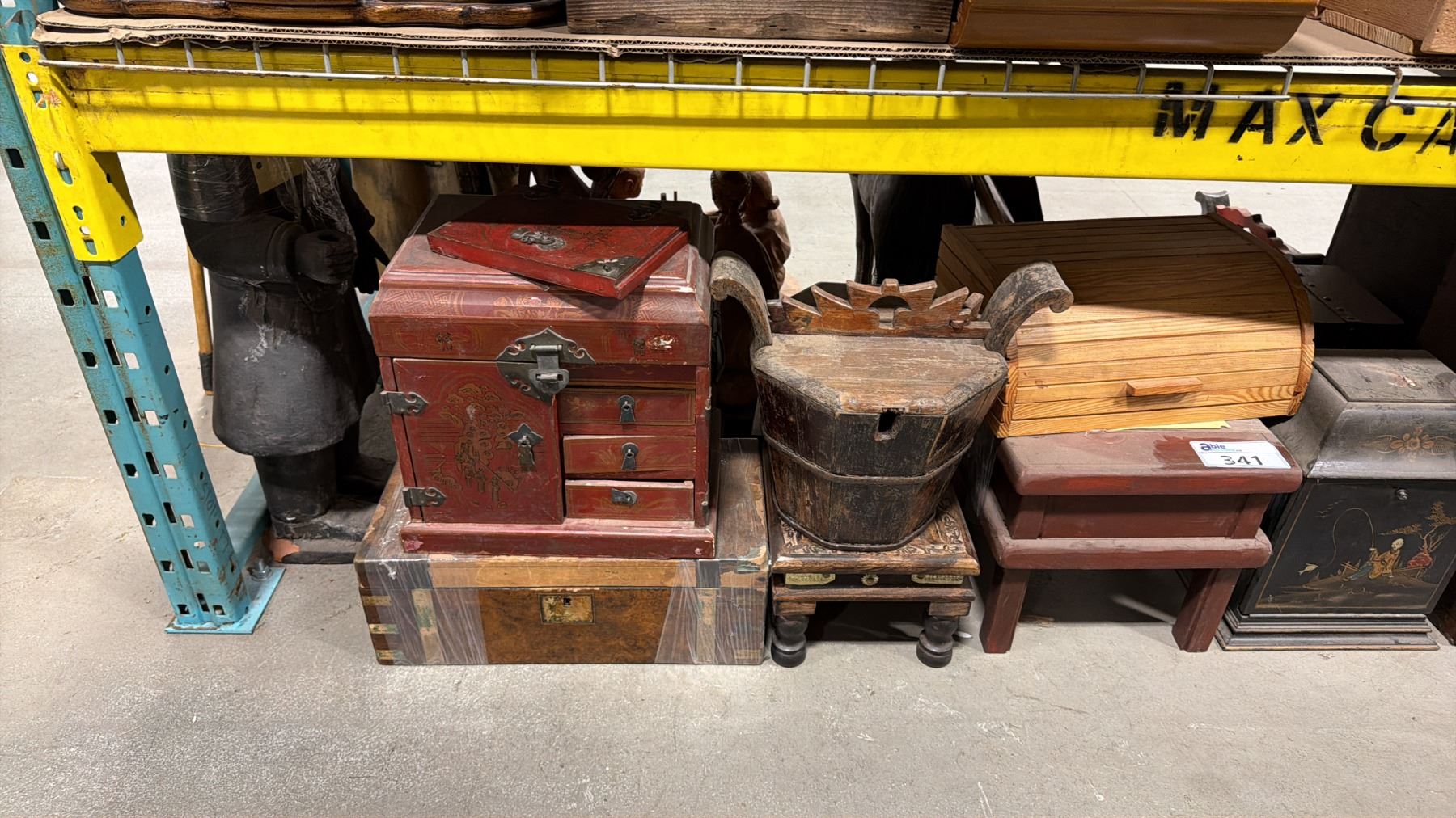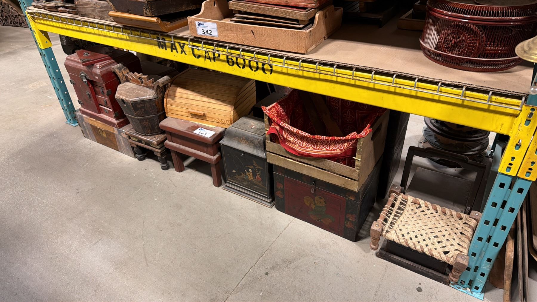SHELF OF ASSORTED WOODEN STORAGE BOXES, ASIAN STATUES, PLANT STANDS & SERVING TRAYS