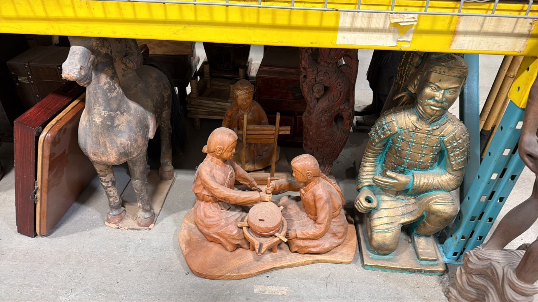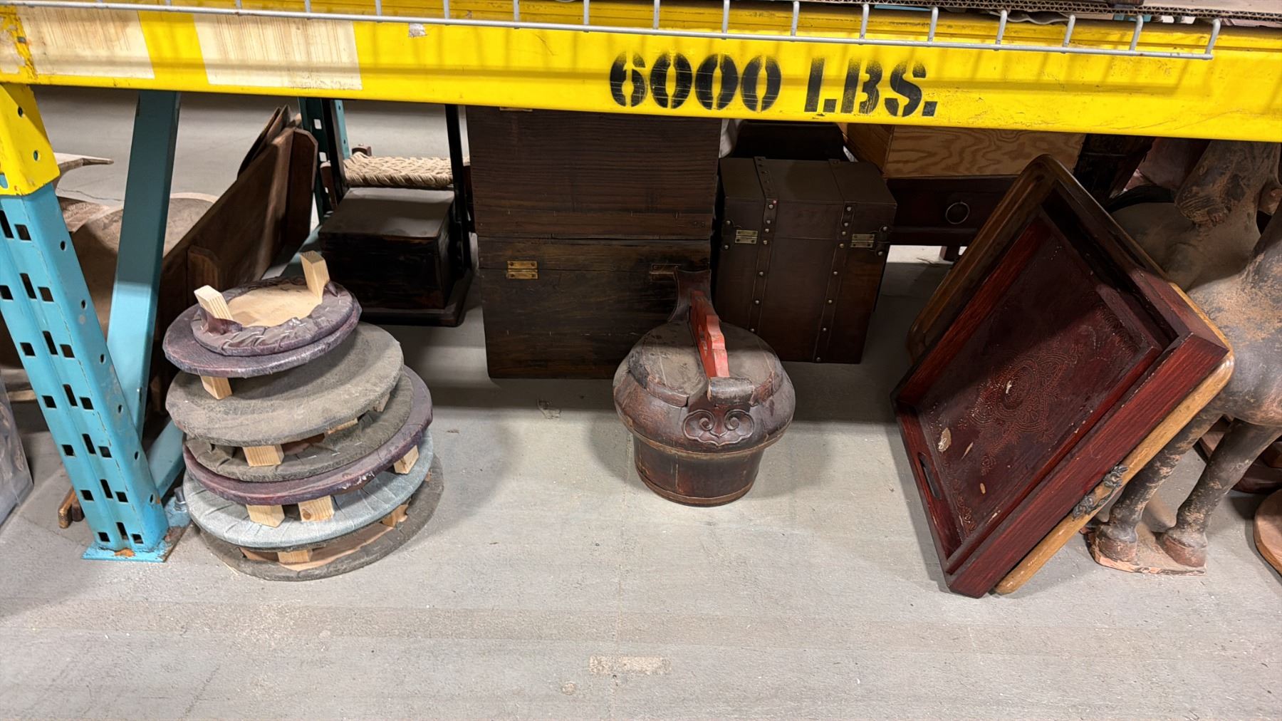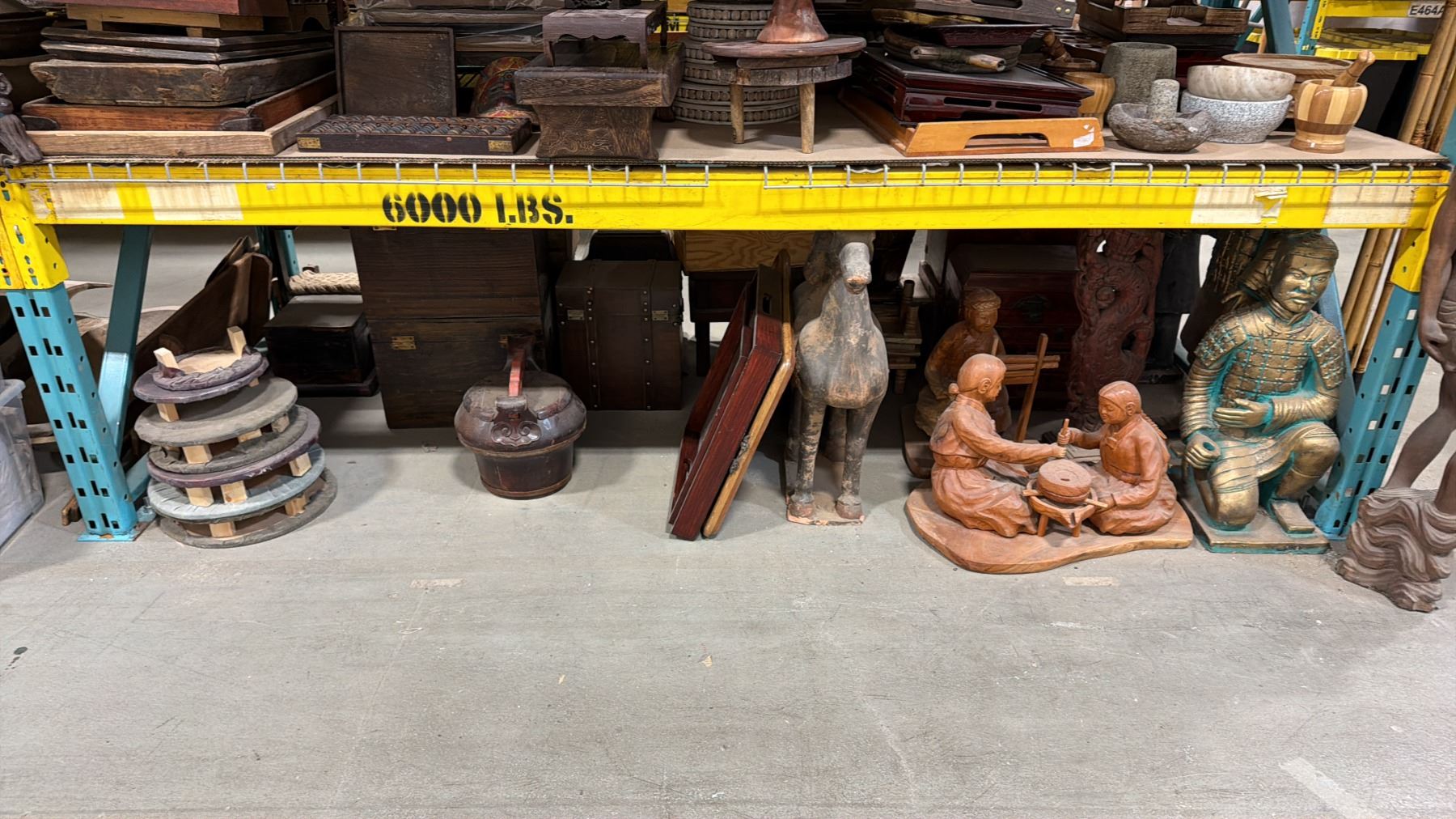 SHELF OF ASSORTED WOODEN STORAGE BOXES, ASIAN STATUES, PLANT STANDS & SERVING TRAYS