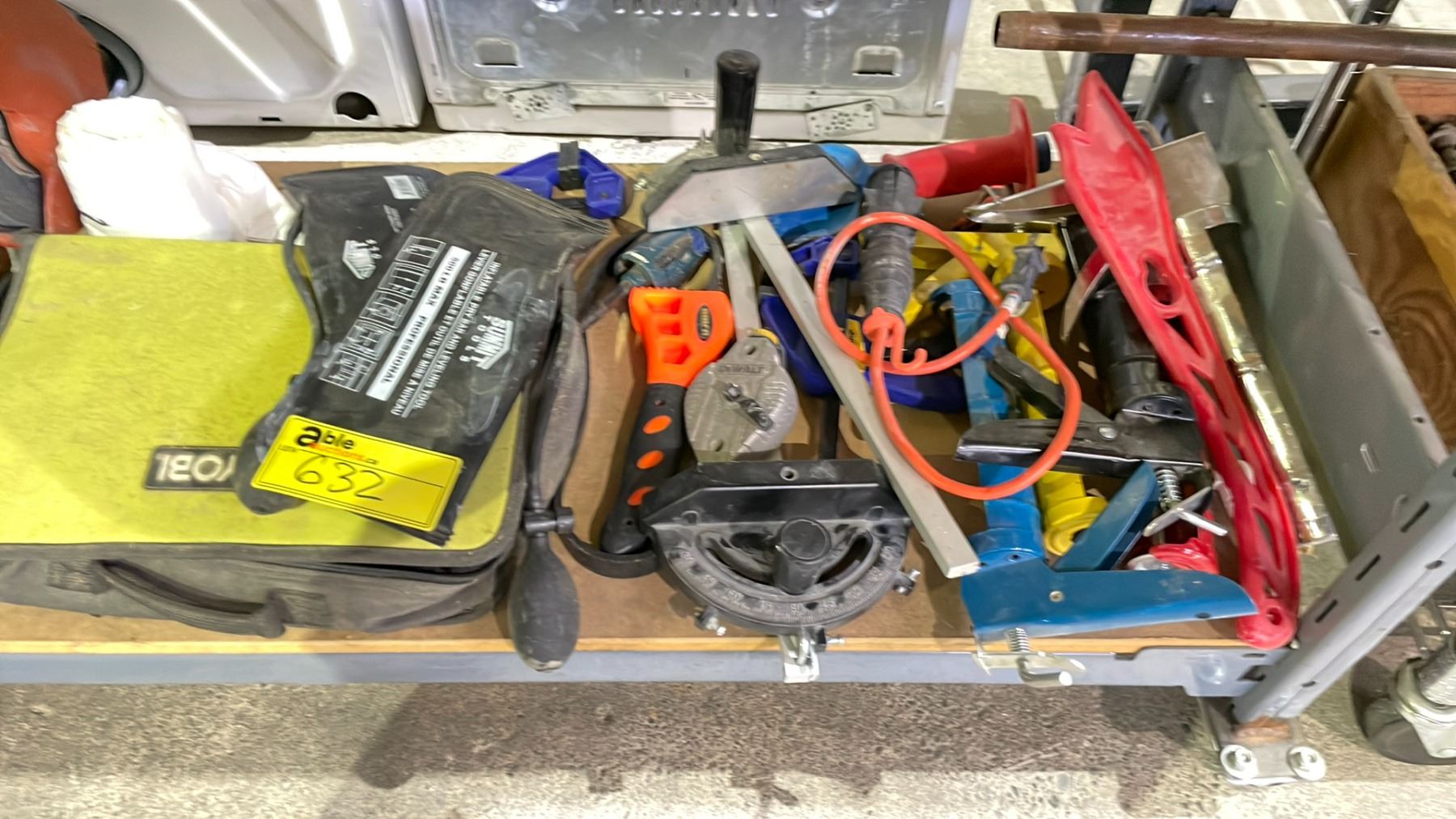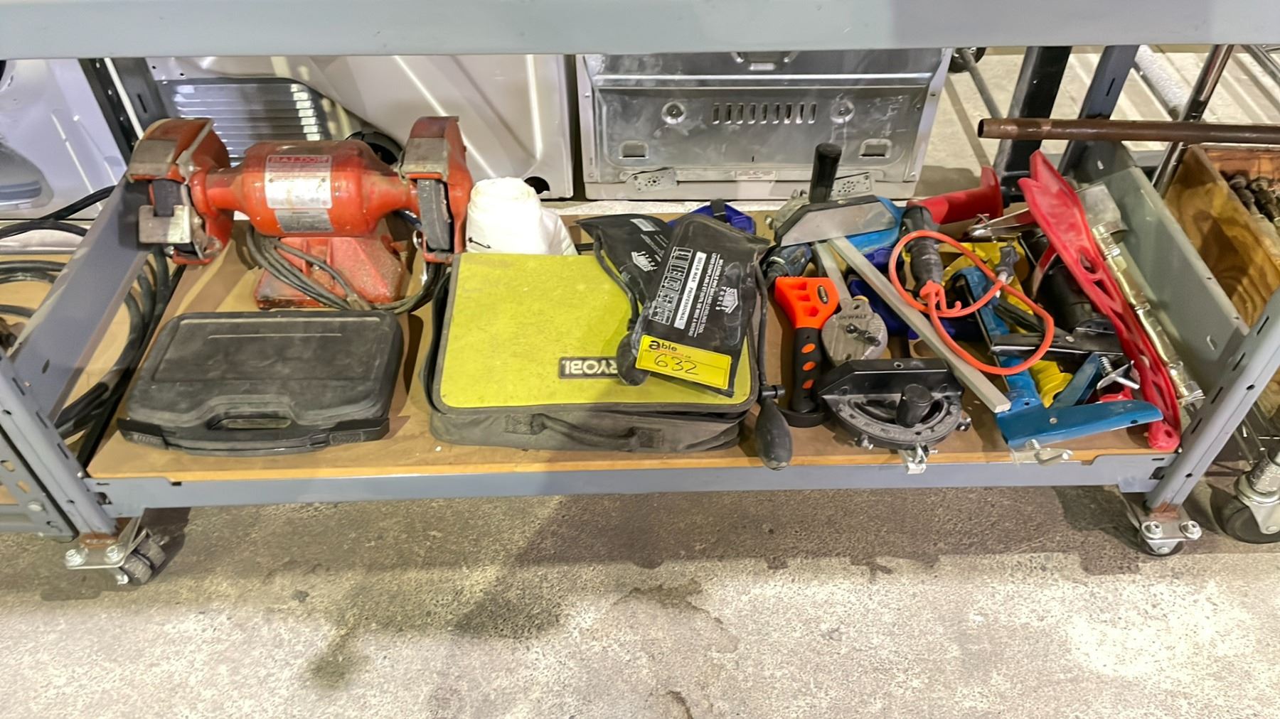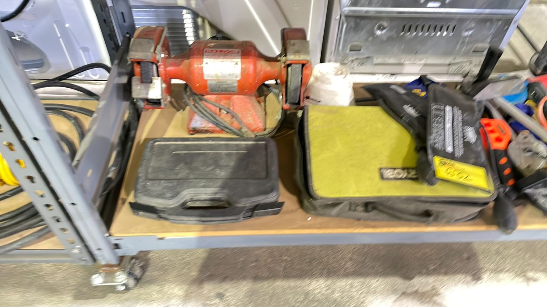 SHELF OF BALDOR GRINDER BUFFER, CLAMPS, AND MORE