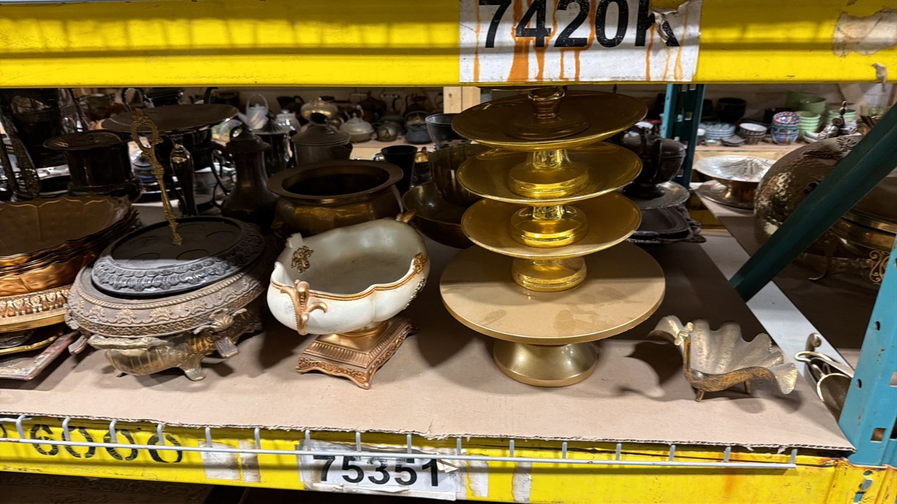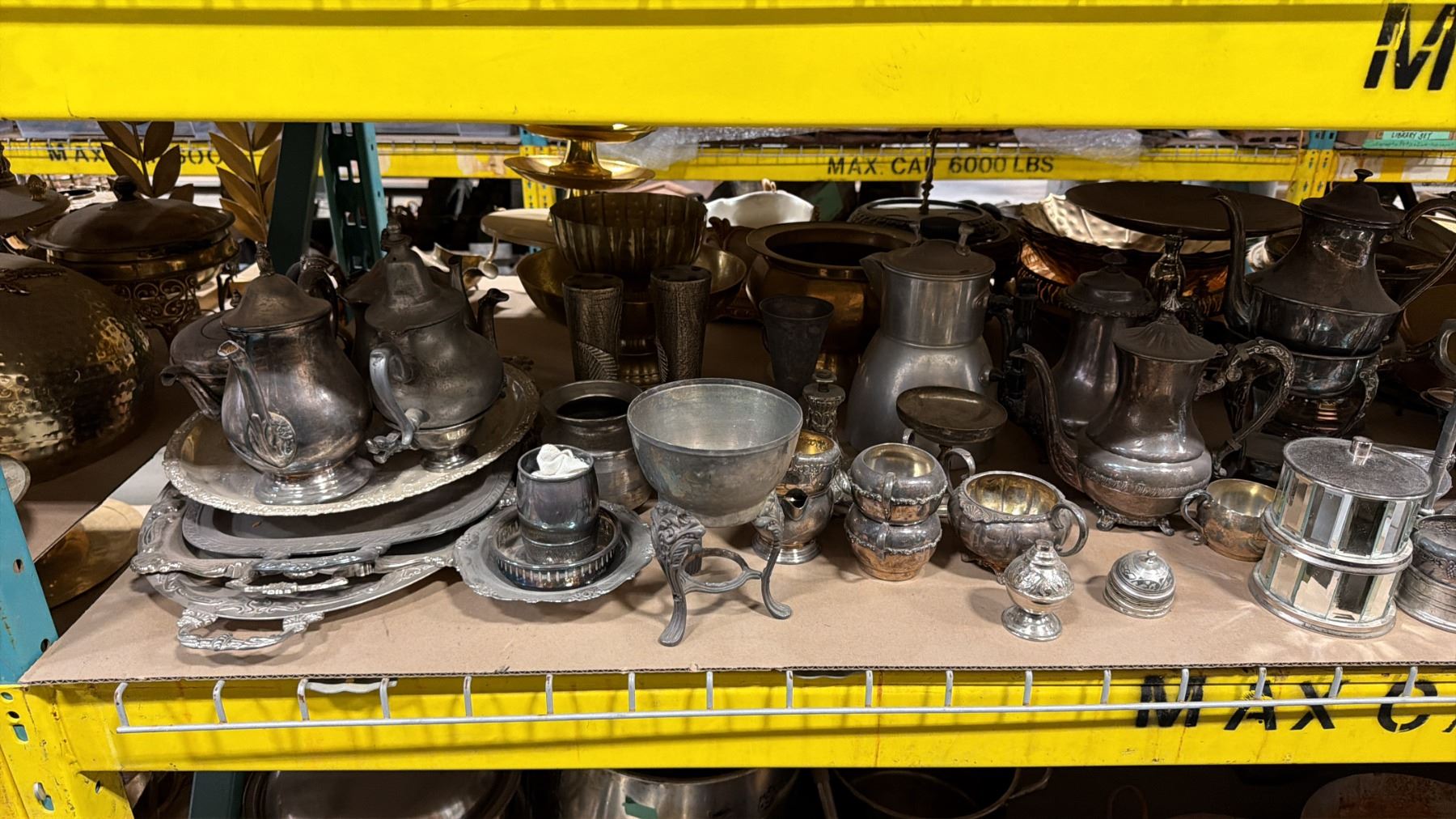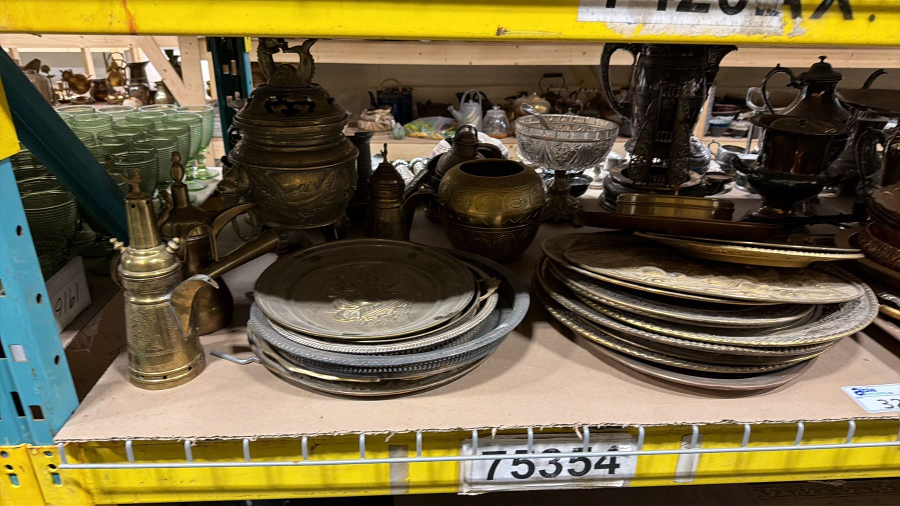 SHELF OF BRASS SERVING PLATTERS, SILVER TEA POTS, CUPS & MORE