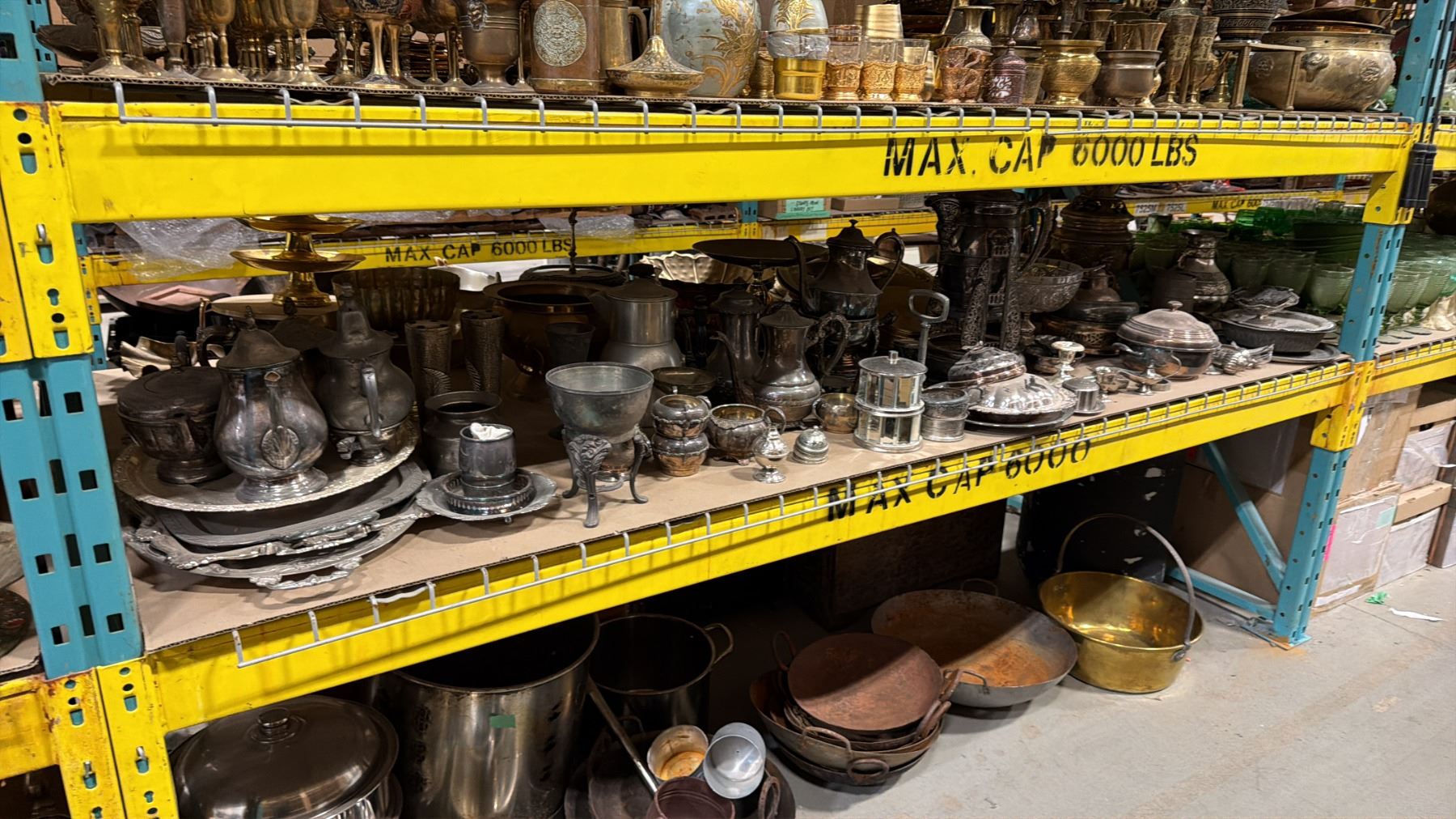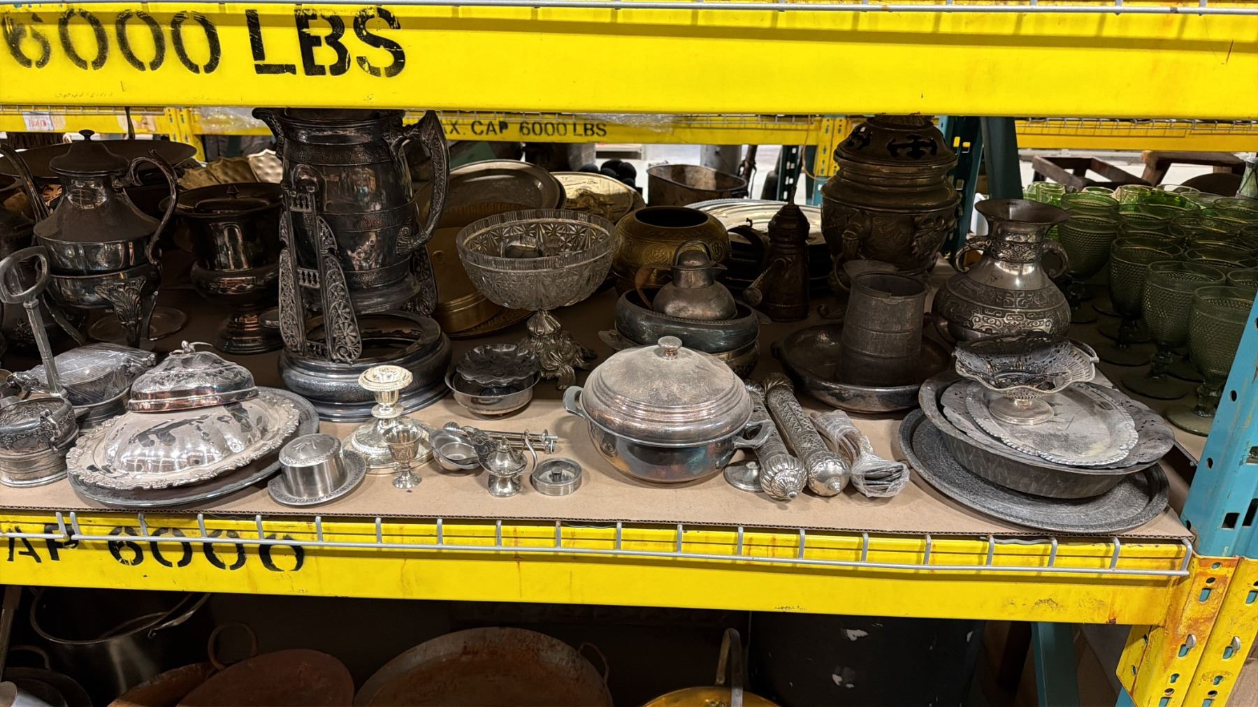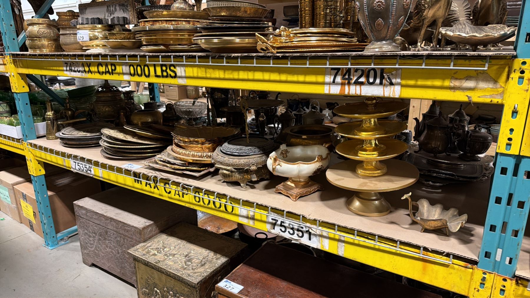 SHELF OF BRASS SERVING PLATTERS, SILVER TEA POTS, CUPS & MORE