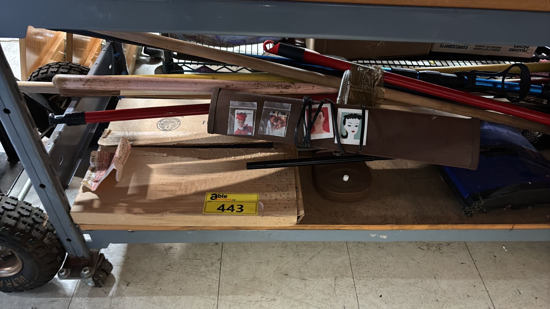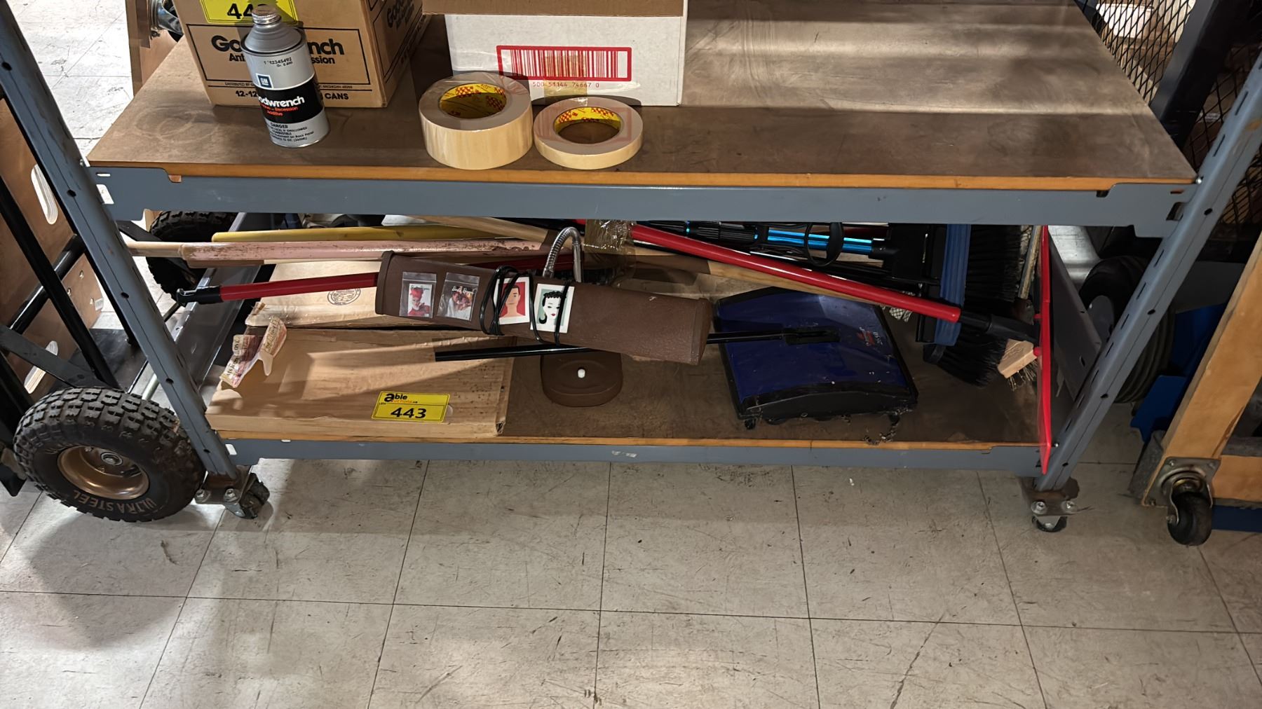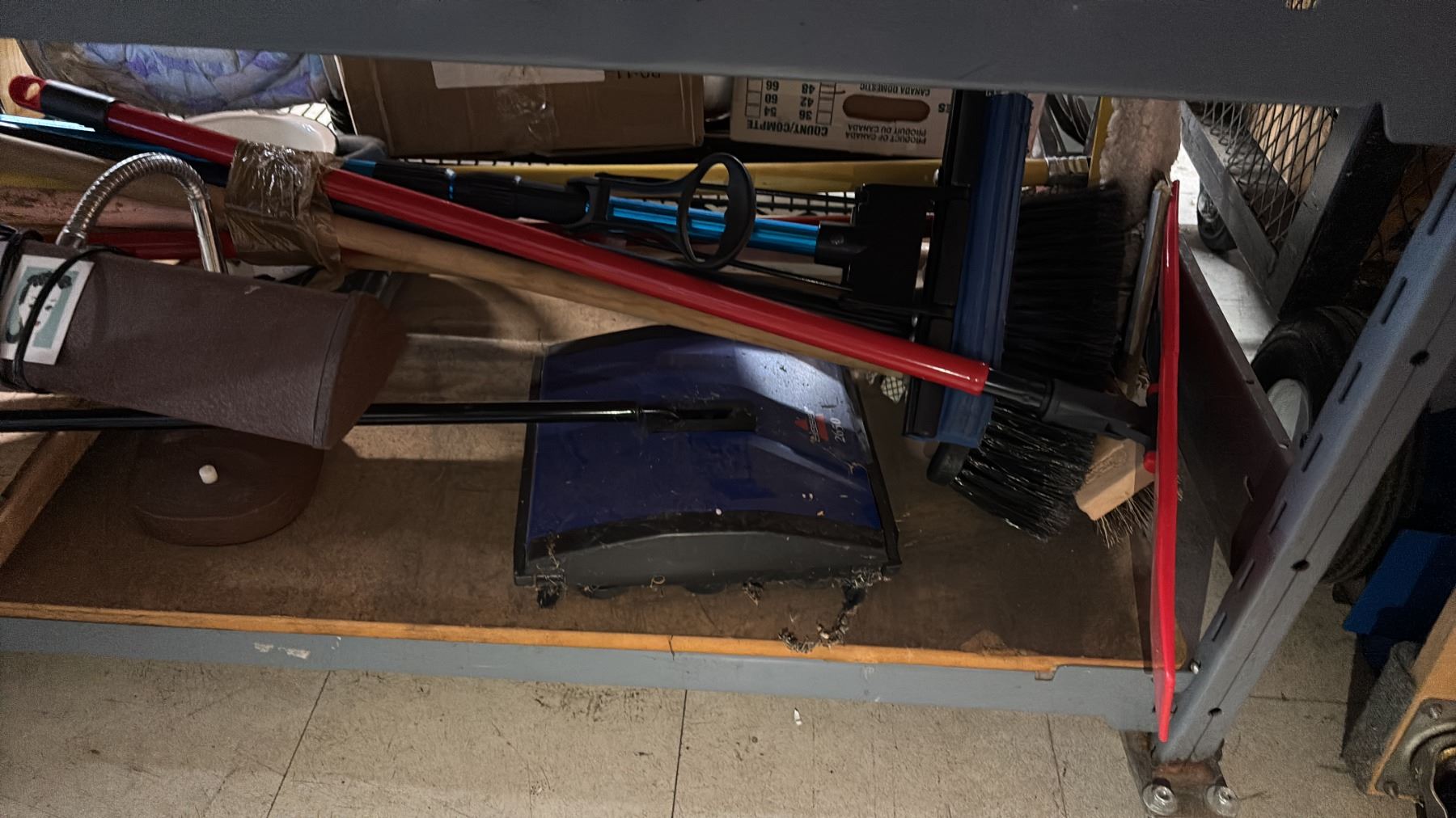 SHELF OF BROOMS, MOP HEAD, CARPET SWEEPER & MORE