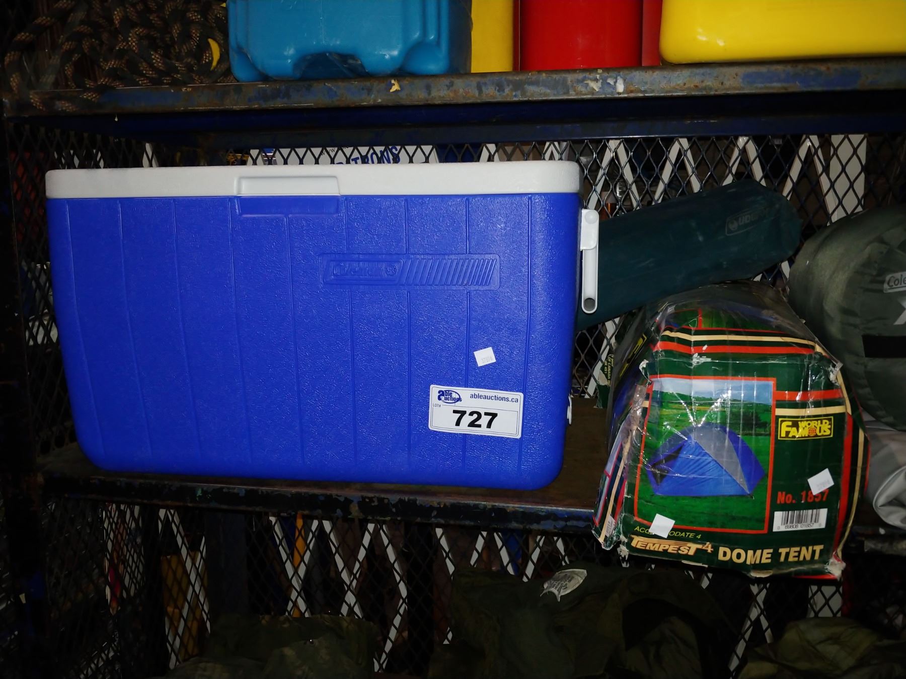 SHELF OF CAMPING GEAR INCLUDING COLEMAN COOLER, SLEEPING BAGS AND MORE