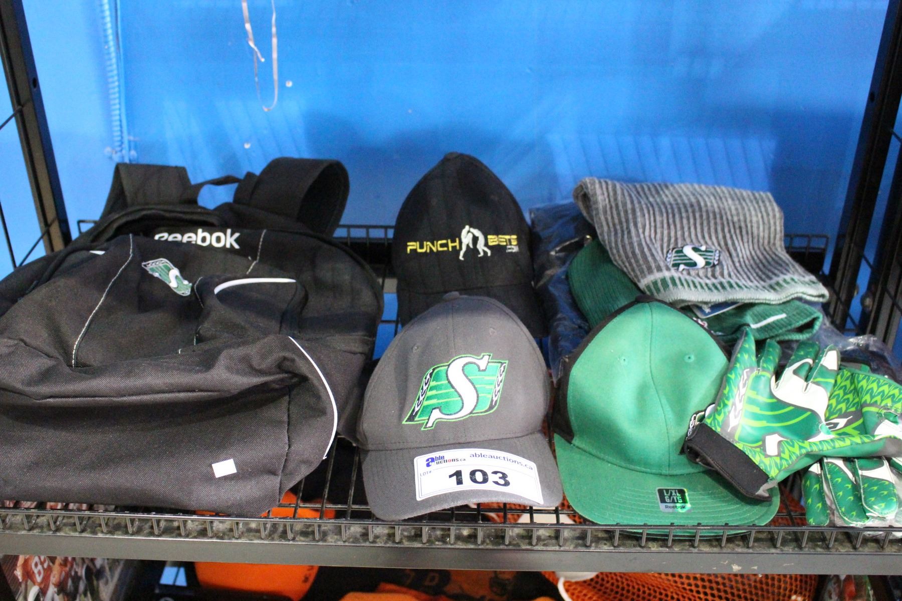 SHELF OF CLOTHING OWNED BY BC LIONS PLAYER TIM CRONK - GLOVES, HATS, BACKPACK, AND MORE
