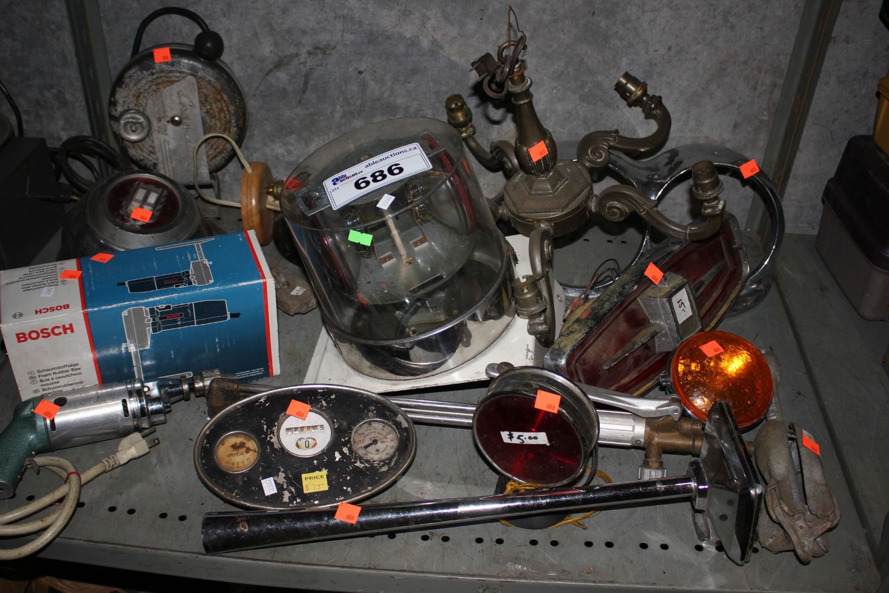 SHELF OF COLLECTABLES INCLUDING AUTO PARTS AND MORE
