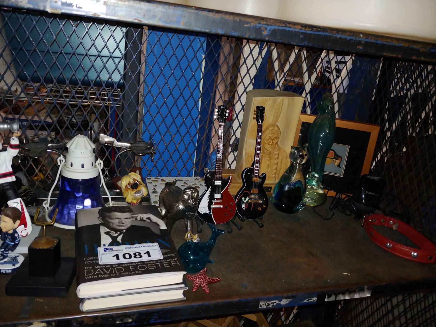 SHELF OF COLLECTIBLES INCLUDING HOCKEY FIGURES, BEACH DECOR, BOOKS AND MORE