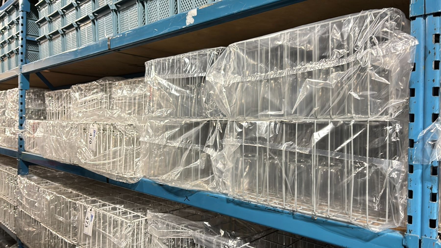 SHELF OF COMMERCIAL RESTAURANT STEMMED WATER GLASSES, PILSNER BEER GLASSES & JUICE GLASSES *TRAYS INCLUDED* ( APPROX. 200 PCS )