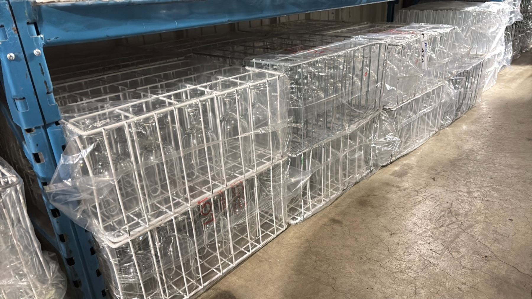 SHELF OF COMMERCIAL RESTAURANT TRAYS OF STEMMED WATER GLASSES & JUICE DECANTERS *TRAYS INCLUDED* ( APPROX. 180 PCS )