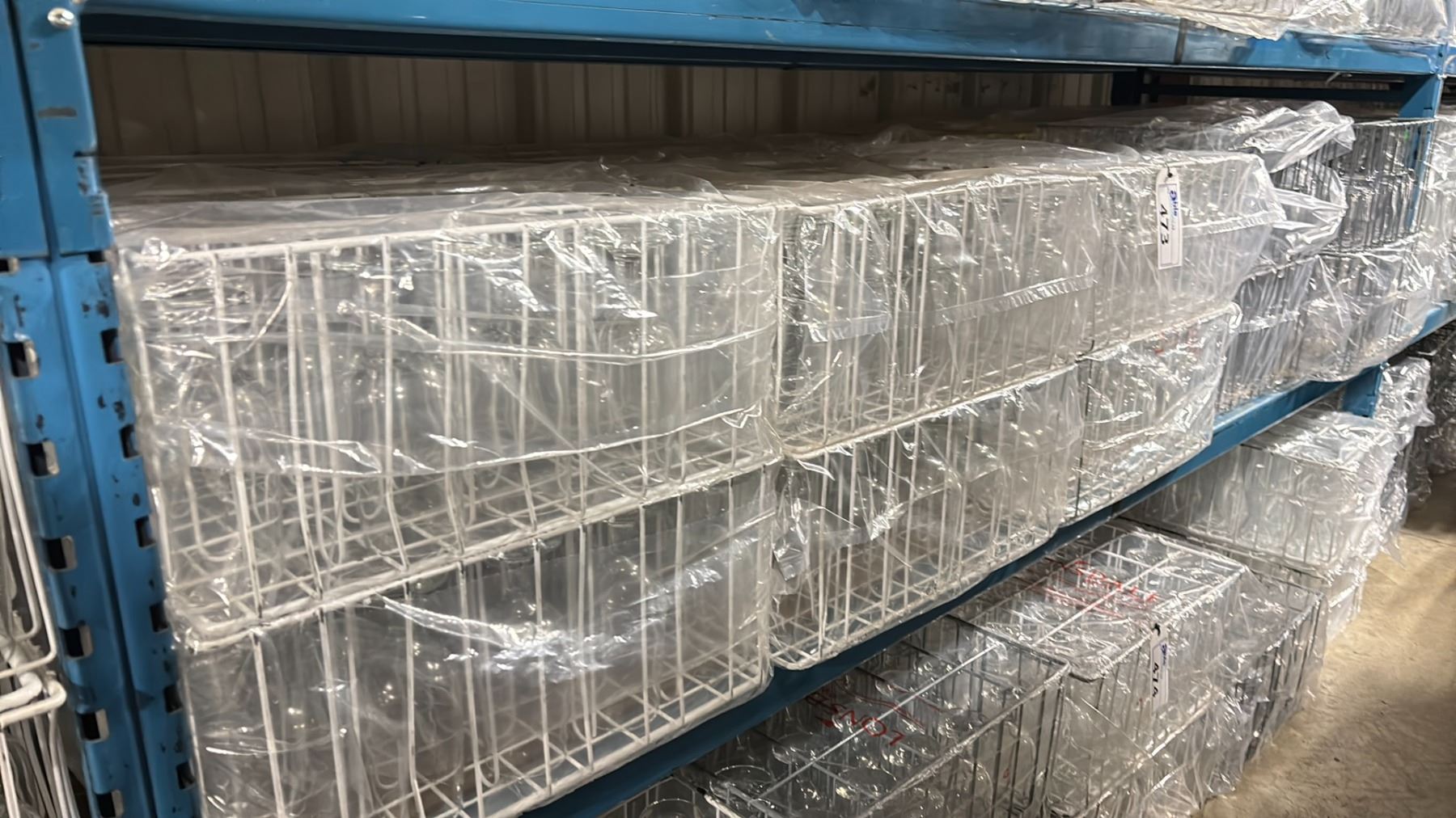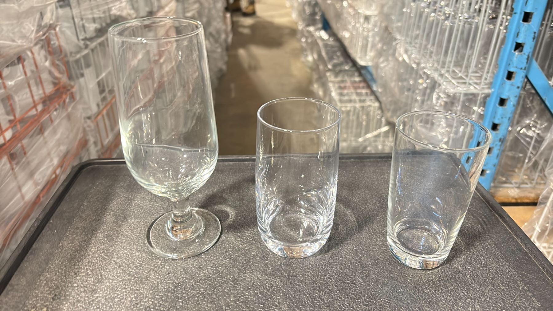 SHELF OF COMMERCIAL RESTAURANT TRAYS OF STEMMED WATER GLASSES & JUICE GLASSES *TRAYS INCLUDED* ( APPROX. 200 PCS )
