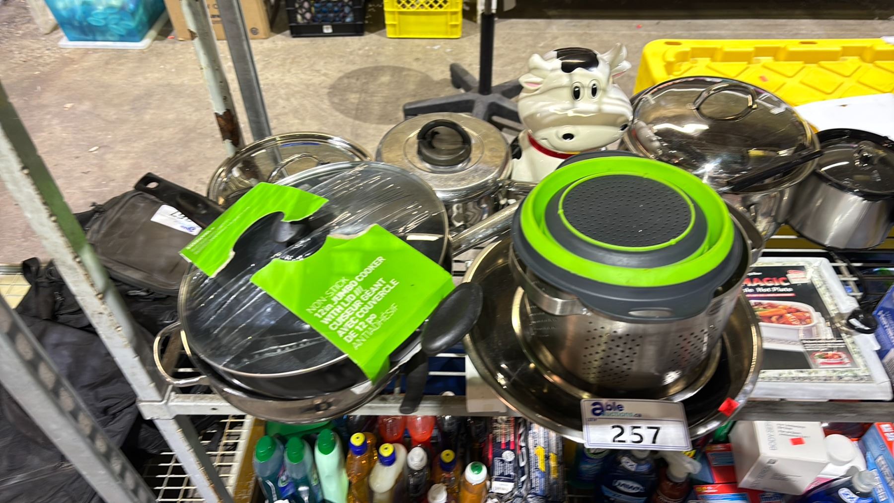 SHELF OF COOKING POTS/PANS, COLANDERS, TOASTER OVENS, INDIVIDUAL BLENDER, COOKIE JAR & MORE