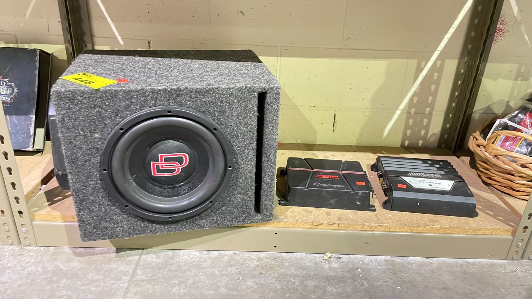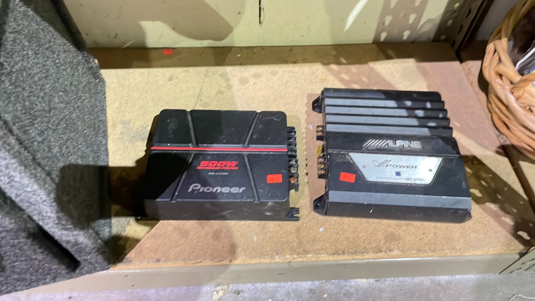 SHELF OF DD AUDIO 10" SUBWOOFER WITH SONY XPLOD AMPLIFIER, PIONEER 500W AMPLIFIER & ALPINE V-POWER AMPLIFIER