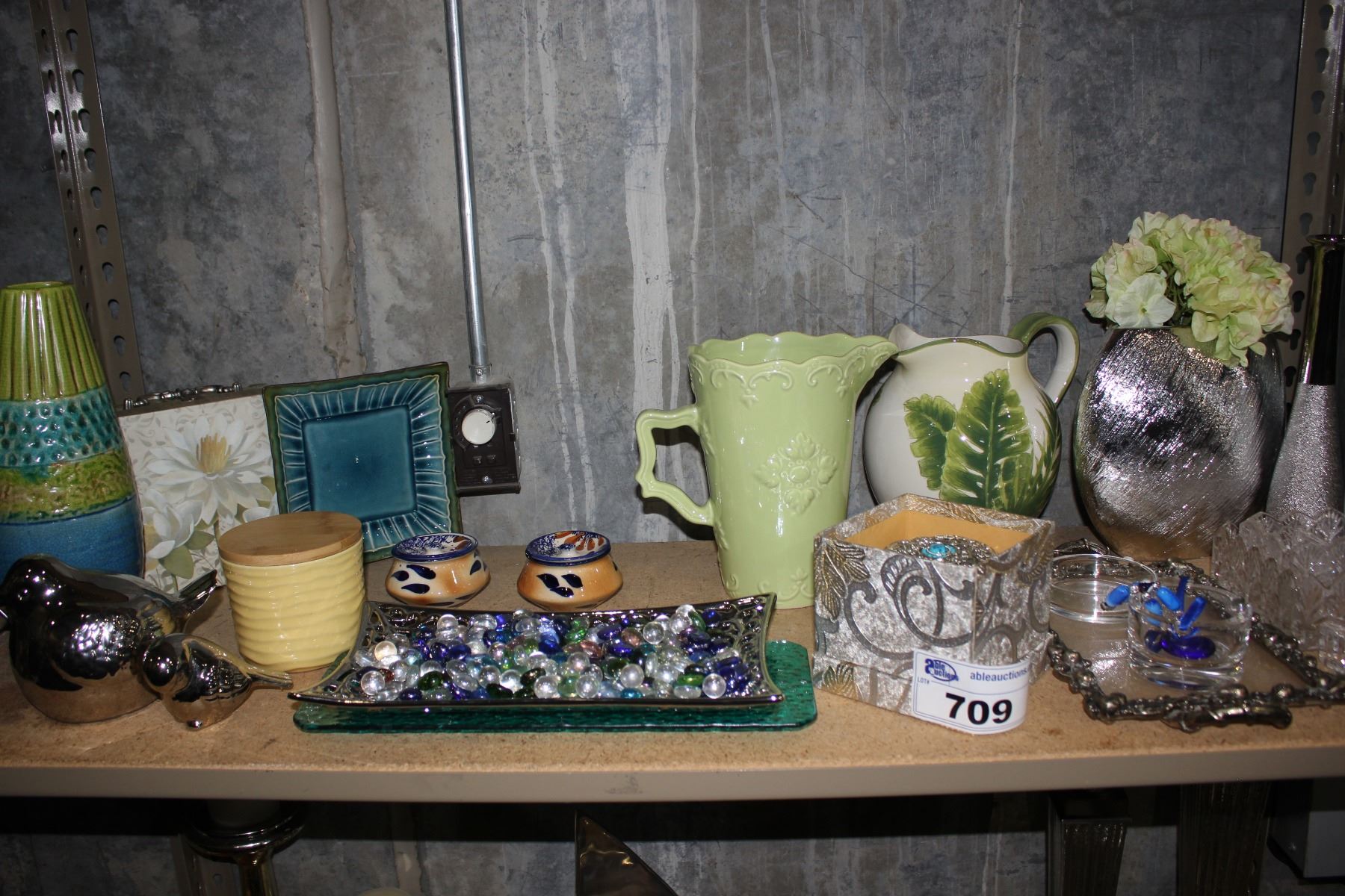 SHELF OF DECOR INCLUDING VASES, ASHTRAYS, TRAYS AND MORE