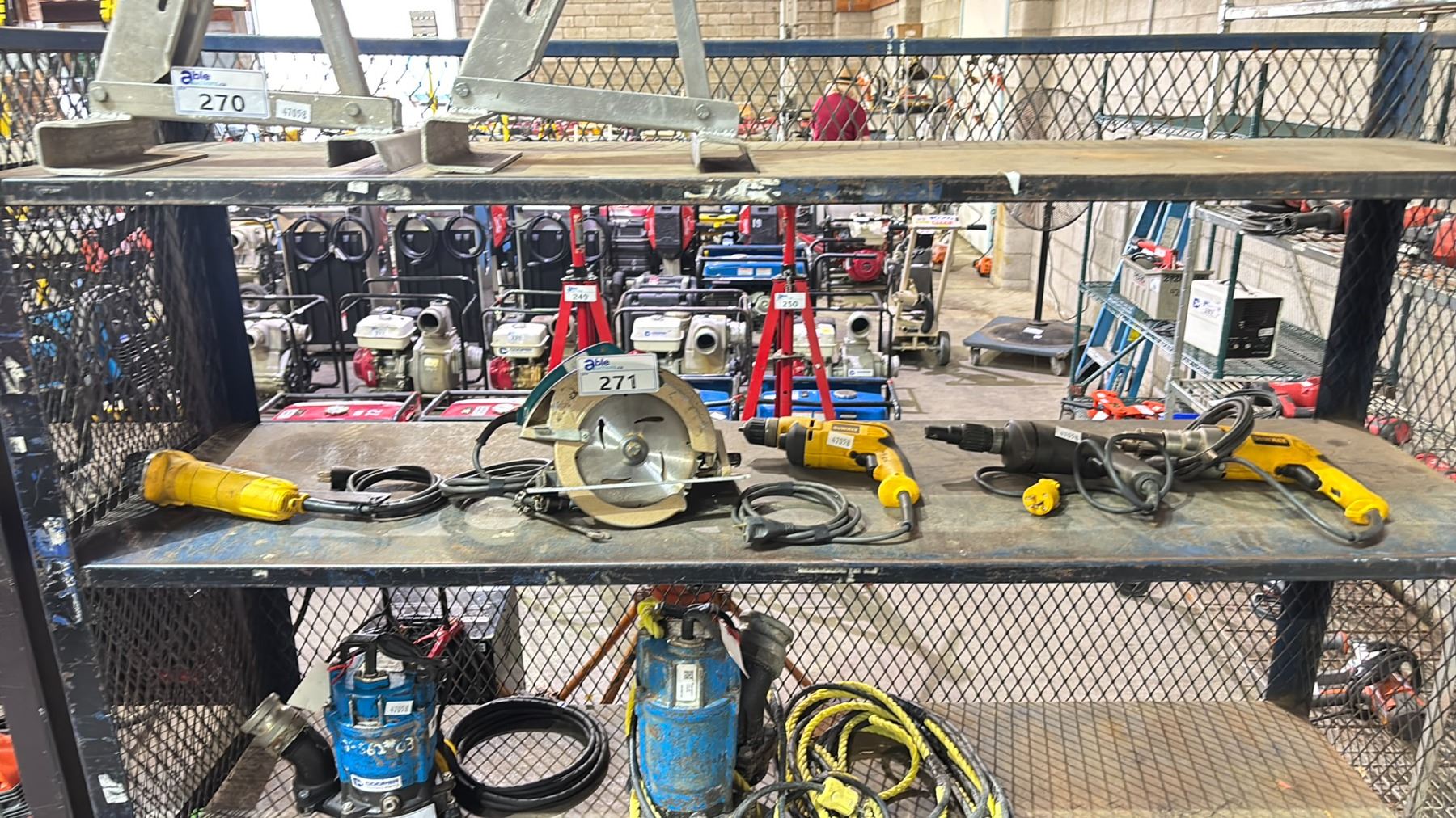 SHELF OF DEWALT ANGLE GRINDER, MAKITA CIRCULAR SAW, DEWALT 3/8" DRILL & OTHER TOOLS