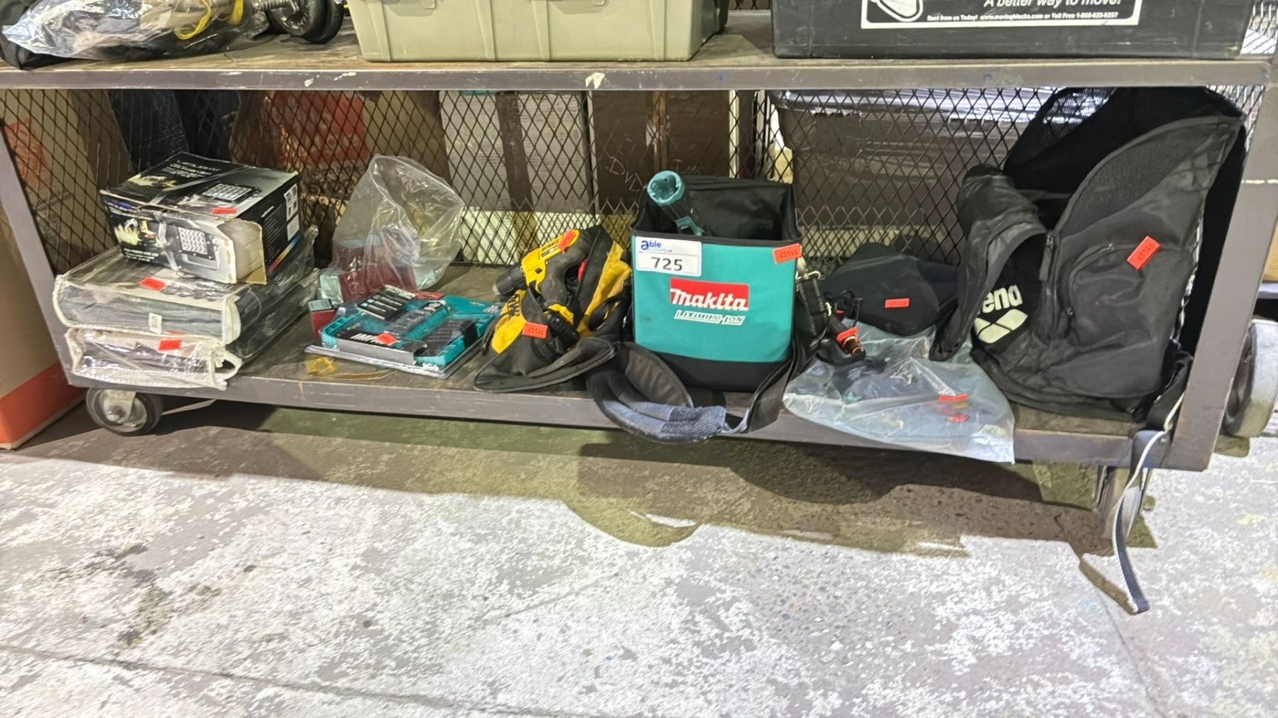 SHELF OF DEWALT CORDLESS DRILL, MAKITA IMPACT BIT SET, LED WORK LIGHT AND MORE