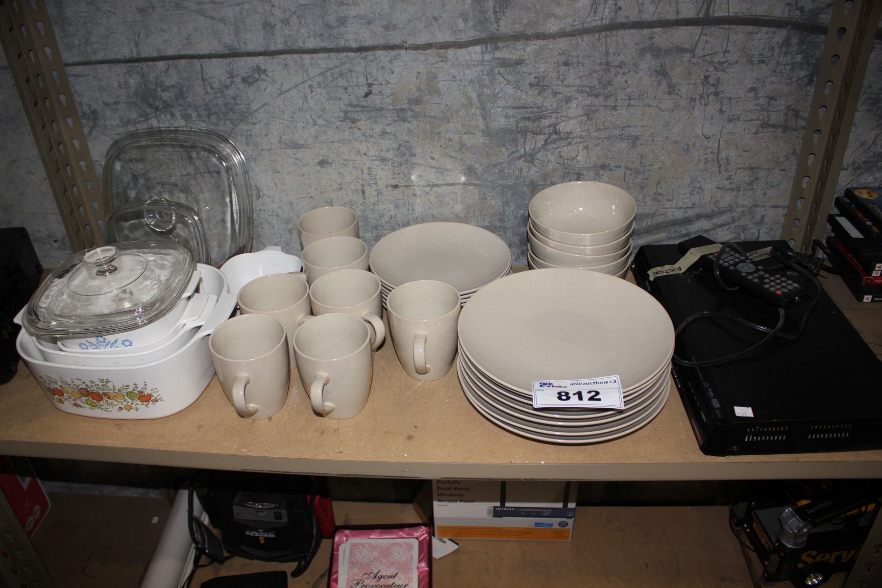 SHELF OF DISHWARE, DVD PLAYER AND MORE