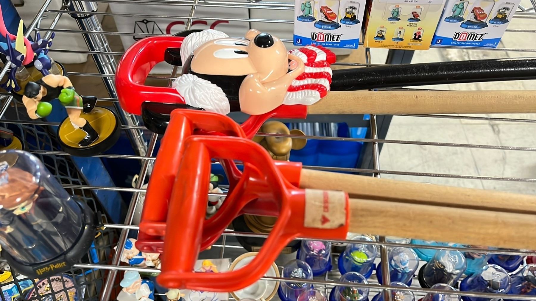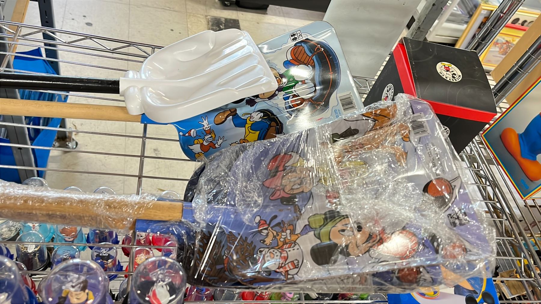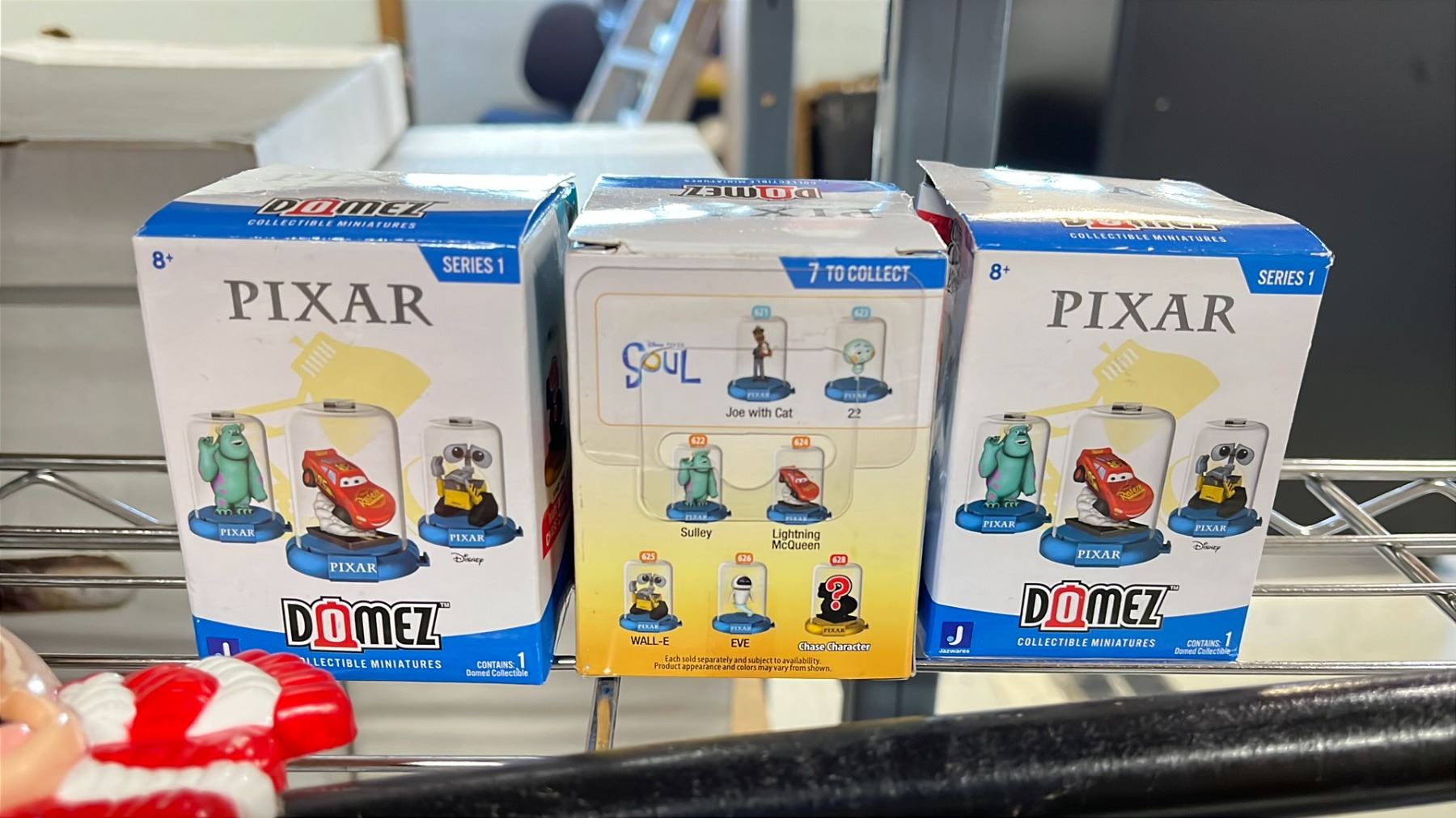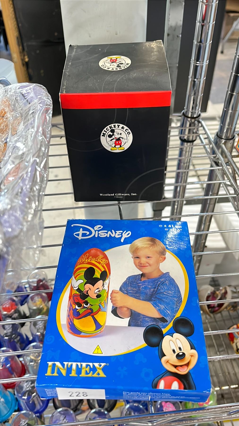 SHELF OF DISNEY COLLECTIBLES - ASSORTED DOMEZ FIGURES, DISNEY CHILDRENS SHOVELS, MICKEY INFLATABLE, DRIVE IN MINNIE + MICKEY SNOW GLOBE & MORE