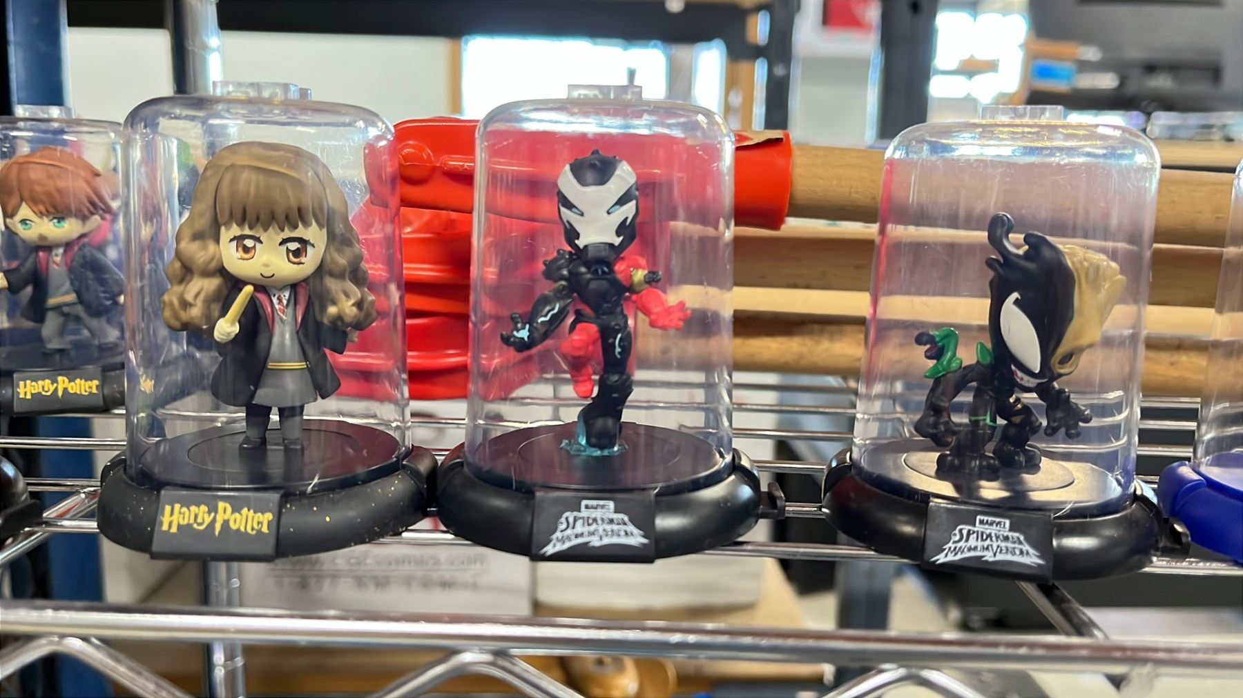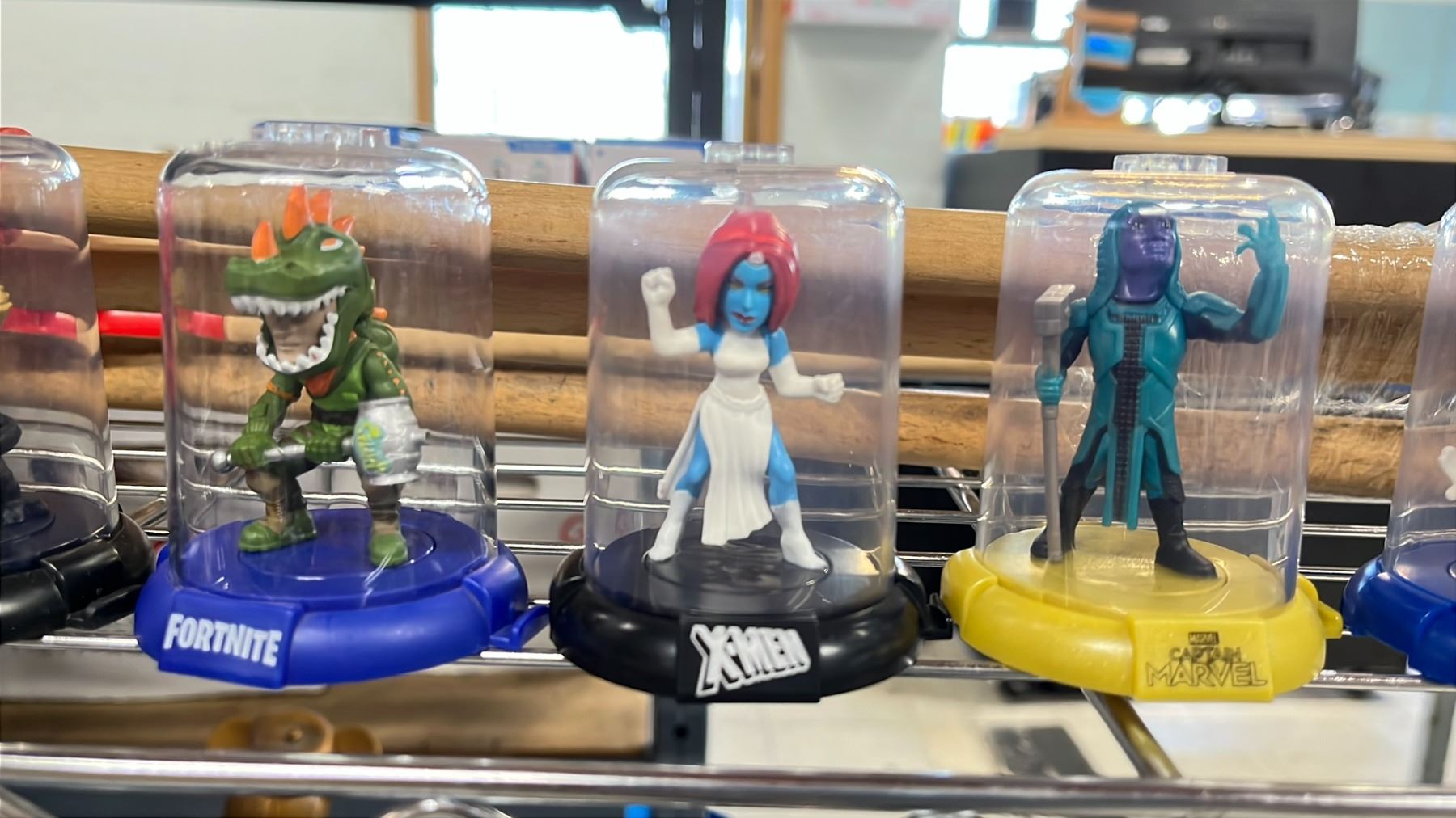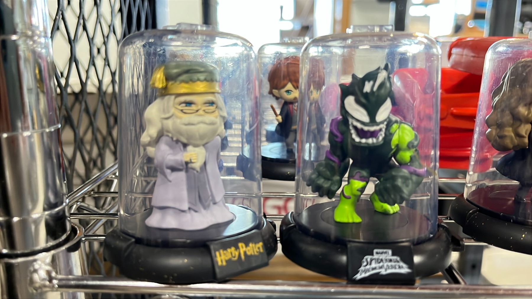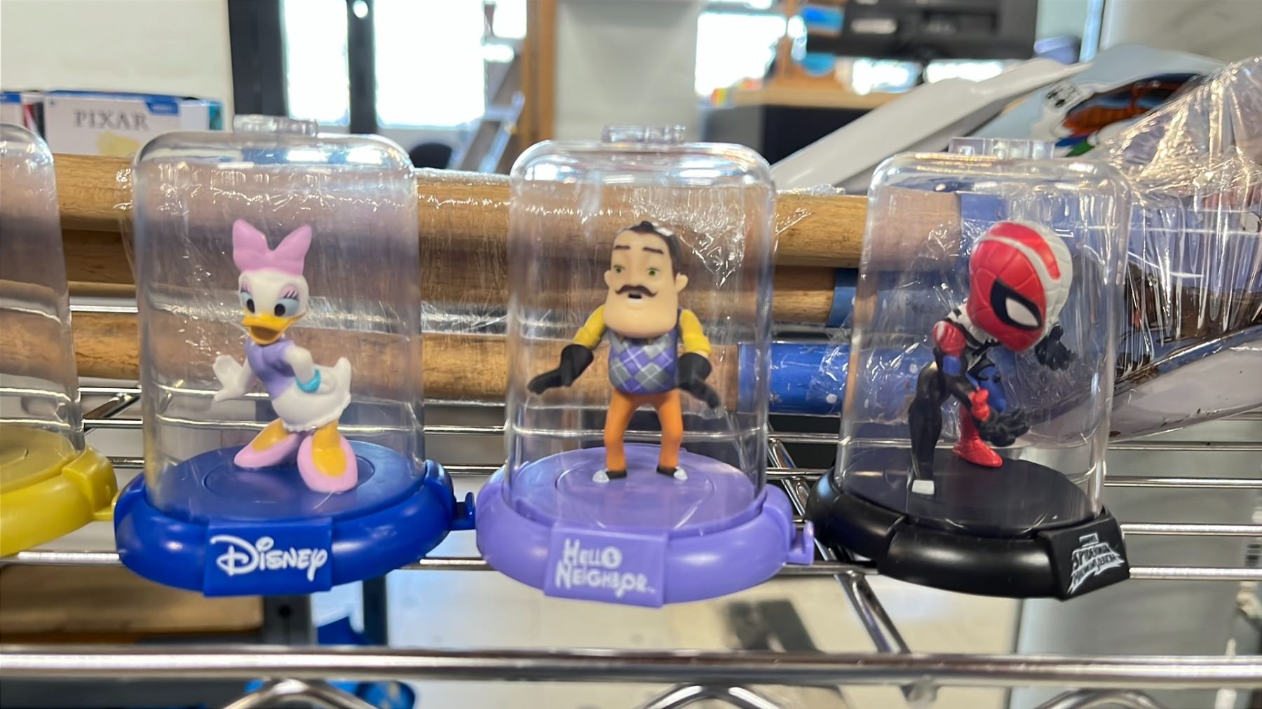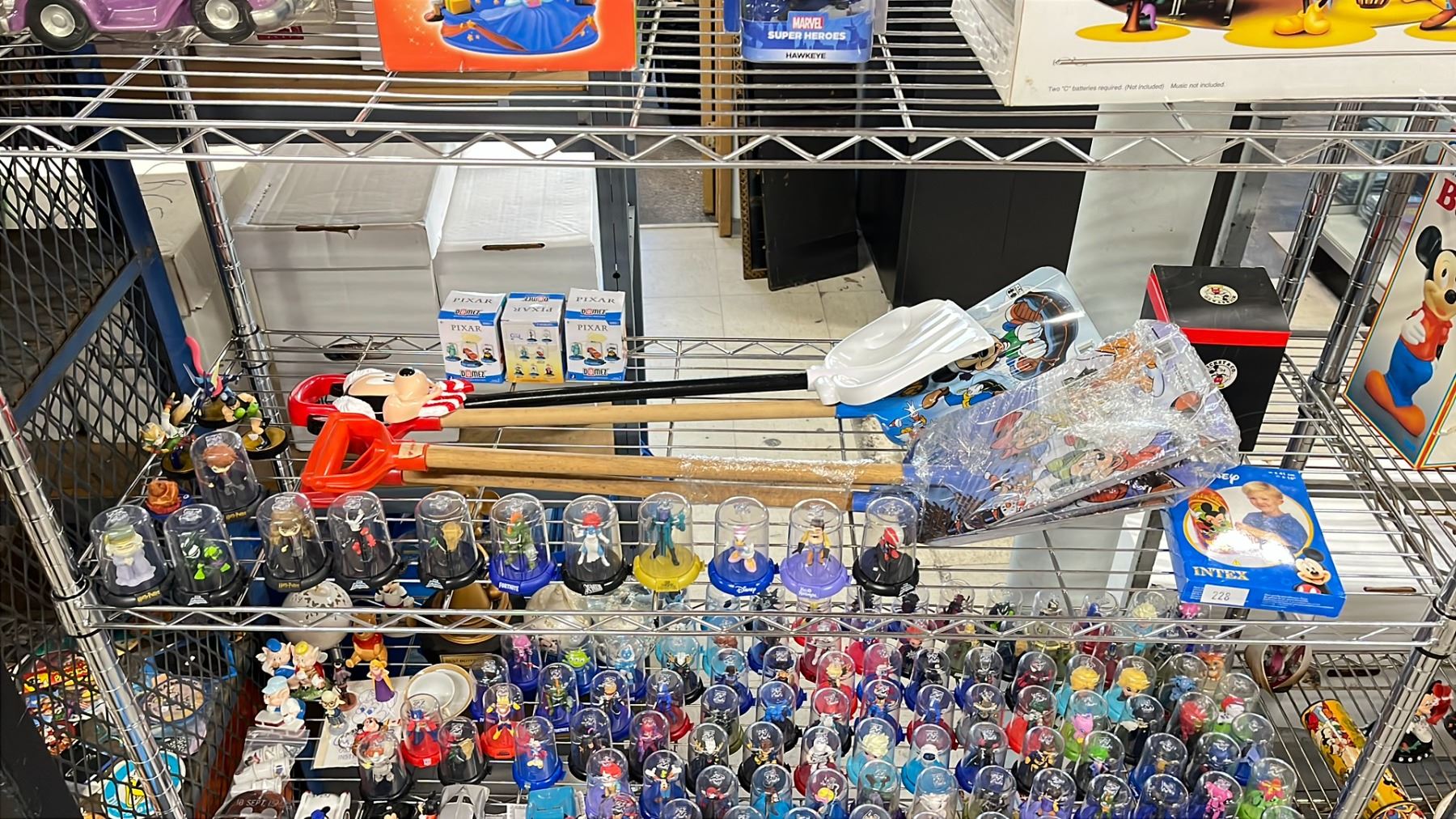 SHELF OF DISNEY COLLECTIBLES - ASSORTED DOMEZ FIGURES, DISNEY CHILDRENS SHOVELS, MICKEY INFLATABLE, DRIVE IN MINNIE + MICKEY SNOW GLOBE & MORE