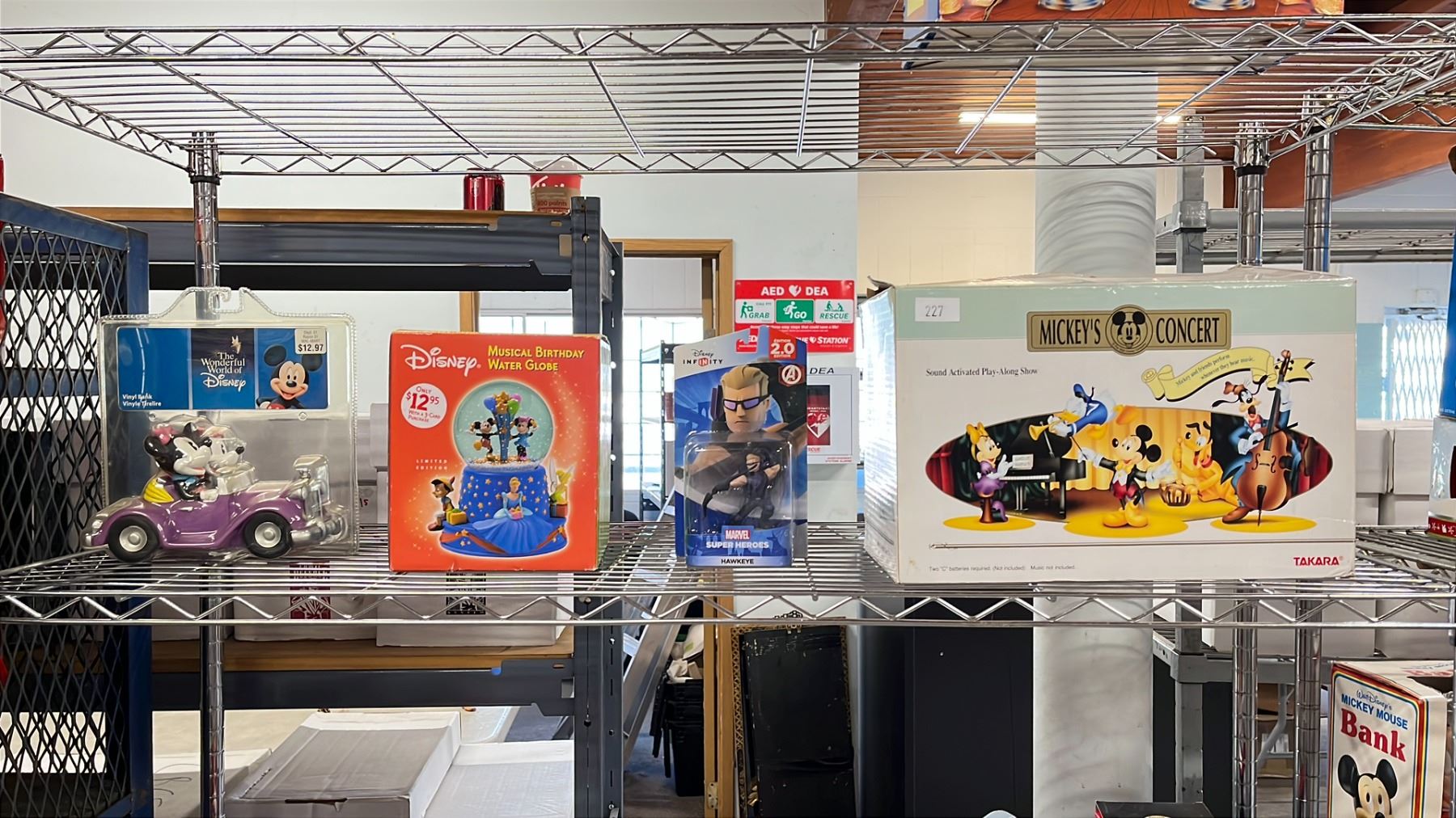SHELF OF DISNEY COLLECTIBLES - MICKEYS CONCERT SOUND ACTIVATED PLAY ALONG SHOW, HAWKEYE FIGURINE, MUSICAL BIRTHDAY WATER GLOBE & MICKEY + MINNIE VINYL BANK
