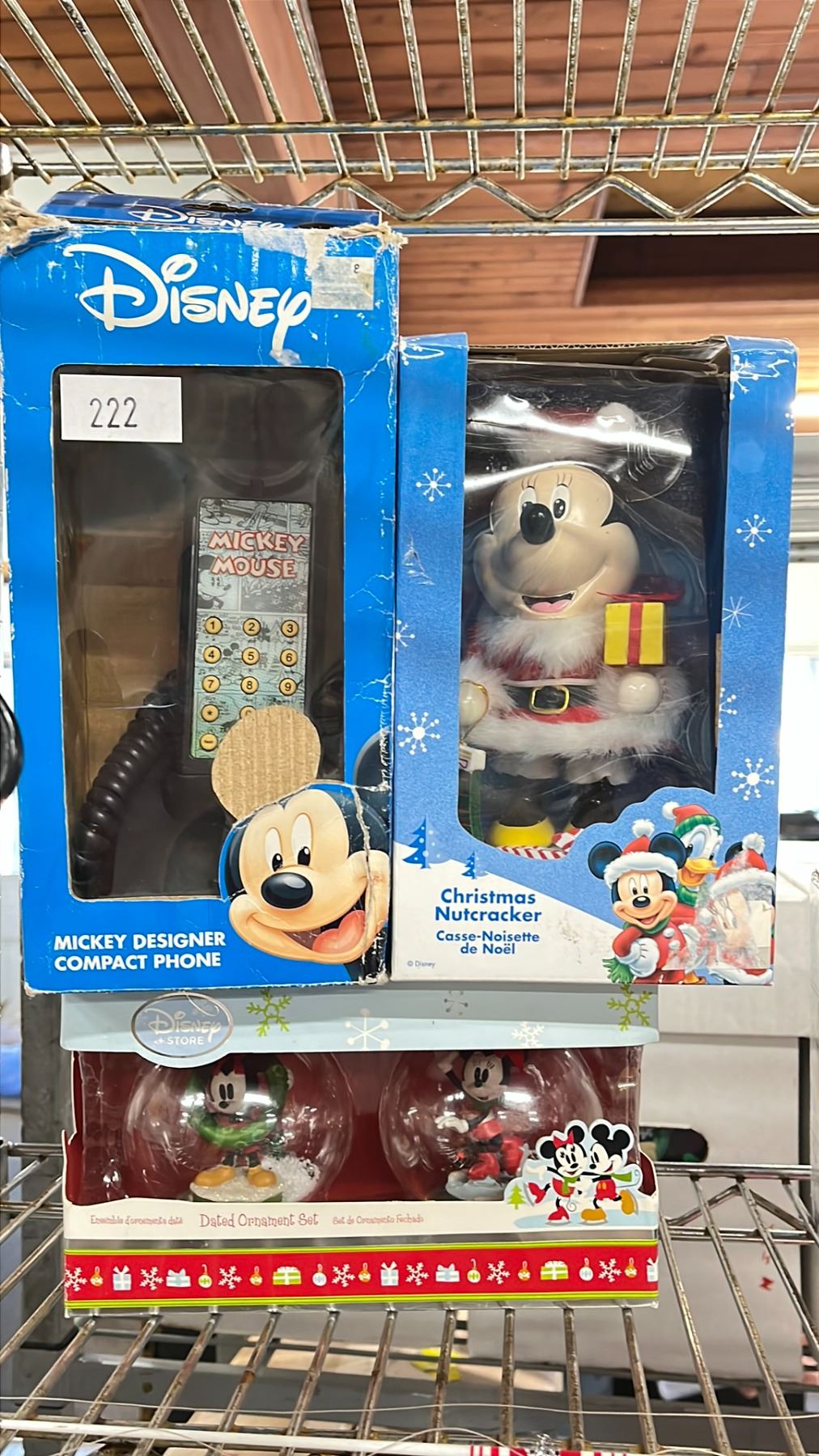 SHELF OF DISNEY COLLECTIBLES - MINNI DOING LAUNDRY FIGURINE, STEAMBOAT WILLIE BOX, SALT + PEPPER SHAKERS, CHRISTMAS NUTCRACKER, ORNAMENTS & MORE
