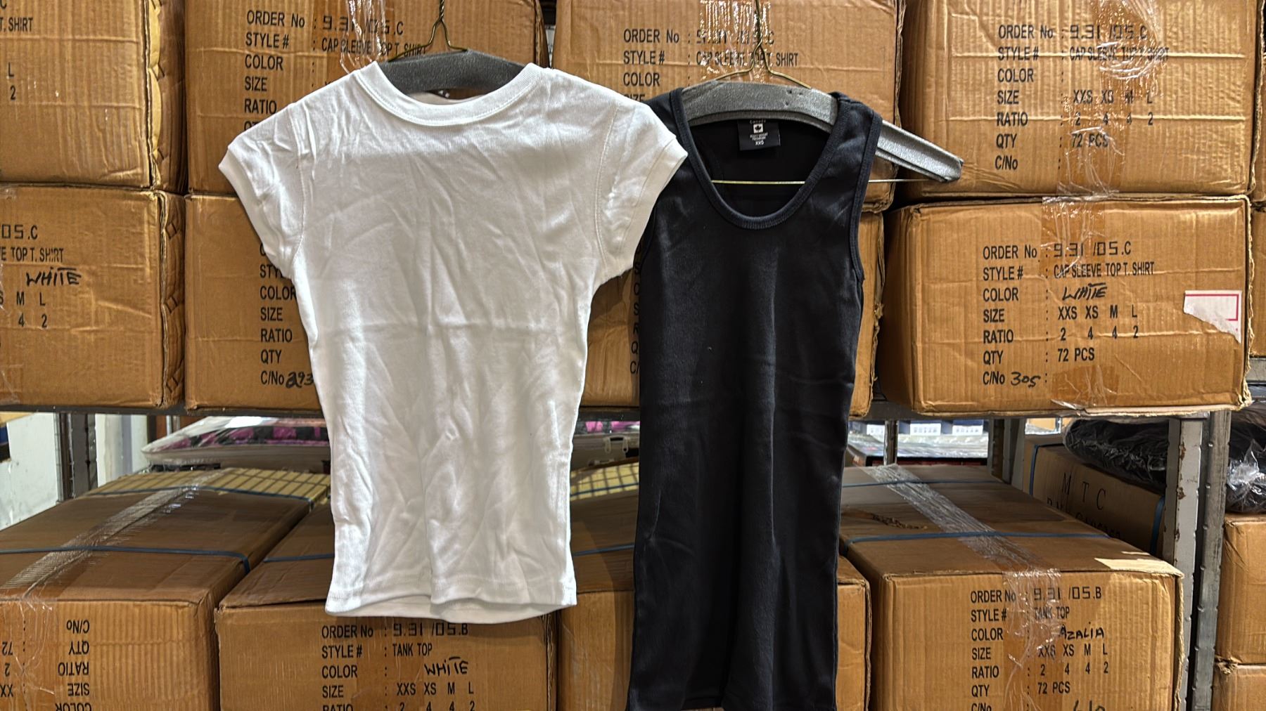 SHELF OF EXTRA EXTRA SMALL, EXTRA SMALL, MEDIUM & LARGE TANK TOPS/ T SHIRTS IN ASSORTED COLORS
