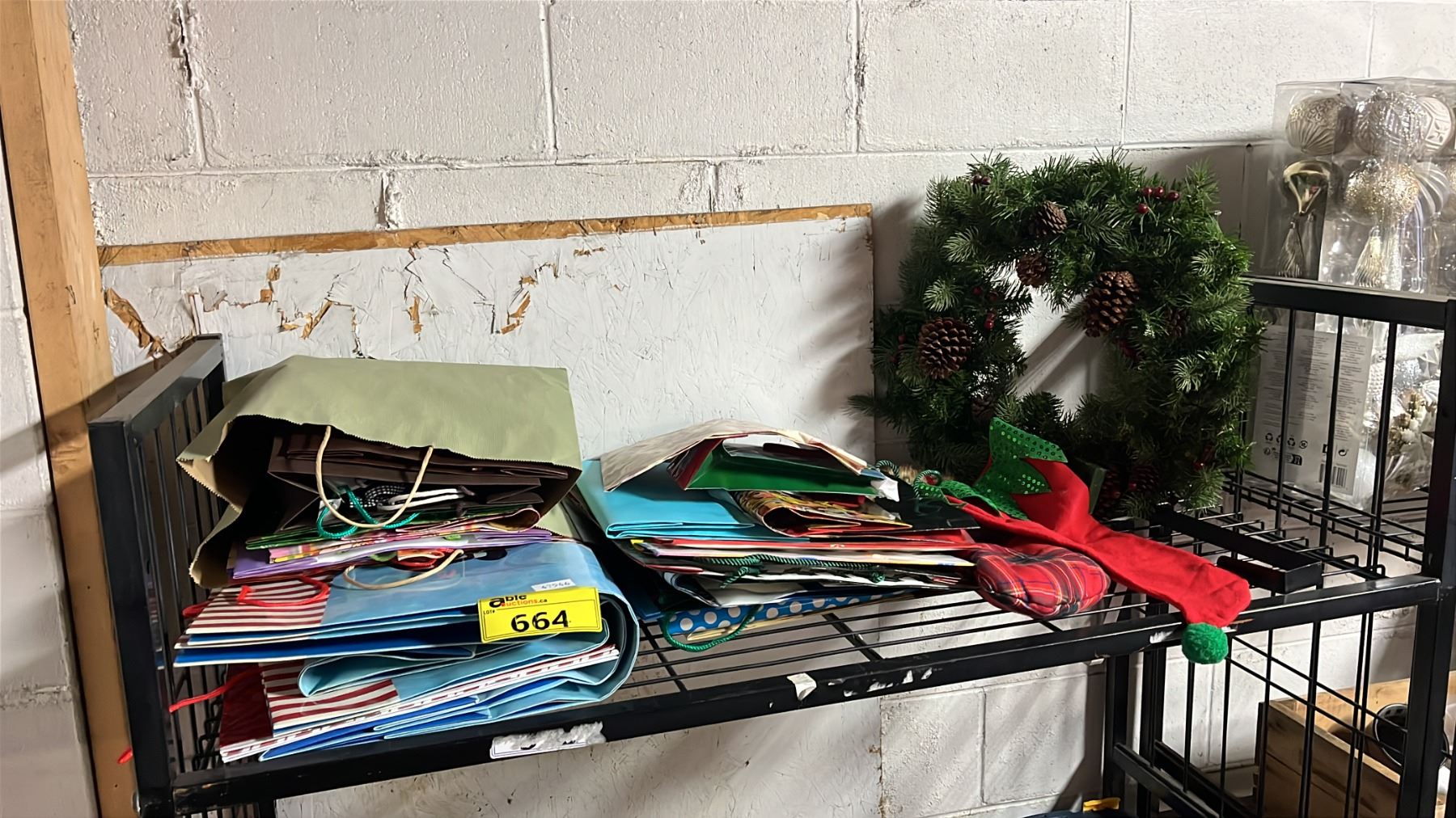 SHELF OF GIFT BAGS & A CHRISTMAS WREATH