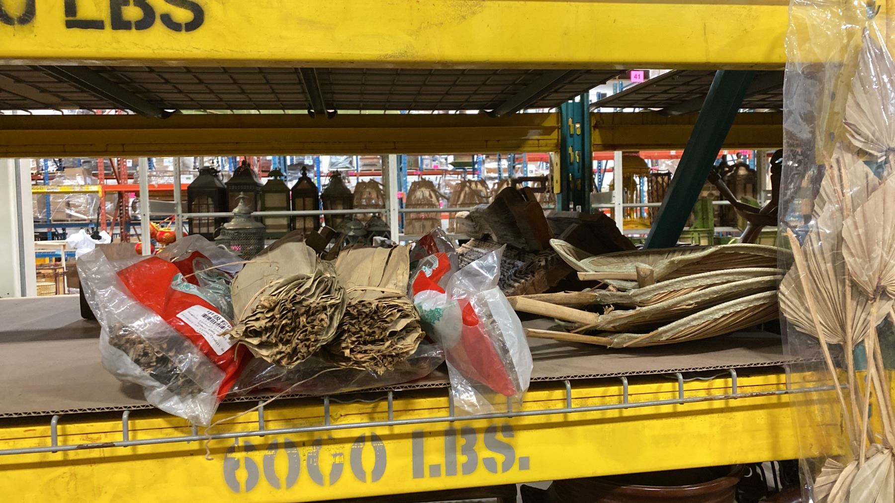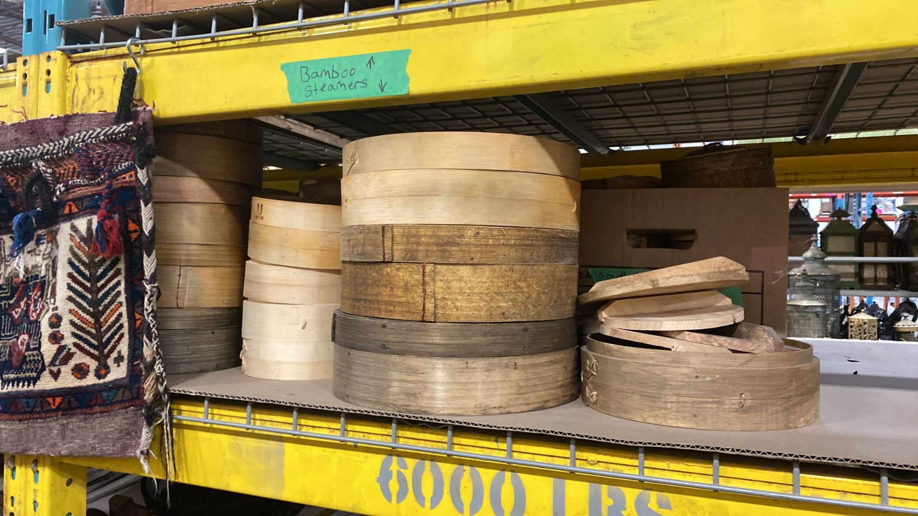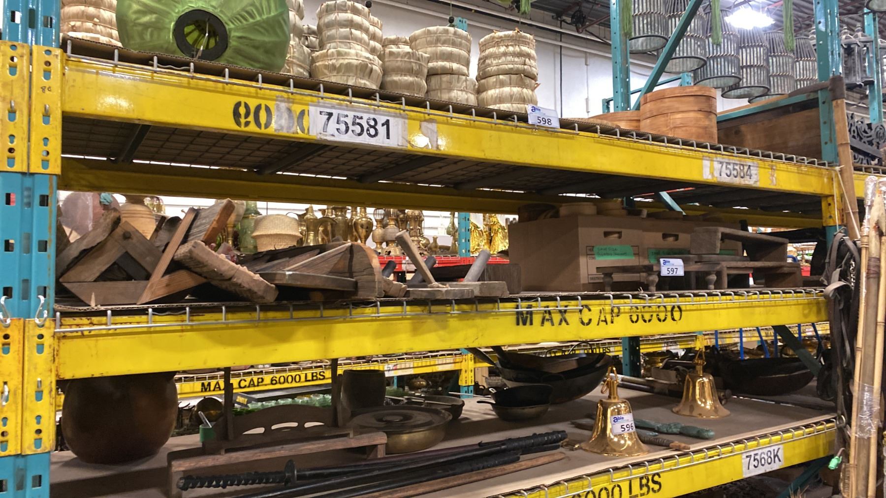 SHELF OF HANGING CHINESE LANTERNS & DECORATIVE BASKETS