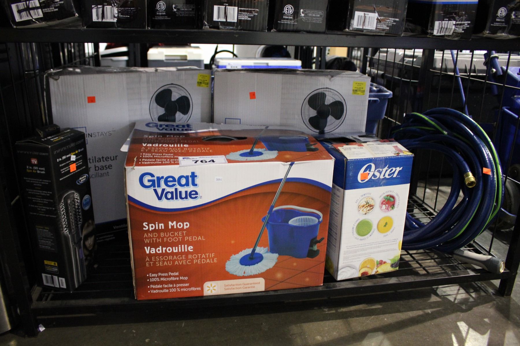 SHELF OF HOME ITEMS INCLUDING 2 FANS, SPIN MOP, BLENDER, HOSE, AND MORE