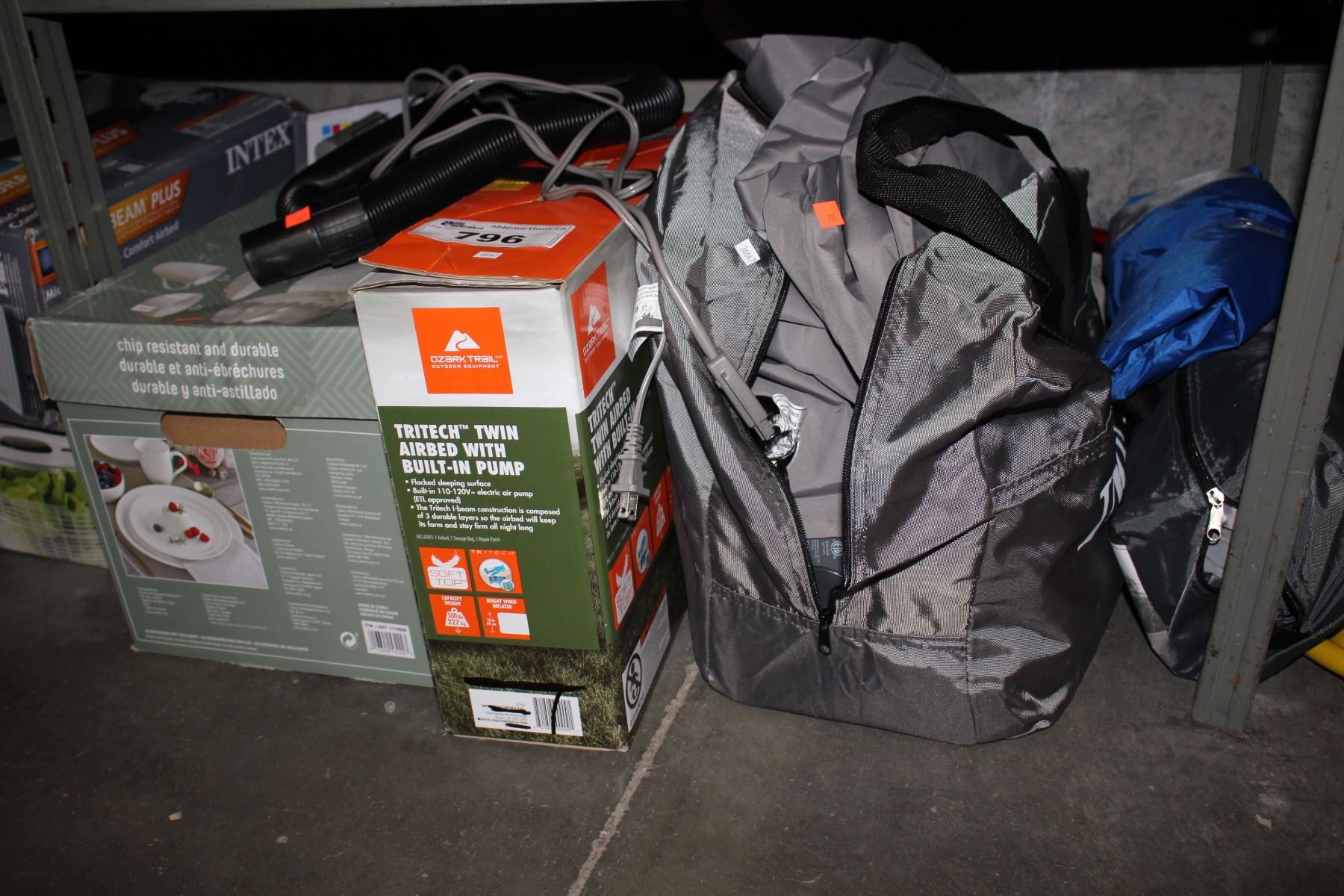 SHELF OF HOME ITEMS INCLUDING AIRBEDS, TENT, AND MORE